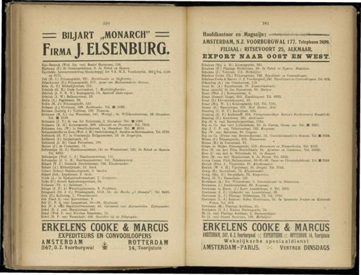 Gebruik tekstcoördinaten Transcriptie 380 381 = BILJART „ MONARCH " .== Firma J . ELSENBURG . Eps-Reerink (" Wed . Jac . van ) Koelof Hartstraat , 138 . Epskamp ( J .) 2e Oosterparkstraat , 9 . In Tabak en Sigaren . Equitable . Levensverzekering-Maatschappij der V.S . N . Z . Voorburgwal , 262.«Tel . , 2120 en 9172 . Erb ( H . J .) Prinsengracht , 981 . Meubelmaker en Stoffeerder . Erbachweler ( H .) Prinsengracht , 657 . Agent van Buitenlandsche Huizen . Erbe ( L . E .) Bilderdijkstraat , 151 . Erbrink ( G . H .) Oude Looierssloot , 1.Meubelstoffeerder . Erbrink ( J . F . G . W .) Rozengracht , 14 . Rustend Onderwijzer . Erbrink ( J . W .) Bellamystraat , 53 . Erdin ( A .) Fagelstraat , 98 . Erdin ( H . J .) Prinsengracht , 516 . Erdman ( J .) Overtoom , 328 . Boekhouder . Tel . 5K 3890 . Erdman ( Ludwig J .) Tolstraat , 130 . Tuinman . Erdmann ( H . L .) van Woustraat , 141 . Werkpl .: St . Willibrordusstraat , 59 . Stucadoor . Tel . ' M . 2163 . Erdmann ( J . E .) 2e van der Helststraat , 2 . Stucadoor . Tel . ' Mt 1096 . Erdmann ( R . H .) Keizersgracht , 369 . Advocaat en Procureur . Tel . 7852 . Erdmann Azn . ( W .) Ie Sweelinckstraat , la . Stucadoor . Tel . X 2614 . Erdmansdörffer en Zoon (" Wed . J . M .) Geelvinksteeg , 6 . Smeden en Slotenmakers . Tel . 3735 . Erdtsieck ( H . E .) Ie Constantijn Huijgensstraat , 19 . In Drogerijen . ErdtBieck ( J .) Sarphatipark , 50 . Erdtsieck ( J . H .) Czaar Peterstraat , 190 . Erenst ( J .) da Costastraat , 12 . Erftemeijer ( G . J .) Haarlemmerstraat , 141 en Westerstraat , 120 . In Tabak en Sigaren . Tel . 9863 . Erftemeijer ( Wed . G . J .) Haarlemmerstraat , 141 . Erftemeijer ( J . G . M .) Haarlemmerstraat , 141 . Tabakskerverij . , Erhard ( T . J .) Frederik Hendrikstraat , 198 . Kleedermaker . Erhart ( A .) Bilderdijkkade , 32 . Smid . Erhart ( Gebrs .) Onbekendegracht , 6 . Smeden . Erhart ( Joh .) Lepelstraat , 5 . Smid . Erich ( A .) Ie Egelantiersdwarsstraat , 7 . Loodgieter . Eriks ( O ) Groote Kattenburgerstraat , 34 . Eriksson ( Th . A .) Zeilstraat , 7 . Eringa ( J . P .) Ie Weteringplantsoen , 8 . Predikant . Eringaard ( Dr . J . C .) Prinsengracht , 1013 . Dir . der Bierbr . „' t Haantje ", Tel . 9490 . Erix ( C .) Kolksteeg , 1 . Vleeschhouwer . Erk ( Cord H . van ) Kalverstraat , 9 . Erk ( O P . S . van ) Langestraat , 94—96 . Hoefsmid . Erk ( P . J . vim ) Réguliersdwarsstraat , 43 . Carosserie voor Automobielen . Zijtuigmaker , Erkel ( E . J . van ) Marnixstraat , 385 . Erkel ( Wed . F . van ) Nicolaes Maesstraat , 75 . Erkel ( H . F . van ) Nassaukade , 446 . Opzichter bij de Telegraphic ERKELENS C00KE & MARCUS EXPEDITEURS EN C0NV00ILQ0PERS AMSTERDAM % ROTTERDAM 247,0 . Z . Voorburgwal W . 14 , ToerijStuin Hoofdkantoor en Magazijn : ■ w . r " ' . ■ - t-w , AMSTERDAM , N.Z . VOORBURGWAL 177 . Telephoon 26ft9J FILIAAL : RITSEVOORT 25 , ALKMAAR . EXPORT NAAR OOST EN WEST . Erkelens ( Mej A . M .) Keizersgracht , 331 . Erkelens ( H.j Plantage Middenlaan , 68 . In Tabak en Sigaren . Makelaar . Erkelens ( J .) Tolstraat , 113 . Melkslijter . Erkelens Cooke ( Th .) Prinsengracht , 759 . Expediteur en Convooilooper . Erkelens Cooke & Marcus . O . Z . Voorburgwal,;247 . Expediteurs en Convooiloopers . Tel . 428 . Erkendiep ( A .) van Ostadestraat , 113 . Ernst Sr . ( A .) Ruysehstraat , 97 . Kantoorbediende . Ernst ( Arnold ) 2e Jan Steenstraat , 38 . Barbier . Ernst ( Fred . J .) Burmanstraat , 6 . Ernst ( Gerard ) Singel , 253 . Handelsagent . Tel . 6969 . Ernst ( J .) Kloveniersburgwal , 28 . Ernst ( Mej . W . A .) Keizersgracht , 312 . Tel . 7791 . Ernste ( H .) Marnixstraat , 356 . Med . Doctor . Arts . Ernsting ( C . H . F .) Kerkstraat , 224 . Ernsting ( H . F .) Kerkstraat , 224 . Vertegenwoordiger Bullen's Bierbrouwerij Maastricht . Ernsting ( N .) Kerkstraat , 224 . Ambtenaar . Erp ( G . S . van ) Rustenburgerstraat , 11 6 «. Erp en Co . ( Jan van ) Leidschekade , 82 . In Linnen , Garen , enz . Tel . Va 3827 . Erp ( J . C . F . van ) Valeriusstraat , 135 . Koopman . Erp ( W . van ) Balistraat , 66 . Coupeur . Erp en Co . ( Firma van ) Brederodestraat , 15 . Commissiehandel in Granen . Tel . Va 3539 . Ertzen,(J .) Prinsengracht , 219 . Timmerman . Ertzen ( R .) da Costastraat , 35 . Ertzen en Meijer . Prinsengracht , 219 . Aannemers en Timmerlieden . Tel . 5107 . Erve ( B . van der ) Prins Hendrikkade , 84 . Agentuur en Commissie . Tel . 10030 . Erve ( C . van der ) de Wittenkade , 31 . In Zaagsel . Erve ( M . van der ) Marnixstraat , 8 . In Bieren . Tel . 6255 . Erven Caspar Flick . Bellamystraat , 89-91-93 . Cacao en Chocoladefabriek . Tel . Va 3358 Erwich ( Fred . J .) Vijzelstraat , 87 . Kleedermaker . Erwich ( W . S . H .) Vijzelstraat , 28 . Drogist . Tel . 2745 . Erwig ( G .) Mavnixkade , 72 . Kleedermaker . Erwig ( Mej . H .) Marnixkade , 72 . Knipcursus . Erwig ( H . G .) Nassaukade , 122 . Erwtemau ( A .) Nic . Witsenstraat , 3 . Commissionair in Diamanten . Erwteman ( I .) Zanddwarsstraat , 22 . Koopman . Erwteman en Zonen . ( J .) Korte Amstelstraat , 6 . Tel . 7631 . Erwteman ( J . J .) Gijsbrecht van Aemstelstraat , 29 . Erwteman ( L . J .) Plantage Middenlaan , 72 . Tel . 2763 . Erwteman ( L . J .) Kantoor : Joden Houttuinen , 25 . In Spaansche Fruiten en Koloniale Waren . Tel . 819 . Erwteman ( M .) Plantage Kerklaan , 55 . , Erwteman ( S . J .)) Nieuwe Heerengracht , 79 . Es ( A . van ) Plantage Kerklaan , 3 . Diamantslijper . Es ( A van ) Gerard Donstraat , 138 . Melkslijter ERKELENS COOKE & MARCUS AMSTERDAM , 247,0 . Z . VoopIiUFflwal :-: EXPEDITEURS :-: ROTTERDAM , 14 , Toepijstutn Wekelijksche speciaal dienst [ AMSTERDAM-PARIJS . ■-■■ Vertrek DINSDAGS