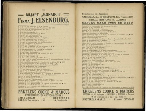 382 383 = BILJART „ MONARCH " = Firma J . ELSENBURG . Es ( A . G . M . van ) Spuistraat , 12 . S . K . Pastoor . Es ( A . P . van ) Prinsengracht , 600 . Vleeschhouwer . Tel . 4676 . Es — Engel ( A . T . E . Tan ) Lauriergracht , 90 . Huis . Es ( B . Tan ) Ceintuurhaan , 236 . Es ( B . L . van ) Boetersstraat , 2 . Es ( C . Tan ) Nieuwe Keizersgracht , 2 . Kruier . Es Czn . ( C . Tan ) von Zesenstraat 53 . Es ( Mej . C . van ) Gerard Doustraat , 153 . Es ( Mej . Chr . van ) Midden Klooster , 5 . Koffiehuis . Es ( E . van ) Keizersgracht , 824 . Tel . 6571 . Es ( H . van ) Prinsengracht , 173 . In Aardappelen . Es ( H . van ) 3e Oosterparkstraat , 230 . Hoofdonderwijzer . Es ( H . van ) Borgerstraat , 46 . Blikslager . Es Jr . ( H . Tan ) Prinsengracht , 52 . Es ( H . A . Tan ) Prinseneiland , 95 . Gep . Machinist K . JU . M . Es ( H . M . Tan ) Haarlemmer Houttuinen , 12 . Es ( J . Tan ) Bloemgracht , 30 . Koopman in Aardappelen . Es ( J . van ) Westerstraat , 116 . Timmerman . Es ( J . van ) Nieuwe Heerengracht , 24 . Es Mz . ( Joh . Tan ) Prinsengracht , 54 . Koopman . Tel . 8755 . Es ( L . Tan ) van Ostadestraat , 33 , Es ( L . W . C . van ) Tolstraat , 132 . Es ( L . W . J . van ) Albert Cuypstraat ," 60 . Musicus . , Es ( M . Tan ) Firma H . Deegen . Prinsengracht , 54 . In Schoenen en Laarzen . Tel . 8755 . Es ( M . van ) Zeedijk , 110—112 . Es ( N . S . van ) Hiiidekoperstraat , 19 . Commissionair in Effecten . Tel . K 2780 . Es ( P . Tan ) Kromboomsloot , 4 . In Aardappelen . Tel . 6160 . • Es ( P . Tan ) Ie Spaarndammerstraat , 82 . " Bierhuishouder . Tel.]_6716 . Es ( Ph . Tan ) Keizersgracht , 824 . Commissionair . Es ( T . M . va'n ) Haarlemmer Houttuinen , 60 «. Es ( W . Tan ) Marnixstraat 241 . Lood - en Zinhwerker . Es ( W . C . van ) 2e Atjehstraat , 20 . Huis . Biamantbewerker . Es ( IJ . J . van ) Lindengracht , 278 . Meubelmaker . Es & van Ommeren ( Tan ) Binnenkant , 26 . Cargadoors en Expediteurs . Tel . 1677 Esch — van Gelder ( Mej . J . van ) Nassauplein , 7 . Verloskundige . Esch ( A . B . van der ) Pretoriusstraat , 19 . Esch ( J . Tan der ) Singel , 25 . Onderwijzer . Esch ( W . C . Tan der ) Wijttenhachstreat , 46 . Cand . Notaris . Eschauzier ( Gebr .) Vijzelstraat , 77 . Commissionairs in Effecten . Tel . 1060 . Eschauzier ( G . H . G . C .) Amsteldijk , 63 . Eschauzier ( J . J . C .) Koninginoeweg , 189 . Advocaat en Procureur . Tel , K 614 . EscWzier ( J . J . C . M .) Boelof Hartstraat , 12 . Eschauzier ( J . S . C .) Oïertoom , 522 . Commissionair in Effecten . ERKELENS C00KE & MARCUS EXPEDITEURS EN C0NV0QIL00PERS AMSTERDAM ^ ROTTERDAM 247,0 . Z . Voorburgwal m 14 , Toerijstuin Eschauzier ( K .) Vondelstraat , 1 . Hoofdkantoor en Magazijn : - ===== AMSTERDAM , N.Z . VOORBURGWAL 177 . Telephoon 2699 . FILIAAL : RITSEVOORT 25 , ALKMAAR . EXPORT SAA B OOST EN WEST . Escher ( Ch . H .) Heerengracht , 495 . Accountant . Tel . 8214 . Eschweiler ( F . G .) Palmgracht , 37 . Eschweiler ( P .) Westerstraat , 74 . Koopman . Esendam ( J . H .) Oosterpark , 43 . Hoofdonderwijzer . Eshof ( W . Tan den ) Daniël Stalpertstraat , 16 . Broodbakker . E8hui8 ( A .) Borgerstraat , 62 . Kleedermaker . Eskens—Wassenburg ( Mevr . A . J . J .) Tan de Veldestraat , 5 . Corsetière . Tel . K 913 . Eskens ( G .) Jacob van Lennepstraat , 229 . Eskens ( G .) Koninginneweg , 135 . Eskens en Zoon ( J .). Haarlemmerplein , 14 . Huis - en Becoratieschilders . Tel . 9419 Eskens ( J . B .) Keizersgracht , 7 . Makelaar . Eskens ( L . F .) Overtoom , 432 . In Jssuranlifyi . Eskens ( Th . S .) van de Veldestraat , 5 . Agentuur - en Commissiehandel . Tel . ' Ma 913 . Eskes ( H .) Ie Spaarndammerstraat , 14 . Eskes ( H . B . M .) Keizersgracht , 87 . Onderwijzer . Eskes ( Wed . P . F .) Koelof Hartstraat , 6 . Eskes ( Theod .) Prins Hendrikkade , 104 . Esman ( J .) Bilderdijkkade , 21 . 2e Etage . Kantoorbediende . Esman ( J . J . M .) Bilderdijkkade , 21 . Huis . Kantoor : Keizersgracht , 405 . Esmann ( G .) Nieuwendijk , 161 . In Goud . Zilver , enz . Esmann ( V .) Nieuwendijk , 88 en Damrak , 86 . Mag . v . Goud - en Zilverwerk . Espagniol ( Ch . H . G . L ') Heerenmarkt , 10—12 . Ambtenaar . Essel ( G . J . van ) van Breestraat , 123 . Esselaar ( Wed . G .) Egelantiersgracht , 50 . Esselaar ( J . B .) Oude Hoogstraat , 22 . Sigarenmagazijn . Esselaar ( J . B . J .) Kloveniersburgwal , 40 . In Tabak . Tel . 7340 . Esselman ( K .) Rozenstraat , 186 . Esselman ( M . H .) Borgerstraat , 192 . Essen ( G . W .) Singel , 347 . Essen ( B . P . G . van ) Javastraat , 82 . Schilder . Essen Jr . ( B . P . G . van ) 2e Jan van der Heijdenstraat , 2 . Essen ( Wed . C . C . van ) Paulus Potterstraat , 38 . Tel . K 17 . Essen ( E . van ) Emmalaan , 10 . Commissionair in Effecten . Tel . SE 176(j Essen ( Mej . E . van ) Bloemgracht , 15 . Essen ( G . van ) Commelinstraat , 54 . Essen ( H . van ) Vossiusstraat , 45 . Leevaar H . B . School 3 j . cursus . Essen ( H . van ) Leidschekade , 81 . Makelaar in Metalen en Machinerieën . Tel . X 2501 , Essen ( H . van ) van Hogen dorpplein , 5 . Winkelier . Essen ( H . D . van ) Fokke Simonszstraat , 66 . Koperslager . Essen ( H . W . Tan ) OTertoom , 140 . In Comestibles . Tel . 35 2806 . Essen ( j . Tan ) Prinsengracht , 3 . Essen ( J . van ) Wijttenbachstraat , 86 . Essen ( J . van ) Spuistraat , 163 . Essen ( Jto van ) Kerkstraat , 66 . Inrichting voor Heügymnastiek en Massage . Tel . 3215 . ERKELENS C00KE & MARCUS AMSTERDAM , 247,0 . Z . Voorburgwal :-: EXPEDITEURS :-: ROTTERDAM , 14 , Toerijstuin Wekelijksche speciaaldienst I AMSTERDAM-PARIJS . :-: VERTREK DINSDAGS