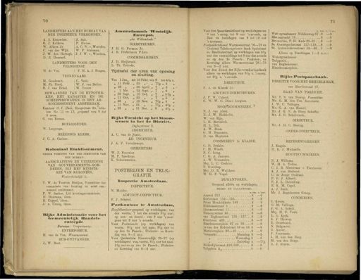 70 71 LANDMETERS AAN HET BURE AU VAN DEN INGENIEUR VERBONDEN . J . Suk . P . Hunse . A . C . W . v . Woerden . W . P . Stakman . J . J . W . v . Wiechen . A . S . Keurschot . G . 3 . Kolkers . W . Albers Jr . C . van der Wijk.J . W . den Hartogh . D . E . Henrard . LANDMETERS VOOR DEN VELDDIENST . M .' de Vos , | ' F . H . A . J . Bingen . TEEKEN AARS . M . Goudsmit . C . Veld . M . Jb . Nooij . W . J . van Bellen . E . J . van Erkel . W . Trouw . BEWAARDER VAN DE HYPOTHE- KEN , HET KADASTER EN DE SCHEEPSBEWIJZEN IN HET AR- RONDISSEMENT AMSTERDAM . Kantoor O . I . Huis , Hoogstraat 24 , loka- len No . 11 en 12 , geopend van 9 tot 5 wren . G . van Iterson . BOEKHOUDER . W . Looyenga . BEËEDIGD KLERK . J . C . A . Carlier . Koloniaal Etablissement . ONDEK TOEZICHT TAN DEN DIRECTEUR VAN HET BUREAU . AANSCHAFFING EN UITZENDING VAN GOUVERNEMENTS- GOE- DEREN , BIJ HET MINISTE- RIE VAN KOLONIËN . Westerdoksdijk 2 . T . W . de Tourton Bruijns , Voorzitter der commissie van keuring en eerst aan- wezend ambtenaar . P . W . Sachse , Lid keuringscommissie . H . Duursma , idem . B . CajJpel , idem . J . A . Crucq , idem . Rijks Administratie voor liet Gemeentelijk Handels - entrepdt . Bureaux : Gruquiusweg . ENTREPOSEUR . H . van de Ven , Waarnemend . SUB-ONTVANGER . J . W . Boer . Am ster damsel * Westelijk Entrepot . „ de Wittenk&de ." DIRECTEUREN . J . H . G . Ferman , Jr . J . B . Dinkelman P.Lzn . COMMISSARISSEN . J . D . Heijbroek . L . Th . Tetrode . Tijdtafel der uren van opeaiagr en sluiting . Van Uan . tot lOFebr . van 8 tot 41/2 u . „ LI Febr . „ 25 „ „ 71 / 2 « 5 «. „ 26 „ „ 30 April „ 7 „ 5 „ „ 1 Mei „ 25 Sept . „ 7 „. 6 „. „ 26 Sept . „ 10 Oct . „ 7 „ 51 /» „, „ 11 Oct , „ 25 „ „ 7 » 5 „ „ 26 „ „ 10 Nov . „ 71/2 „ 5 „ „ 11 Nov . „ 25 „ „ 71/a „ 41/2 ,,. „ 26 „ „ 31 Dec . „ 8 „ 41 / s ,„ Rijks Toezicht op het Stoom - weien in het 4e Ristrict . Dufaystraat 3 . INGENIEUR . A . C . van de jStadt . AD . INGENIEUR . J . A . P . Verschraage . OPZICHTERS W . J . Fournier . M . F . Speckens . K . Schoenmaker . POSTERIJEN EN TELE- GRAFIE . Inspectie Amsterdam . INSPECTEUR . N . Mulder . ADJUNCT-INSPECTEUR . F . J . Schotel . Postkantoor te Amsterdam , Hoofdkantoor geopend op werkdagen : van des voorm . 7 tot des avonds 9 l/g uur ; op zon- en feestd . : van 9 uur ' s mor- gens tot 2 uur ' s avonds . Voor Postwissels ( op werkdagen ) van voorm . 81/2 uur tot nam . 31/2 uur en op den 2e Paasch -, Pinkster - en Kerst- dag van 9—2 uur . Voor Quitantiën Nieuwendijk 25-27 ( op werkdagen ) van , voorm . 8I/3 uur tot nam . 31/2 uur en op den 2e Paasch -, Pinkster- en Kerstdag van 9—2 uur . ' Voor den Spaariankdienst • sp werk dagenvas 9 uur ' s morg . tot 9 uur ' s avonds , op Zon - en feestdagen vam 9 tot 12 uur ' s morgens . Postpakketdienst Warmoesstraat 76—78 en Centraal Telefoongebouw hoek Spuistraat en Raadhuisstraat op werkdagen van 8I/2 uur des voormiddags tot 9 our des avonds en öp den 2e Paasch -, Pinkster -, en Kerstdag alleen Warmoesstraat 76—-78 van 9—2 uur . Voor den dienst der Rijksverzekeringsbank alleen op werkdagen van 8I/2 u . ' s morg . tot 31/2 u . ' s avonds . DIRECTEUR . F . A . de Klerck Jr . ADJ DNCT-DIRECTEUREN . J . P . W . Caland . G . W . W . C . Diest Lorgion . HOOFDCOMMIEZEN . • N . J . van Aken . N . J . W . Eichholtz . W . van Rijn . L . H . Bartelink . . H . L . Dik . A . W . Boon . G . M . Busmann . D . van Hoytema . COMMIEZEN Ie KLASSE . C . D . Brakke . C . H . Windt . P . C . Ising . C . G . A . Janssen . A . W . Vermeulen . Mej . L . O Cochius . T . Overdiep . Mej . D . E . Waltheer . W . H . F . Vogel . BIJKANTOREN . Geopend alléén op werkdagen : BRIEF - EN PAKKETPOST . u . vm , u.'sav , Amstel 212 8 — 9 Kerkstraat 152—156 8 — 9 Prins Hendrikkade 189 8 — 9 Hobbemastraat 5 8 — 9 Linnaeusstraat 11 8 — 9 Hemonystraat 45 8 — 9 van Eeghenstraat 135—137..8 — 9 Overtoom 429 8 — 9 Haarlemmerplein 37 en 39..8 — 9 Ie van der Helststraat 56 en 58 8 — 9 Mariniersplein 38—40 8 — 9 Veemarkt Maandag 8 — 3 „ Woensdag 8 — 3 „ Zaterdag 4 — 7ty2 Bilderdijkstraat 158/160 8 — 9 ' Tulpplein 2 , 8 — 9 u . vm . u . ' s ; iv , W&bjrïraafsmeer Middenweg 67 . 8 — 9 Bloemgracht 16 8 — 9 Mercurius , P . H . Kade 20-21 .. 8 — 9 2e Oosterparkstraat 117-119..8 — 9 St . Antoniesbreestraat 58—60.8 — 9 Alleen op Feestdagen 1—3 n.m .: Watergraafsmeer. Tulpplein, van Eeghenstraat . , Haarlem merplein . Rij ks-Fostgpaar nank . DIRECTIE VOOR HET GEHEELE RIJK . van ' Baerlestraat 27 . RAAD VAN TOEZICHT . Mr . 3 ?. S . van Nierop , Voorzitter . Mr . G . M . den Tex , Secretaris . J . W . C . Teilegen . Mr . G . A . van Hamel . Mr . J . G . N . de Hoop Scheller . Mr . J . G . Schölvinck . DIRECTEUR . Mr . J . H . C . Busing . ONDER-DIRECTEUR . REFERENDARISSEN J . Engels . H . K . J . Michaëlis . HOOFDCOMMIEZEN . N . J . Willems . W . H . A . Tollus . C . J . B . Nierstrasz v . Tienhoven A . J . van Braband . C . de Jonge Oudraat . P . G . J . Alberti . P . J . L . Deterding . E . K . M . Capel . A . J . Smit . Mr . J . Regtdoorzee Greup . COMMIEZEN . J . Kroon . O . M . Vellinga . J . G . A . Schell . Mej . H . C . Vonk . L . G . Keek . K . J . Heiweg . E . Overbosch.N . Belgraver.G . Nuver . F . Voortman . J . H . van den Berg . M . van den Berge . A . J . Sturm .