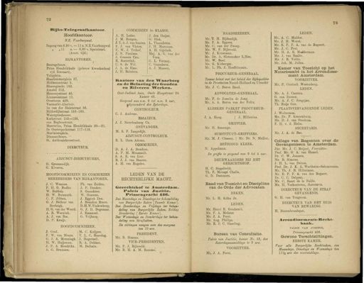 72 73 Rijks-Telegraafkantoor . Hoofdkantoor . N.Z . Voorburgwal . Ingang van 6.30 v . — 11 n . N.Z.Voorburgwal „ „ 11 n . — 6.30 v . Spuistraat . ( Amst . tijd .) BIJKANTOREN . Beursgebouw . Prins Hendrikkade ( gebouw Kweekschool v/d Zeevaart ). Tulpplein . Haarlemmerplein 37 . Hobbemastraat 5 . Bloemgracht 182 . ' Amstel 212 . Hemonystraat 45 . Linhaeusstraat 11 . Overtoom 429 . Veemarkt-Abattoir . Ie van der Helststraat 56 . Bilderdijkstraat 158-160 . Watergraafsmeer . Kerkstraat 152—156 . van Eeghenstraat . Mereurius , Prins Hendrikkade 20—21 . 2e Oosterparkstraat 117-119 . Mariniersplein . Diamantbeurs . St . Anthoniebreestraat . DIKECTEUK . ADJUNCT-DIRECTEUREN . H . Groenendijk . G . Kiveron . HOOFDCOMMIEZEN EN COMMIEZEN BEHEERDERS VAN BIJKANTOREN . Ph . van Zuiden . J . P . Donker . S . Gaanderse . W . Hoevers . J . Eggink Dzn . J . Brandon Bravo . D.H.W.Vinkenborg. G . J . D . Degenaar . J . Emanuel . G . Vrijburg . J . C . Wannee . P . H . G . Budke . W . Burkels . H . W . Butenuth . C . E . Jibben . G . J '. Balfour van Burleigh . H . G . van der Weerd . A . B . Weenink . A . J . van Ree . D . P . Kruijt . HOOFDCOMMIEZEN . M . C . Kuijper , T . L . C . ~ J . Hogerzeil . R . A . Dekker M . Dolhain . J . Graf . F . W . van Meurs . G . J . A . Menningh.H . W . Huijsman . J . P . A . Hendriks . A . G . Brumsen . COMMIEZEN Ie KLASSE . J . den Heijer . G . Blok . L . Vlaanderen . J . H . Marsman . A . H . Gijsinck . Mej . A . G . van der Veen . G . L . Vermey . C . Gaanderse . A . J . Maasen , A . H . Loder . J . M . Rongen . J . T . A . J . van Santen . F . J . van Vloten . F . W . J . Tethof . J . N . Pisuisce . J . Goossen Czn . R . Roeterink . C . S . de Wit . J . A . de Haas . J . H . Reiniers . Kantoor van den Waarborg en de Belasting-der Gooden en Zilveren Werlten . Oost-Indisch huis , Oude Hoogstraat 24 Kamer 45 . Geopend van v.m . 9 tot n.m . 3 uur , uitgezonderd des Zaterdags . CONTROLEUR . C . J . Andreae . ESSAIEDR . J . J . Neurdenburg Cz . ONTVANGER . M . S . F . Langedijk . ADJUNCT-CONTROLEUR . R . L . Hora Adema . COMMIEZEN . D . A . J . A . Bondam . A . P . M . Moussault.S . A . E . van Lier . B . J . J . van Baaren.A . H . van Engelen . LEDEN VAN DE EECHTEELIJKE MACHT . CJerecHtsIiof te . Amsterdam . Paleis van Justitie . Prinsengracht 436 . Bes Maandags en Dinsdags ter behandeling van Burgerlijke Zaken [ Tweede Kamer ]. Des Donderdags en Vrijdags ter behan- deling van Burgerlijke Zaken . Roldag Donderdag [ Eerste Kamer ']. Des Woensdags en Donderdags ter behan- deling van Strafzaken . De zittingen vangen aan des morgens ten 10 ure . PRESIDENT . Mr . B . Simons . VICE-PRESIDENTEN . Mr . P . J . Bijleveld . Mr . R . H . A . M . Romme . RAADSHEEREN . Mr . ' J . H . Bijdendijk . Mr . F . A . Eggers . Mr . C . van der Zweep . Mr . W . F . Bijleveld . Mr . J . Kruseman . Mr . Dr . A . Slotemaker L.Hzn . Mr . W . Boot . Mr . G . Kirberger . Mr . L . Ph . J . Hoeffelmann . PROCUREUR-GENERAAL . Tevens belast met het beleid der Rijkspolitie in de Provinciën Noord-Holland en Utrecht " Mr . J . C . Baron Baud . ADVOCATEN-GENERAAL . Mr . P . de Josselin de Jong . Mr . A . A . Baron van der Feltz . KLERKEN PARKET PROCUREUR- GENERAAL . J . A . Hoog . ] J . Hilleuius . GRIFFIER . Mr . H . Smeenge . SUBSTITU ÜT-GRIFFIERS . Mr . M . J . Claasen . [ Mr . Dr . N . Muller . BEËEDIGD KLERK . N . Appelman . De griffie is geopend van 9 tot 4 uur . DEURWAARDERS BIJ HET GERECHTSHOF . H . C . Stapelveld . Th . F . Menage Challa . G . D . Dammers . Raad van Toezicht en Discipline van de Orde der Advocaten . DEKEN . Mr . L . H . Kühn Jr . LEDEN . Mr . Henri R . Goudsmit . Mr . F . A . Molster . Mr . J . A . Foest . Mr . Aug . Philips . Mr . E . J . C . Goseling . Bureau van Consultatie . Paleis van Justitie , kamer No . 53 , des Zaterdagsnamiddags te 3 pre . VOORZITTER . Mr . J . A . Foest . LEDEN . Mr . A . C . Mulder . Mr . J . H . Worst . Mr . E . P . F . A . van de Bogaert . Mr . J . C . Post . Mr . H . A . E . Madderman . Mr . J . van Raalte . Mr . J . R . Voute . Mr . Joh . M . Jolles . Kamer van Toezicht op het Notarisambt in het Arrondisse- ment Amsterdam . VOORZITTER . Mr . P . Coninck Westenberg . LEDEN . Mr . A . J . Carsten . G . van Iterson . Mr . A . J . C . Jongejan . Th . Ruijs Gzn . PLAATSVERVANGENDE LEDEN . J . Woltersom . Mr . Dr . F . Kranenburg . Mr . D . J . van Stockum . F . H . v . d . Helm . SECRETARIS . Mr . J . A . de Bas . College van Regenten over de Gevangenissen te Amsterdam . Jhr . Mr . J . C . Reijnst , Voorzitter . Prof . Mr . G . A . van Hamel . Dr . C . W . Janssen . Mr . B . Simons . J . H . L . van Deinse . Prof . Dr . J . K . A . Wertheim-Salomouson . Mr . Th . J . B . Hilterman . Mr . E . P . F . A . van den Bogaert . Dr . O C . Delprat . Mr . C . Baart de la Faille . Mr . H . Verkouteren , Secretaris . DIRECTEUR VAN DE STRAF GEVANGENIS . G . H . van Tongeren . DIRECTEUR VAN . HET HUIS VAN BEWARING . H . Bierenbroodspot . Arrondissements-Recht - bank . PALEIS VAN JUSTITIE , Prinsengracht 436 . Gewone Terechtzittingen . EERSTE KAMER . Voor alle Burgerlijke Rechtzaken , des Maandags , Dinsdags en Woensdags ten Hl/2 ure des voormiddags .