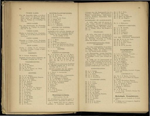 74 75 TWEEDE KAMER , Voor alle Burgerlijke Zaken , en de Straf- zaken , waarvan de Burgerlijke Rechter kennis neemt , des Maandags , Donder- dags en Vrijdags des voormiidags ten lil/g ure . DERDE KAMER . Voor alle Handelszaken , des Woensdags , Donderdags en Vrijdags des voormid- dags ten 11 ure . VIERDE KAMER . Dinsdag en Donderdag 10 uur . Strafzaken , behalve die aan den Burgerlijken Rechter opgedragen . VIJFDE KAMER . Woensdag en Vrijdag 10 uur . Strafzaken , behalve die aan den Burgerlijken Rechter opgedragen . ZESDE KAMER . Dinsdag en Vrijdag 10 uur . Strafzaken als hoven . Woensdag Voogdij en andere burgerlijke zaken . PRESIDENT . Mr . P . Coninck Westenberg . Houdende deszelfs gewone audientiën , des Woensdags ' s morgens ten 10 ure . VICE-PRESIDENTEN . Mr . H . Meinesz . Jhr . Mr . J . O Reijnat . Mr , H . M . Witsen . Jhr . Mr . W . C . Quarles van Ufford . Mr . L . Offerhaus Jzn . RECHTERS . Mr . J . T . F . Telting . Mr . W . A . van Woudenberg Hamstra . Mr . G . T . J . de Jongb . Jhr . Mr . J . J . A . Quintus . Mr , G . W . Eekhout . Mr . J . W . Huijsinga . Mr . J . Slingenberg . Mr . F . J . Verscheure . Jhr . Mr . J . F . Lewe van Nijenstein . Mr . P . A . Rutgers van der Loeff . Mr . F . C . van Geer . Mr . J . Binsbergen , Mr . B . M . de Vos . Mr . E . Jellinghaus . Mr . L . A . M . Sasaen . Mr . A . J . van Roijen . Mr . F . Sleutelaar . Mr . G . A . Servatius , Mr . J . Wiardi . Mr . B . M . Taverne . RECHTER-PLAATSVERV ANGERS . Mr . P . W . de Koning . Mr . P . Scholten . Mr . P . J . J . van den Biesen . Mr . J . Déking Dura . Mr . F . B . Enthoven . Mr . I . H . Hijmans . Mi '. C . A . J . Hartzfeld . Mr . J . J . C . Eschauzier . OFFICIER VAN JUSTITIE . Mr . C . Baart de la Faille Audientiën worden gehouden dagelijks met uitzondering van den Zaterdag aan het Parket , van des voormiddags 10 l/u tot des middags 12 ure . SUBSTITUUT-OFFICIEREN . Mr . L . O Besier . Mr . J . Bruijn . Mr . W . L . Luyken Glashorst . Mr . A .* Baron van Harinxma thoe Slooten . Mr . J . W . A . M . Baron van Lamsweerde . Mr . Ij . Th . Jorissen . GRIFFIER . Mr . T . Dijkstra . SUBSTITUUT-GRIFFIERS . Mr . J . G . Huijser , Ma '. J . A . E . Bevers , Mr . W . M . G . Jolles , Mr . D . M . Pare , Mr . H . H . Boas , Mr . F . O Déking Dura , Mr . W . N . J . M . Smit , Mr . J . Boon , Jhr . Mr . Dr . L . A . van den Brandeler . De Griffie van deArrondissemenis-Rechtbank is dagelijks geopend van 9 tot 4 ure , Zaterdags van 10 tot 4 ure . DEURWAARDERS BIJ DE ARRON-DISSEMENTS-RECHTBANK . D . J . Drayer , Ie deurwaarder . W . Abspoel . Ir . C . van der Duijs L.Czn ., Ie deurwaarder . J . P . van Vugt , te Hilversum . F . W . P . Harsbagen te Bussum . D . H . van der Poll , Ie deurwaarder . C . N . Veltens , te . Nieuwer-Amstel I . H . du Pont Noordbeek . H . Leepel Wzn . N . Wagenaar . S . Schermer . H . A . Schmitt . J . P . C . D . Brinkman . P . Ambagtsheer . Kantongerechten . Weteringschans 10—18 . Het Arrondissement Amsterdam omvat de Kantongerechten Amsterdam en Hilversum . Op 1 Januari 1911 zijn de 4 Kanton- gerechten te Amsterdam opgeheven en \ vervangen door één ' Kantongerecht voor de gemeenten Amsterdam , Watergraafsmeer , Diemen , Nieuwer-Amstel , Ouder-Amstel , lUithoorn , Buiksloot , Nieuwendam , Rans- dorp en Sloten . BURGERLIJKE EN HANDELSZAKEN . ( Er zullen iede»e week vijf gewone zit- i tingen worden gehouden ter behandeling van burgerlijke - en . handelszaken , en wel op . Maandag , Dinsdag , Woensdag , Donder- dag en Vrijdag , telkens des morgens te tien uur . STRAEZAKEN . iEr zullen iedere week vijf gewone zit- tingen worden gehouden ter behandeling wan strafzaken ; en wel op Maandag , Dins- dag , Woensdag , Donderdag em Vrijdag , - telkenc des morgens ite tien uur . BUITENGERECHTELIJKE WERK- ZAAMHEDEN . Voor deze werkzaamheden zal op iederen Maandag , Dinsdag , Woensdag , Donderdag . en VrijSag , telkens des morgens te tien niur , eeae zitting worden gehouden . Op Nieuwjaarsdag , tweeden Paasehdag , Hemelsvaartsdag , tweeden Pinksterdag en ide Kerstdagen worden geen zittingen ge- jhounen . Be Griffie van het Kantongerecht zal voor iet publiek geopend zijn op alle werk- dagen van des voormiddags 9 uur tot des namiddags 3 uur of zooveel langer als de - openbare tereeiaèzittingen zullen duren . KANTONRECHTERS . Mr . A . J . Carsten . Mr . Th . I . B . Hiltermann . Mr . 1 . A . Höfelt . Mr . W . J . van Dam . Mr . Dr . F . Kranenburg . PLAATSVERVANGERS . Mr . D . E . Lioni . Mr . B . A . Asscher . Mr . Th . Stuart . Mr . G . Hijmans . Mr . J . H . Worst . Mr . H . A . E . Modderman . Mr . D . K . G . de Jong . Mr . J . A . van Hamel . Mr . J . van Woudenberg Hamstra . Mr - I . A . M . Bunker . Mr . A . E . M . Povel . Mr , A , W . Gerritzec Mr . G , Parser . Mr . L , L . G . de Hartog . Mr . C , 3 . F . Karsten . Mr . L . H . C . Kuhn . Mr . G . J . Salm . Mr . H . A . van Nierop . Mr . A . Baron - van Haersolte . Mr . O H . van Zeggelen . GRIFFIER . Mr . L . J . Blijdenstein . SUBSTITUUT-GRIFFIERS . Mr . J . O W . Evenblij . Mr . W . J . H . Dons . Mr . J . H . Scholteu . Mr . P . F . Swagerman . Mr . G . J . van Brakel . AMBTENAREN VAN HET OPENBAAR MINISTERIE . Jhr . Mr . W . R . Op ten Noort . Mr . P . M . F . Bauduin . Mr . G . L . de Vries Feijena . Mr . E . F . Enger . Mr . L . W . E . M . Lasonder . Voogdijraden . AMSTERDAM I . Da . J . D . J . Idenburg . Voorzitter . Mr . Th . I . B . Hiltermann . Mevr . S . A . Levenbacb — Asscher . W . F . van Voorst . Mr . A . H . Wertheim . J . A . van Zutphen . Mej . H . P . Lefébure . Jos . Teixeira de Mattos . Prof . Dr . L . Bouman . Th . F . J . Wecaing . Mr . J . F . Muijsken . Mr . J . O van Kempen , Secretaris . Prinsen- gracht 546 . AMSTERDAM II . Jhr . Mr . J . F . Backer , Voorzitter . Mevr . A . H . van de Stadt-van Hasselt . J . Compris . Mr . J . van Woudenberg Hamstra . Mevr . Wed . A . ter Horst — Outshoorn . D . J . van Houten te Weesp . Dr . W . J . M . Engelberts . J . Cardinaal te Hilversum . J 
