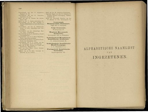 146 Parochiekerk van den H . Augustinus , Rusland 19—21 . Parochiekerk van den H . Donünicus , Spuistraat 14 — 20 . Kerk van den H . Thomas van Aquine , Singel 156 . Kerk van den H . Joseph , Kalverstraat 58 . Parochiekerk van de HH . Nicolaas en Barbara , Bilderdijkstraat bij de DeClercq - straat . Parochiekerk van den H . Willibrordus buiten de Veste , Amsteldijk hoek Cein - tuurbaan . Parochiekerk van het Allerheiligst Hart van Jesus , Vondelstraat . Parochiekerk van den H Bonifacius , Tweede Oosterparkstraat . Parochiekerk van de II . Maria Magdalena , Eerste Spaarndammerstraat . Parochiekerk van den H . ViucentiusaPaulo , Jacob van Lennepkade 213 . Parochiekerk van O . L . Vrouw van den H . Rozenkrans , Jacob Obrechtstraat . Kerk van de HH . Joannes en Ursula met Gezellinnen , Bagijnhof 31 . Kerk van Onze Lieve Vrouw , Keizers- gracht 220—222 . Bijkerk van de H . Rita , Overzijde IJ , Laanweg hij het Tolhuis . Kerk van den H . Antonius-Tichelstraat . Openbare Kapel van den H . Hubertus ( St . Josephs Gezellen- Vereeniging ), Stadhou- derskade 55 . Kapel der Eerwaarde Broeders van den H . Joannes de Deo , Keizersgracht 67 ,. Vereenigde Doopsgezinde Cemeente . Singel 452 en Oosterpark . Vrije Cwenieente . Weteringschans 20 . lïaalscli Hervormde Cremeente . Keizersgracht 676 en » Walenplein . IVederlandsch Hoogduitsch Israëlitische ( Gemeente . St . Anthoniesbreestraat 36 . lederiandsch Israëlitische Hoofd-Synagoge . J . D . Meijerplein 2—4 . Portugeesch Israëlitische Gemeente . Rapenburgerstraat 197 . ALPÏÏABETISCHE NAAMLIJST VAN INGEZETENEN .