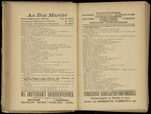 Gebruik tekstcoördinaten Transcriptie . Au Bon Marché Bilderdykstraat 131/135 Tel . Z 3200 Ferdinand Bolstraat 100/102 „ Z 959 Overtoom 424/426 hoek Star/ngstraat „ Z 3300 ] Abraham ( L .) Plantage Kerklaan , 28 . Abrahams ( Wed . A .) Nieuwe Keizersgracht , 20 . Abrahams Jr . ( A .) Haarlemmerweg , 243 . Boekbinder . Abrahams ( B .) Ie Jan van der Heijdenstraat , 104 . Wasch - ' en Sirijkinrichting , Abrahams ( D .) Plantage Muidergracht , 117 . In Diamanten . Abrahams ( E . J .) Keizersgracht , 373 . Arts . Tel . 4162 . Abrahams ( E . M .) Spinozastraat , 29 . Agentuur - en Commissieliandel in IJzerwaren en Gereedschappen . Abrahams ( Jos .) Albert Cuypstraat , 62 . Abrahams ( J .) Kanaalstraat , 158 . Abrahams ( Wed . M . E .) Spinozastraat , 29 . Abrahams ( M . G .) van Ostadestraat , 374 . Abrahamsen ( C .) Nassaukade , 332 . In Tabak en Sigaren . Tel . ' ti 3407 . Abrahamson ( Felix P .) Kalverstraat , 120 . Boekhandelaar en Uitgever . Tel . 6261 . Abrahamson ( J .) O . Z . Voorburgwal , 83 . Koopman in Koffie en Thee . Tel . 7547 . Abrahamson ( Jacq . S .) Swammerdamstraat , 49 . Kleedermaker . Abram ( A .) Ruyschstraat , 43 . Abrams ( A .) Gelderschekade , 82 . Tel . 5129 . Abrams ( F .) Sarphatistraat , 52 . In Diamanten . Abrams ( Firma Wed . P .) Gelderschekade , 82 . Kuiperij . ' Tel . 5129 . Abramsen ( J . 11 .) da Costakade , 40 . Ambtenaar S.S . Abramsz ( A . P .) Nassaukade , 86 . Ie Etagej Abramsz ( S .) Burmanstraat , 36 . Onderwijzer . Abramsz ( Mej . S .) Marnixstraat , 381 . Abresch ( Dr . F . 1 .) Frans van Mierisstraat , 86 . Leeraar aan het Gymnasium . Abresch ( J .) Veerstraat , 25 . * Abshoven ( P . van ) Valerinsstraat , 117 . Bovenhuis . Onderwijzer . , Abspoel Jr . ( A .) Brederodestraat , 56 . Abspoel ( A . J .) Ceintuurhaan , 284 . Muziekonderwijzer . Abspoel ( Wm .) Spiegelgracht , 26 . Deurwaarder bij de Arrond.-Rechtb . Tel . 8138 . Academie van Accountants ( Nederl .) Secretariaat : Stadhouderskade , 133 . Academie van Beeldende Kunsten , Stadhouderskade b/d . Ie van der Helststraat , 86 . Tel . 5B 791 . Accountancy . Maandblad onder Hoofdredactie van Th . Limperg Jr . Keizersgracht , 448 . Tel . 5634 . Accountants- Bureau onder Directie Joh . Wi I lertiii ' Jr . Ongericht 1S90 . 3e Helmersstraat , 33 . Accountants- en Administratiekantoor onder Dir . v . A . Kijlewer . N . Z . Voorburgwal , 136 . Tel . 3785 . Accountants- Kantoor onder Dir . van W . A . van der Drift . Stadhouderskade , 133 . Tel . K 2917 . Accountants- Kantoor van Elles en Hamelberg . Heerengracht , 127 . Tel . 9851 . Accountants- Kantoor E . A . J . van Gaaien . Leliegracht , 12 . Accountants- Kantoor van Mr . I . Goudeket . Reguliersgracht , 138 . Tel . 7801 . 1 . AMSTERDAM'S GOEDERENVERVOER . DIRECTEUR : C . TAMMINGA VAN EYSINGA . AMSTERDAM . 2201 - Noord 4686 . ' s GRAVENHAGE . Telefoon 2040 — 16 ( Sch .) HANDSCHOENENDASSEN - PAMAPDUIES ONDERGOEDEREN KOUSEN - ZAKDOEKEN - SOKKEN COMRLEETE INDI SCHE UITRUSTINGEN Accountants-üantoor Van Haagen & Co . Keizersgracht , 136 . Tel . 6151 Hïoord . Accountants-Kantoor Frans V . Schalkwijk . Marnixstraat , 409 . Accountants- Kantoor J . A . Stürcke . Amstel , 330 . Tel . 5913 . - Accumnlatoren-Fabrik AM . Ges . Berlin — Hagen . Ingenieursbureau , keizersgracht , 304 . Ie Etage . Tel . 1908 . Acda ( J .) Westerdokstraat , 42 . ' . - . „ Achawah " Bond van Israélietisehe Godsdienstonderwijzers m Nederland . Secretariaat : Galerij , 19 . Achenbach Jr . ( A . P .) Overtoom , 476 . Ambtenaar en Stenograaf . Achterberg ( A . J .) Jacob van Lennepkade , 200 . Achterberg ( J . C .) Ie van der Helststraat , 44 . i _ Achterbergh ( Wed . J . S . P . Ph .) van Breestraat , 67 . Achtereek ( J .) Gerard Brandtstraat , 4 . Aehttienribbe ( B .) Lepelstraat , 62 . Achttienribbe ( I .) Andreas Bonnstraat , 15 . Achttienribbe ( J .) Vrolikstraat , 152 . Diamaulhemerker . Ackema ( H . Z .) Oudekerksplein , 56 . Aekema ( J .) Heerengracht , 365 . Kapper . Ackema ( M .) Kinkerstraat , 32 . Ackema ( M .) Grcnsstraat , 5 . Ackeman ( J . H .) van Ostadestraat , 127 . ; Acker ( J . van ) O . Z . Voorburgwal , 151 . Expediteur , lel . 51 ^. Ackers ( A .) Ie Helmersstraat , 267 . Hoofdonderwijzer . Acohen ( H .) Spinozastraat , 19 . Tailleur . Acohen Azn . ( Is .) Plantage Middenlaan , 66 . Acohen ( R .) Ruyschstraat , 15 . Acohen ( S .) Plantage Badlaan , 24 . Comm . m Effecten , lel . 3840 . Acronius ( G .) Heereögracht , 275 . Graveur . Actiengesellschaft Plateelbakkerij „ Delft ", Langestraat , 13 - Actieselskabet Det Kgl . Octr . Almindelige Brandassurance - Compagni for Varer og Effecten . Keizersgracht , 173 . Adam ( C .) Ie Atjehstraat , 150 . Adam ( G .) Scbinkelkade , 4 . Adam ( H . D .) Haarlemmerstraat , 92 . Adama ( A .) Amsteldijk , 16 . Adama van Scheltema ( Mevr . F .) van Eeghenstraat , 123 . Adama van Scheltema ( P . A .) Nicolaes Maesstraat , 51 . Adams ( C . P . C .) Rustenburgerdwarsstraat , 19 . Adams ( J . C .) 3e Helmersstraat , 61 . Gemeente-Ambtenaar . Adams ( P . O .) Nieuwendijk , 50 . Ie Etage . Handelsbediende . Adams Brothers . Dtrechtschestraat , 134 . In Heeren-Modeariikelen . Addicks ( A . F .) van Ostadestraat , 83 . Horlogemaker . IIZliBEN - BER8PLMTSEN VOOR INBOEDELS . Transportwagens en Schuiten te huur . Vervoer van BRANDKASTEN , STOOMKETELS , enz . Addieks ( Floris C .) Westerdokstraat , 4 . Fabrikant .