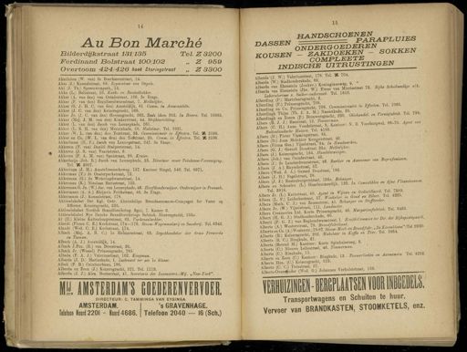 Gebruik tekstcoördinaten Transcriptie 15 H A NDSCHOENEN BApjjUms 14 Au Bon Marché Bilderdijkstraat 131/135 Tel . Z 3200 Ferdinand nolstraat 100/102 „ Z 959 Overtoom 424/426 hoek Staringsiraat „ Z 3300 Akerlaken ( W . van ) 2e Boerhaavestraat , 14 . Akes ( J .) Kanaalstraat , 88 . Reparateur van Orgels . Aki ( J . Th .) Spreeuwen park , 12 . Akke ( L .) Balistraat , 16 . Koek - en Banketbakker . Akker ( A . van den ) van Ostadestraat , 166 . 3e Etage . Akker ( F . van den ) Beguliersdwarsstraat , 7 . Melkslijter . Akker ( G . J . H . C . van den ) Amsteldijk , 61 Comm . in Assurantiën . Akker ( J . C . van den ) Keizersgracht , 566 . Akker Jr . ( J . C . van den ) Heerengracht , 363 . Zaak idem 352 . In Bieren . Tel . 10365 . Akker ( Mej . J . M . van den ) Kinkerstraat , 44 . Stry kinrichting . Akker ( L . van den ) Jacob van Lennepkade , 261 . Akker ( L . S . H . van den ) Marnixkade , 59 . Makelaar . Tel . 5921 . Akker ( W . L . van den ) den Texstraat , 25 . Commissionair in Effecten . Tel . 2K 2198 . Akker en Co . ( W . L . van den ) den Teistraat , 25 . Comm . in ' Effecten . Tel . X 2198 . Akkerboom ( H . F .) Jacob van Lennepstraat , 247 . 3e Etage . Akkeren ( F . van ) Daniël Stalpertstraat , 14 . Akkeren ( J.S . van ) Vaartstraat , 6 . Akkeren ( P . A . M . van ) Spuistraat , 98 . Kruier . Akkerhuijs ( Joh . E .) Jacob van Lennepkade , 23 . Directeur eener Tuinbouw-Vereeniging . Tel . K 3007 . Akkeriuga ( J . H .) Amstelveenscheweg , 137 . Kantoor Singel , 540 . Tel . 8971 . Akkerman ( F .) 2e Oosterparkstraat , 72 . Akkerman ( G .) 2e Weteringdwarsstraat , 14 . Akkerman ( K .) Nicolaas Beetsstraat , 132 . Akkerman G . Jz . ( W .) Jac . van Lennepkade , 46 . Hoofdonderwijzer . Onderwijzer in Fransch . Akkermans ( A . A .) Khijnvis Feithstraat , 46 . 3e Etage . Akkermans ( J .) Kanaalstraat , 178 . Aktieselskabet Det Kgl . Octr . Almindelige Brandassurance-Compagni for Varer og Effeeter . Keizersgracht , 225 . Aktieselskabet Nordisk Brandforsikring . Spui , 7 . Kamer 6 . Aktieselskabet Nye Danske Brandforsikrings Selskab . Heerengracht , 255 «. Al ( H .) Kleine Kattenburgerstraat , 65 . Varkensslachter . Alandt ( Firma C . E .) Kerkstraat , 174—176 . Stoom - Wagenmakerij en Smederij . Tel . 6342 . Alandt ( Wed . C . E .) Kerkstraat , 174 . Albach ( Mej . A . B . C .) Ie Helmersstraat , 63 . Depothoudster der ürma Ferwerda en Tieman . Albach ( A . J .) Amsteldijk , 14 . Albach J.Pzn . ( B .) van Breestraat , 26 . Albach Jr . ( Wessel ) Prinsengracht , 785 . Albada ( F . A . J .) Valeriusstraat , 162 . Koopman . Albarda ( J . D .) Marinekade , 1 . Luitenant ter zee Ie klasse . Albek ( F . B .) Ceintuurbaan , 196 . Alberda en Zoon ( J .) Keizersgracht , 571 . Tel . 1113 . Alberda ( J . J .) Alex . Boersstraat , 41 . Secretaris der Levensverz.-Mij . „ Jfew-Tork ". 1 . AMSTERDAMS GOEDERENVERVOER . DIRECTEUR : C . TAMMINGA VAN EYSINGA . ' s GRAVENHAGE . Telefoon 2040 — 16 ( Sch .) AMSTERDAM . Telefoon Noord 2201 - Noord 4686 . DASSEN ONDERGOEDEREN „ nKJ , EN KOUSEN - ZAKDOEKEN - SOKKEN üUU- ö^-tv cOMPLEETE I NDISCHE UITRUSTINGEN Alberda ( J . W .) Valeriusstraat , 178 . Tel . X 704 . Alberda ( W .) Stadhouderskade , 89 . _ , Alberda van Ekenstein ( Jonk,r)Korungi ^-^^ 1 % ^ SctóW ^ a , k . Alberda van Ekenstein ( Jnr . W .) «»» Laboratorium v . Suiker-onderzoek . Tel . 1810 . , Albcrding ( P .) Martelaarsgracht 2 . iiS ^^^^£^- c T ttr in Effecten - Tel " 1063 ' Tel . 798 . N . Z . Voorburgwal , 66-70 . Agent van tb dingk Thijm ( Th . J . A . M .) Nassaukade 20 . Alberdingk en Zonen ( F .) Brouwersgracht , 230 . Albers ( B . J . J .) Beestraat , 12 . Kmmerman ilws(C . H .) Anna Vondelstraat 9 Kantoor : Buitenlandsche Emzen . Tel . 4180 . Albers ( D .) Pieter Vlamingstraat , 45 . Albers D ) Joan Melchior Kenroerstraat , 40 . tb ïï ma Gez .) Vijzelstraat ? 34 . In Handwerken . t bers G J .) Gerard Doustraat 25 «. Melkslyter . Albers ( J .) Keizersgracht , 164 . # andelsrnz t ger . £ jbS [ j^^eSLtaCk BarUer en Aannemer van Begrafenissen . Albers ( J . A .) Euyschstraat 57 . Albers ( Wed . J . A .) Gerard Doustraat , 1 »^. Albers ( J.H .) Fagelstraat , 28 . Behma „ ' mZ t ' schoutf^ÖJÏÏSsJW . *■ ^ smies en iijne Vleeswaren . K ! Lïc e jf - ztenLat , 4 , Behanger en Stoffeerde , S ^^ St^SS ^ 46 . Margarine fabriek , Tel . 6463 . SSS % J^v-SuSsslL ,!. Boofd-Co^eslerBir.derEijksposts ^. Alberts ( B . C .) Bingkade , 21 . ■ , ■ , o 1 bei s Berend M .) Kantoor : Korte Spinhuissteeg , 3 . Alberts ( C .) Nieuwe Leliestraat , 46 . Timmerman . Sgta ftSffc K-8 ^ 13 - »—*** m AamerS ■ TCL 4232 - Alberts Hzn . ( C .) Keizersgracht , 519 . Alberts ( C . C .) Tuinstraat , 27 . . - q Alberts-Overefnder ( Wed . G .) Johannes Verhnlststiaat , 159 . IDU-UJflfflnHÏ Transportwagens en Schuiten te huur . Vervoer van BRANDKASTEN , STOOMKETELS , enz