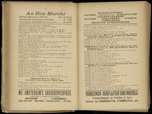Gebruik tekstcoördinaten Transcriptie 24 5 . Au Bon Marché Bilderdijkstraat 131/135 Tel Z 3200 Ferdinand Bolstraat 100/102 „ Z 959 Overtoom . - 424/426 hoek Siar/ngsfraaf „ z 3300 Alting Bösken ( G . J . P .) Oosteinde , 3 . Tel . SB 2553 . Alting ( H . H .) Lauriergracht , 104 . In Bakkersbenoo Altink ( A .) St . Janstraat , 21 . Boekhandelaar . Altink ( Louis ) Ie Helmersstraat , 41 . Agentuur en Commissie . Tel . SE 3681 . Altink & Co . Ie Helmersstraat , 41 . Agentuur en Commissie . Tel . SE 3681 . Altink , Pappenheim en Comp ., O . Z . Voorburgwal , 284 . Grossiers ' in Tabak . XgIé ouo . Altink- Greve ( Wed . Volkert ) de Ruyterkade , 53 . Koffiehuis en Restauratie . Tel . 4215 Altms en Co . ( Naaml . Venn . Houthandel voorh .) Hou'thaven . ' Commissionairs in Scheeps- •■•■■- en Timmerhout . Tel . 793 . Altmann ( W . H .) van Ostadestraat , 68 . Altvater ( F .) Haarlemmerdijk , 62 en 165 en van Limb . Stirumstr ., 50 . In Kol . Waren Altvater ( H .) Czaar Peterstraat , 78-80 . In Koloniale Waren . Aluin ( J .) Voetboogstraat 20 . In Oud Papier . Alvarado ( M .) Standhouderskade , 31 . Consul der Vereenigde Staten van Mexico . Alvares Correa ( M .) Sarphatistraat 36 . Med . Docts . Arts . Tel . 7233 . Alving Jz . ( J .) de Ruyterstraat , 3 . Amateur-Potografen-Vereeniging . Reguliersdwarsstraat , 108—114 . Tel . 10422 Amazoou ( J . d ') Ie Helmersstraat , 171 . Ambachtscholen v . d , Maatschappij voor den Werkenden Stand , Weteringschans 165 Tel . 5859 , Westerstraat , 187 . Tel . 5944 en Timorplein , 21 . Tel . 9582 Ambagtsheer ( K .) Saenredamstraat , 6 . Ambagtsheer ( P .) Prinsengracht , 757 . Deurwaarder bij de Arrondissemenls-Rechtbank . lel . Iö2ö . Ambagtsheer ( W .) Amsteldijk , 130 . Aannemer . Ambagtsheer en van der Meulen , Tasmanstraat , 3 . Houtkoopers . Tel . 850 Arnelsbeek ( J . H .) Colnmelinstraat , 18 . Amelüng ( B .) Nieuwe Spiegelstraat , 15 . Kapper . Amelüug ( J . C .) Govert Flinckstraat , 346 . Vleesehhouwer . Tel . SE 2557 . Amelüng ( M .) vau Ostadestraat , 5 . Amelüng ( W . F . Th .) Kwakersstraat , 6 . Varkensslachter . Amende ( W . J .) Govert Flinckstraat , 271 . Huis . American Automatic Photo Cy . Kalverstraat , 32 . American Bar . Rokin , 20 . Tel . 6206 . American Crayon Co . Nieuwe Heerengracht , 85 . Fabriek oan Schöolkrijt . American Express Company . Correspondent . Prins Hendrikkade , 125 . Tel . 1629 . 1 1IKKK 1 \ HAT Co ., Rokin , «. Specialiteit Amerikaansche Tanner Hats . American Hotel , Leidscheplein , 28-30 - Tel . 926 . Marnixstraat , 406/408 , Leidschekade 97 Tel . 6302 en 4737 . American Lunchroom Cy . ( The ) Kalverstraat , 16—18 . Tel . 2471 . DIRECTEUR : C . TAMMINGA VAN EYSINGA . AMSTERDAM , 2201 - Moord 4686 . ' s GRAVENHAGE . Telefoon 2040 — 16 ( Sch .) American Office Supply Company . ( The ) Kerkstraat , 215 . Copiëer-Inrichting en Kan- toorbenodigdheden . Tel . 3417 . HANBSCHOENENBASSEN ~ PARAPBUIES ONBERG OEBEREN KOUSEN - ZAKBOEKEN - SOKKEN COMPL.EETE INBISCHE UITRUSTINGEN American Petroleum Company . Agentschap Amsterdam , Heerengracht , 404 , Tel . 3963 . Depot Amsterdam : Houtmankade , 44 . Tel . 834 . American Small Cigar Cy . Nieuwe Amstelstraat , 17 . lel . 67J1 - American Stoppage . Vijzelstraat , 20 . ■ ' i - Amerikaansche Electrische Vibro Massage Inrichting . LeidschestïfUit , 27 . Amerikaansche Handelmaatschappij . Prinsengracht , 544 . lel . Wiói . _„ - x . ( American Trading Society ). . Ameringen ( Ed . van ) [ leerengracht , 67 Agent van Buiten . Huizen . Tel . 2690 Amermien ( E . A . van ) Plantage Parklaan , 8 . Viee-Consul van Uruguay . Tel . 95.75 . Ameringen ( J . M . van ) Prinsengracht , 848 . Makelaar . Ameringen ( L . van ) Gijsbrecht v . Aemstelstraat , 35 . Ameringen ( M . J . van ) Nassaukade , 146 . Agent m Wijn . SlKUË »' & Co . ( M . 3 . vaï .) kantoor Bronwersgr ., 844 . WvZgenlen , TkU * o . Ï6Ö8 . Specialiteit in Samos en AmeSn e ( M * C L , e v a nTN"mvé ' Keizersgracht Ie . Secretaris der Ned . Isr . gemeente . Ameringen ( N . van ) Ceintuurbaan , 249 . Amerongen ( A . van ) Mauritsstraat , lb . Vleesehhouwer . Amerongen ( A . van ) Reyer Anslostraat , 14 . Bouwopzichter . Amerongen ( A . van ) Nieuwe Prinsengracht , 86 . Amerongen ( A . van ) Lepelstraat , 86 . Sigarenmaker . Amerongen ( Arn . J . van ) Amstel , 159 . In Diamanten , lel . Siys . Amerongen ( B . van ) Plantage Parklaan 27 Amerongen ( C . P . van ) Elandsgracht , 130 . U Koffie en Thee .^ f 737 ' „ Amerongen (». S . van ) Sieuwe Prinsengracht , llO-ll *. Agentuur - en Coinmissiehandel . Amerongen ( F . van ) Nieuwe Achtergracht , 43 . Amerongen ( G . A . van ) Kinkerstraat , 135 . Amerongen ( J . van ) Rapenburg , 7 . Brooddepót . Amerongen ( J . van ). Jonas Daniël Meijerplem , 19 . Amerongen ( Wed . J . A . van ) Nieuwe Keizersgracht , 17 . Amerongen ( J . A . van ) de Clercqstraat , 50 . Amerongen ( T . C . van ) Heerengracht , 427 . Kleedermaker . Tel . 5420 . Amerongen ( Wed . J . J . van ) 2e Weteringdwarsstraat , 6 . Amerongen ( M . van ) Zwanenburgwal , 62 . Amerongen ( P . van ) Elandsgracht , 140 . Koffieoerlezer . Amerongen ( Ph . van ) Nieuwe Keizersgracht , 21 . koopman . Amerongen ( S . J . van ) Nieuwe Keizersgracht , 80 . Amerongen ( W . van ) Brederodestraat , 63 . Amerongen G.Azn . ( Naaml . Venu . Nederl . Handelsvennootschap voorh . W . van ) Kant . Prinsengracht , 205 . Koopman . Grossier in Eieren rel . 485 Amerongen Jr . ( W . C . van ) Heerengracht , 427 . Kleedermaker . Tel . 5420 . lIISl-BËiÜiMINiEl ». Transportwagens en Schuiten te huur . Vervoer van BRANDKASTEN , STOOMKETELS , enz .