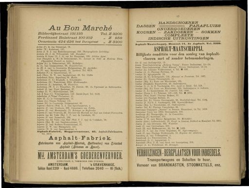 Gebruik tekstcoördinaten Transcriptie 42 A.u Bon JMarché JBilderdykstraat 131,135 Tel . Z 3200 Ferdinand Bolstraat 100/102 „ Z 959 Overtoom 424/426 hosk Sturingsiraat „ z 3300 Artler ^ P .) 2e Jan Steenstraat , 73 . Artler ( W .) Kerkstraat , 137 . Arum ( J . G . J . van ) Rustenburgerstraat , 250 . Pholographische Inrichting . Arutuin ( H . J . di ) Willemstraat , 143 . Stucadoor . Arutuin di Gazar ( H . J . di ) van der Hoopstraat , 122 . Artiste » Agent . Arys ( Pamphile A . M .) 3e Helmersstraat , 31 . Leeraar in Oude en Moderne Talen . ( Specialiteit Fransch en Latijn .) Arijzee ( S .) Ie Helmersstraat , 235 . Melkslijter . As ( A . van ) Linnaeusstraat , 93 . Muziekleeraar . As ( M . J . van ) Ie Constantijn Huijgensstraat , 53 . Apotheker . As ( W . van ) Martelaarsgracnt , 13 . Apotheek . Tel . 8673 . Asbacher ( V .) de Génestetstraat , 10 . Asch ( Mevr . M . W . van ) Sarphatistraat , 38 . Tel . 10464 . Aschebrock Prins . Eapenburg , 36 . Modes . Ascherman ( C . C .) Ringkade , 4 . Schoenmaker . Ascherman ,( H .) Westerstraat , 2S2d . Klokkenmaker . Ascherman ( J .) Javastraat , 98 . Electricien . Ascherman ( W . C . J .) Palmstraat , 79 . Fabriek : 60 . In Pepermunt en Suikerwerken . Asdonk ( J . van ) Pieter Baststraat , 27 . Aselage ( C . W .) Bilderdijkstraat , 108 . Ash & Sons ( C .) Weteringschans , 149 . Dental-Depót . Tel . 8116 . Ashathaler ( J.)'Graaf Florisstraat , 31 . Asjes ( G . J .) Ie Oosterparkstraat , 12 . Asman ( A .) Nieuwe Tolstraat 115 . Asman ( G .) Ie Constantijn Huijgensstraat , 80 . Asperen—Stokvis ( Wed . A . J . van ) Spoorbaanstraat , 4 . Asperen ( C . van ) Overtoom , 232 . Commissaris van Politie . Asperen ( C . van ) Bloemgracht , 73 . Behanger en Stoffeerder . Asperen ( O van ) Overtoom , 28 . Directeur der Maatsch . tot Expl . van Cement-Ijzerwerken Asperen van der Velde ( Mej . C . P . van ) da Costakade , 58 . Asperen ( F . van ) Nassaukade , 122 . Asperen van der Velde—van Heel ( Wed . F . J . van ) da Costakade , 58 . Asperen ( Mej . H . van ) Haarlemmerstraat , 71 . Asperen ( J . van ) Bosboom-Toussaintstraat , 67 . Asperen ( J . W . van ) Bloemgracht , 121 . Asperen ( W . B . van ) Spoorbaanstraat , 4 . AspliaH.F'abrieli , Kogg-eveenstraat , 65 . Asphalt-Fabrikanten . ± 61 . Zo La , Asphalt-Fabriek . I GQËDËRË1 INGA VAN EYSIN ' s GRA \ Telefoon 2040 - ( 6 ( Sch .) DIRECTEUR : C . TAMMINGA VAN EYSINGA AMSTERDAM , ' s GRAVENHAGE Noord 2201 - NoQrd4686 fabrikanten van < Asphalt-^astiek t § af&naderij van $ rinidad ( Asphalt (£ itamen en ( gpuré ). 43 HANDSCHOENENDASSEN = PARARLUIES ONDERGOEDEREN KOUSEN - ZAKDOEKEN - SOKKEN COMJPLEETE INDISCHE UITRUSTINGEN Asplialt-Maatscliappij , Damrak 74 , Mn jtsphalt . Tel . 3339 . ASPHALT-MAATSCHAPPIJ . Billijkste conditiën voor den aanleg van Asphalt- yloeren met of zonder betononderlagen . Ass ( J . van ) Zeeburgevdijk , 12 . Assam Thee-Onderneming „ Bodjong Terong ". Nieuwe Doelenstraat , 12 — 14 . Assam Thee-Onderneming „ Pasir Bitoeng ". Nieuwe Doelenstraat , 12-14 . Asscher ( A .) Johannes Vermeerstraat , 4 . Tel . ' Ma 536 . Asscher ( A . J .) Plantage Parklaan , 26 . Asscher ( B .) Spiegelgracht , 19 . Asscher ( B . E .) Keizersgracht , 723 . Advocaat en Procureur . Tel . 1967 . Asscher ( E .) Nieuwe Prinsengracht , 47 . Asscher ( Mej . E .) Frans van Mierisstraat , 104 . Asscher ( Elisabeth ) Ruyschstraat , 42 . Onderwijzeres . Asscher ( E . J .) O . Z . Voorburgwal , 211 . Agent in Tabak . Tel . 376 . Asscher ( Mej . H .) Frans van Mierisstraat , 104 . Onderwijzeres in teekenen . Asscher ( I . J .) Sarphatistraat , 23 . Juwelier . Tel . 8640 . Asscher ( Firma I . J .) Tolstraat , 127—129 . Tel . ' M . 2255 . Asscher ( Wed . Jacob ) Plantage Badlaan , 21 . Asscher ( Jo ) Plantage Badlaan , 21 . Asscher ( Jos . E .) Nieuwe Heerengracht , 93 . Meubelfabrikant . Tel . 5194 . Asscher ( J . P .) O . Z . Voorburgwal , 332 . Sigarenfabrikani . Asscher ( Mej . L .) Ruyschstraat , 42 . Onderwijzeres ^ Asscher ( Sal . E .) Plantage Franschelaan 32 . Assecuranz Compagnie „ Mereur " in Breinen . Binnenkant , 24 . Tel . 1639 . Assecuranz Union van 1865 . Heerengracht , 456 . Asselhergs ( E .) Weesperzijde , 41 . In Comestibles . Asselbergs ( F .) Kerkstraat , 201 . Asselen ( J . H . vau ) Nieuwe Spiegelstraat , 60 . Melkslijter . Asseler ( Gebr .) Gelderschekade , 19 . Koopl . in Linnens , Zeildoek en Manujact,ft \. 5901 . Asselm ( J . van ) Overtoom , 235 . Winkelier . Asselt ( C . van ) Ceintuurbaan , 200 . Asselt ( H . van ) Hobbemastraat , 26 , Tel . ' M . 1480 . Asselt ( H . P . van ) Jan Pieter Heijestraat , 97 . Siga'enmagazijn . Asselt ( P . van ) Plantage Muidergracht , 19 . Kapitein der Artillerie . Assenberg ( J . van ) Tolbrngstraat , 5 . Assenbroek ( A .) Transvaalstraat , 31 . Assenbïoek ( L . J .) Ingogostraat , 6 . Assendelft ( Wed . F . H . van ) Jacob van Lennepstraai , 203 . Asseper ( A . A .) Tichelstraat , 40 . Behanger . I Transportwagens en Schuiten te huur . Vervoer van BRANDKASTEN , STOOMKETELS , enz .