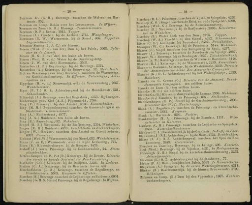 - 20 — — 21 — Bierman Jr . ( G , H .) Heerengr . tusschen de Wolven - en Har- tens Ir . 852 . Bierman en Comp . Rokin over het Leesmuseum . In Wijnen . Bierman en Zoon ( G . H .) Bloemgr . Commissionairs . Bierman ( D . P .) Reestr . 1913 . Tapper . Bierman ( J .) Vijzelstr . bij de Kerkstr . 4746 . Waagdrager . Biermann ( H . W .) Warmoesstr . bij de Niezel , 666 . Tapperen Logementhouder . Biesman Simons ( J . J . G .) zie Simons . Biesen ( Wed . P . G . van der ) Dam bij het Paleis , 3068 . Split- ster in de Loterij . Biesen ( H . G . F . van der ) ten huize als boven . Biesen ( Wed . H . v . d .) Water bij de Oudebrugsteeg . Biesen ( J . W . van den ) Bloemmarkt , 3505 . Biesterbos ( J . P .) Reguliersgr . bij de Heerengr . 5374 . Biesterbos ( A .) Keizersgr . bij de Brouwersgr . 12 . Med . Doet . Biet en Braskamp ( van den ) Heerengr . tusschen de Warmoesgr . en Gasthuismolensteeg . In Effecten , Beleeningen , Assu- rantiën enz . Biggelaar ( H . v . d .) ïïieuwendijk over de Vrouwensteeg , 2067 . Winkelierster . Bigot ( P . T .) O . Z . Achterburgwal bij de Munnikenstr . 581 . Schoolhouder . Bilderdijk ( J .) Heerengr . over het Besjeshuis , 4553 . Rijksweger . Bindernagel geb . Kiel ( A.E .) Pijpenmarkt , 3704 . Bing ( V .) Prinsengr . bij den Amstel , 6160 . Kunstschilder . Bing ( M . M .) Zwanenburgwal tusschen de Groenenburgwal en Staalstraat . Commissionair . Bing ( A .) Muiderstraat , 4977 . Bing ( J . A .) Muiderstr . ten huize als boven . Bing ( II .) Rapenburg ,•' 32 . Makelaar . Bingel ( B . F .) Nieuwend . bij de Baafjessteeg , 2394 . Winkelier . Binger ( M . H .) Kuiderstr . 4973 . Leesbiblioth . enBoekverkooper . Binger ( W .) Kerkstr . tusschen den Amstel en Tltrechtsehestr . 6091 . Procureur . Binhout ( Wed.W .) Warmoesstr.bij den Niezel,G83 . Winkelierster . Binns ( J . en E .) Warmoesstr . over de wijde Kerksteeg , 727 . Biorn ( B .) Kloveniersburgw . bij de Hoogstr . 1479 . Bishoff ( J ) korte Prinsengr . bij de Eenhoornsluis , 24 . Steen- ■ plaatdrukker . Birrius Campen en P . Pet(D .) Keizersgr . bij de Reestr . Directie der eerste en tweede Sociëteit ter Zce-V crzekering . Bischofer ( Geb .) Kalverstr . bij de Duifjesst . 3324 . In Lederen . Bisdom ( C . A .) Keizersgr . bij de Beerenslr . boven 485 . BisscliofTsheim ( L . R .) Keizersgr . tusschen de Reguliersgr . en Utrechtscheslr . 5503 . Koopman in Effecten , Bisschop ( H .) Heerengr . tusschen de Bisschop ( G . M.S . Steins ) Prinsengr . bij de Reguliersgr . In Wijnen . Bis.chop.(H . L .) Prinsengr . tusschen de Vijzel - en Spiegelst , 4230 . Bisschop ( C . 0 .) Singel tusschen de Heist , en oude Spiegclstr . 499Ü . Bisschop ( Wed . G .) Heerengr . bij de Romeinsarmsteeg . Bisschop ( R .) Nieuwendijk bij de Baafjessteeg , 2393 . Kleederma - ker en Winkelier . ttisichoD ( H.ï Water hoek van den Dam , 2795 . 7 apper . Bisschop W.A .) Vijzelstr . bij den Singel , 4392 . Schoenmaker . B tter ( C . D . der Amsterdamsche derde Zee-Assuraniie Compagnie . Blancke ( G .) O . Z . Achterburgwal bij bet Walenpleintje , 2399 . Makelaar . , . , „ , Blanoke en C . Croese ( G .) Directie van de Amslerd . Brand - Assurantie Compagnie , ten zelfden huize . Blancke en Zoon ( G .) tea zelfden huize . Blancke ( H . 0 .) ten zelfden huize . Blancke Gz.(G .) Kloveniersburgwal bij de Raamgr.3996 . iKoAefaor . Blancke ( G ,) Elandstr . bij de Prinsengr . 897 , Stalhouder . Blanckenhagen ( H . P .) Singel bij de Gasthuismolensteeg , 4908 . Directeur der W.I . Maatschappij . Blank ( A ) Reguliersgr . tusschen de Prinsengr . en Utrecntscne - dwarsstr . 5642 . Koopman . Blank ( A .) Hartenstr . 1896 . Poelier . Blankemeijer ( M . A .) Prinsengr . bij de Elandstr . 1111 . Win * kelierster in Katoenen . Blankert ( 0 . H .) Prinsengr . tusschen de Leijdsche-en 3503 . Kostschoolhouderesse . Blankert ( C . J .) Haarlemmerdijk bij deOranjeslr . InKoffiy en Thee . Blankhart ( J ) N.Z . Achtcrburgw . bij de Molst . 2752 . Boekdrukker . Blaser ( J . J ) N . Z . Achterburgwal tusschen het Spui en Ros - kamsteeg , 3849 . Decartiseur . Bleecker en Joosling , Heerengr . bij de Leliegr . 400 . Kassiers . Bied ( Wed .) Heerengr . bij de Vijzels ^. 4631 . In Modegoederen . Blekkingh ( J . H .) Singel bij de korte Gasthuismolensteeg , 3252 . Artsenijmenger . Blekman ( E .) O . Z . Achterburgwal bij de Stoofsteeg , 77 . Bleuse ( P . J .) Dam , bezijden het Paleis , 5063 . In Manufacturen . Bleijkman ( A .) Spiegelgr . bij de eerste Weteringdwarsstr . 4311 . Biieker ( B .) Haarlemmerdijk bij de binnen Brouwersstr . 5/00 . Blikslager . Blikman en Comp . ( H .) Dam bij den Yijgendam , 1667 . Kantoor * boekverkoopers .