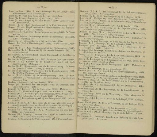 — 30 — Bo8«e en Zoon ( Wed . J . - van ) Keizersgr . bij de Leliegr . 3480 . Commissionair in Assurantiën . Bo6se ( J . P . Tan ) Ten huize als boven . Makelaar . Bosse ( J . T . van ) Heerengr . bij de Leliegr . 3180 . Bosse ( A . van ) Singel bij de oude Lelieslr . 5180 . Commissionair in Assurantiën . Bosson ( H . de ) H . Z . Voorburgwal bij de Huiszittënsteeg , 316G . Bosson ( C . de ) Singel tusschen de Gasthuisraolen - en Romeins *- armstegen , 401 . Makelaar . Boswel ( L.C .) Kalverstr . hoek Jongeroelensteeg , 3051 . InUzer - ■ waren . Boswel en Reijdon , Brouwersgr . tusschen de Heerengr . en Singel , 5388 . Wynkoopers . Boswel ( J . J.)'Zwanenburgwal bij de Staalstr . 4200 . Boswel Jr . ( L.C .) Blaauwburgwal , 5262 . Winkelier in IJzer- waren . Bothe ( F . F . J .) W . Z . Voorburgwal bij de Lijnbaansteeg , 2480 . Bottemöller ( J . H .) Bloemstr . bij de tweede Dwarsstr . 2497 . In Grutterswaren , Boterhoven ( R . van den Bergh ) smalle Bloemmarkt bij de Stilsteeg . In Bloemzaden . Bottier ( A.M .) Weesperkerkstr . 6232 : Bank van Leeninghoudster < Bottier ( G . J .) Kerkstr . bij de Reg.uliersgr . naast het Oude Vrouwenhuis . Makelaar . Bottier ( J . H .) JVieuwendijk over de Karnemelksteeg . In Stroo - en Spanen-Iïoeden , Garen , Linten eng .' Boltier en Breuking , Warmoesstr . bij de Papenbrugsteeg , 190 . In Wollen Goederen en Kousen . Botvis ( J . C .) Rokin bij de Olieslagerssleeg , 3971 . In Par - kamenten . Trommelvellen , Buitenlandsche Papieren en Speelkaarten . Bouberg , Prinsengr . bij den Amstel , 6176 . Bouge geb . Bouwens van der Boijen ( Wed . de ) Raamgr . hoek Groenenburgwal , 3985 . Bouhoff ( G .) Keizersgr . bij de.Spiegelstr.-3229v Makelaar . Bouhuijs ( J .) Kloveniersburgwal hoek van do Koestr . Tapper . Bouhuijs ( G.J .) Groenburgwal bij de Raamgr . 4071 . Wondheeler . Bouhuijs ( J .) Kalverstr . bij do Munt , 4260 . Tapper . ISouman ( L .) Kloveniersburgwal bij de Raamgracht 3812 . Assu- radeur . Bonman ( L . en C . A .) Ten huize als boven . Directie van de Amsterdamsche Zee - en Brand-Assurantie Maatsclmppij . Bouman ( A .) Keizersgr . bij de Ulrechlschestr . 5510 . Bouman en Zonen ( A . F .) If . Z . Voorburgwal bij den Bam , 3084 . In . Yerfmaren . I Bouman ( H .) Prinsengr . tusschen den Amstel en Ulrechlschestr . 6180 . Ads . Dir . van Stadswerken . " V > jt Bouman ( J .) Schans bjj de Weteringspoort , 4524 Koormnolenaar . - 31 - I^Te^si ^' \ .^'^ b ' J •*• Schoorsteenvege ,,, ■ steeg , dobo . Kistenmaker . ■» - •' ■ Bouman ( P . B ) N . Z . Voorburgwal bij de Stilsteeg , 3101 ■ Bourette ( P .) Heiligenweg hoek Bandboogstr BalrMnjL , ■ Bourrier \ s . B ; J ) Amstel b,j de HalvemafnsleegS ' Bet ™, I selpapter/abrikant . & ' '' a « nang <- " Bourrier ft V 1 W ° Tenie " b ™»™.! b « de Zand8tr - 3786 . Jiourrier ( P . J .) Warmoesstr . bij de PapenbrugsteeE 1314 Fainek van BeJiangsetpapier 8»«eg , i<M *. Courier de Oude ( P . J .) Reguliersbreestr . bij de Bolermarkt 48.0 . Fabriek van Beh.angselpapior öoleimarkt , ■ ourier ( S .) Keizersgr . bij de lleerenstr . 4164 . Fabrikant inBehangselpapieren . auriham zn teoursault ( F . WO Heereqgr . en hoek van de Beulingslr 6031 IBoursse ( J . G .) Heerengr . bij de Huidenstr . 5994 S '' ' Bousquet geb . Enschedé ( Wed . P Hl K^,L i •• j I " Spiegelstr . 3229 . Schatster . ' Kei2ers S r - * 0 de IBousquet . ( S .) Keizersgr . tusschen dq Huiden - en Wolvenstr 1 Makelaar zn Suiker . "( uvenstr . J , H I v J ' } * eurs j l ** S bij de Krornelleboogsteeg , 3024 In Snif en Vtce-Consul van BraxiKèn . S ' ' ri£'J }^]^*)^™*'«, 3585 . Gros - f 0a lte { enl^:T ST - 9 * Beu > W ° > 5027 . Makelaar en ' BBouwer ( J ) Keizersgr . bij de leijdschegr . 3002 , ^ KiViiJSr * dVG -' So'en^ee S ) 4905 . Bovenkerk ( Wed J ) < if \ , l S n *?**«* m 4cc§nsen . ■ [ 5012 . Tkbü e S » St %: B,eeS ' r - *? de St <*- voWecg , J " tSLlw *■> "•"'•«-. eidök M de Bommerstr . 2384 , f 0UW S;'r n ( C - *° Br °™ S - tij de Goudsblocmslr . g f 0V 1wS;i OkinI,i:ideWater8 ^' 3633 - Xoopmanin f aa lt . ( J - F - ) KalTerStr - °™ de N-Z-Kapel , 3765 . Kleeder , r^i^rle ^ C - ™> Prin3en ^- k de Leliegr . 3522 . tract ï J H D )" D e oëlén ,? 23 4 /^ *" ^""^ d " ^ clen . t^oo ^ ^^^^^^:^&. r e Xr:^7o7pllan Mea ** **"« ™ ^ M «