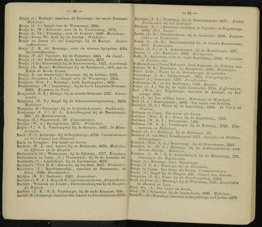 - 40 — Bruijn ( J .) Rozengr . tusschen de Prinsengr . en eerste Dwarsstr . Makelaar . Bruijn ( C . 1 .) Singel over de Warmoesgr . 2994 . Bruijn Jr . ( W .) Kalverstr . over de St . Luciensteeg , 3775 . Bruijn ( G . Th .) Prinsengr . over de Kruisstr . 3490 . Makelaar , Bruijn ( Erven W ). Kolk bij de Zeedijk , Winkelier . Bruijn en Zonen ( C . de ) Looijersgr . bij de Baangr . Suiker - raffinadeurs . Bruijn ( C . H . de ) Heerengr . over de nieuwe Spiegelstr . 4014 . Suikerrojfinadeur . Bruijn ( P . de ) Vijzelstr . bij de Prinsengr . 4844 In Snuif . Bruijn ( A . de ) Buitenkant bij de Kalkmarkt , 2873 . Bruijn ( A de ) Rieu wendijk bij de Brouwersteeg , 1427 . Goudsmid . Bruijn ( D . Mersie ) Buitensingel bij de Raarapoort , 410 , aan de Molen de Ronde Leeuw . Bruijn ( J . van Oosterwijk ) Heerengr . bij de Leliegr . 2552 . Bruijn ( Gezusters J . C .) Singel over de Warmoesgr . 2994 . Bruijnen ( Wed . P .) Heerengr . boek Koningsplein , 6081 . Bruijnesteijn ( W .) Leijdsnhegr . bij de Korte Leijdsche Dwarsstr . 6693 . Koopman in Turf . Bruijninck ( G . E .) Blomgr . bij de tweede Dwarsstr . 2767 . School- houder . Bruijning ( B . T .) Singel bij de Schoorsteenvegerssteeg , 3232 » Makelaar . Bruijning ( I ).) Prinsengr . bij de Leijdschekruisstr . Boekhouder . Bruijnings ( P . C ) O . Z . Achterburgwal bij de Monnikenslr . 900 . In Manufacturen . Bruijns ( H .) Shjpsteenen , 30 Coneooilooper . Bruijns ( W . A .) Egelantierstr . 3874 . Winkelier . Brijce ( A .) O . Z . Voorburgwal bij de Hoogstr . 1407 . In Manu - I facturen . Bach ( F . C ) Keizersgr . bij de Reguliersgr . 4712 . Commissionair en Vice-Consul van Hanover . Buch en Spengler . Ten huize als boven . Buchcm ( II . J . van ) Amstel bij de Bakkerstr . 4695 . Makelaar in Effecten en in Hoepels . Büchenbach ( E .) Warmoesstr . bij de Pijlsteeg , 1217 . Koopman , I Büchenbach en Comp . ( A .) Warmoesstr . bij de St . Annestr . 42 . I Buchholtz ( C .) Lcijdschcgr . bij de Lijnbaansgr . 6610 . Buchholtz ( Wed . D . H .) Kalverstr . bij den Dam , 3047 . Winkelier . Buchholtz ( F .) Haarlemmerdijk , tusschen de Dommerstr . en Plein , 2396 . Broodbakker . Büchler ( D . D .) Doelenslr . 2243 . Assuradeur . Buchler en W.E . i . Berg ( D.D .) ten huize ais boven . Assuradeurs . I Buchler , Wennink en Awater , Fluweelenburgwal bij de Hoogstr . I In Wijnen . Buchler ( J . IS .) O . Z . Voorburgw . bij de oude Kennisst . 856 . ' Buchli ( M .) Prinsengr . tusschen den Amstel en Utroch tschestr.61 54 . I — 41 — f aoh 469 r 2 . ( ^ ) ^: r ; sr - tusschen de w & « ****«*. W^laktr^l f T ! tre ;, htsch03 "- I ^ keizersgr . 5858 . BankeU banker en ( Jonjiturier . ■ Budd 1 e t ; 4 r - ( G-D .) Haarlemmerdijk b,j de binnen Brouwersstr . H ^ ion . Koefcoakker * „ Buëno ( E C .) 0 Z Achterburgw . b,j de Munnikenstr . 897 . '^ l- ren n ( fv y ? n ) Muidei ' 8tr - a»6 - Heelmeester . W in Prfn!èn"enl 0Ver *" J ** K * P ehtee 8 > 3768 . Winkelier • Buffa en Zonen ( Frans ) Kalverstr . hoek Gapersst . in Prenten ens , ■ SM h K w"T "; h i Bo0m8lo °' > a09 G ' Winkelier KlnL , / ^ ' t blJ , d6 L 0u(lcnbr « S8t . Kooplieden . Knlwr D A ( r J - B - } ^«' Vkakwlo , I?el Scheepstagrijn . ■ Bukhof ( J .) Laur.erstr . 1307 . Broodbakker . ° J « uhrmann ( H ) in het Kattengat . 154G . Kuiper . Eun\(L ItM 8 *" d , 6 WlJde Lombard » l - 2154 . Koffermaker.W i«5 •. 535o ! Re3ul,er8 S r - tussche ° de Kerkstr . en Kei- Bul ! II r'l vT - Z6lfde " ^ feïi *•*"*»«■ on Makelaar . K 1 in W pTJg 8 ?' 6 ", '■ ^ i ' Ten huize Tan Frielink . ■ Trliifn :. ° 6r J dS Ka P ° l8 ' ee 6 ' 1634 . In Visch en Bultman en Comp . Ten huize als boven » u tman ( Wed . H . F .) Water bij de Kapelsteee 1RT5 pullman ( W . D . F .) Stroomarkt , 1494 . PS ' ■ Jultman ( W . D . F ) Voorburgw . bij de Molsteeg , 2720 . Tim - merman en Makelaar . " ' ■ Punck ( G . C .) Keizersgr . bij de Huidenstr . 18 . «^ Bunders (- J . van Deijl ; Grimburgwal 1978 . Optische en Brillen - ( r(a a en stiyper . [ Tecum lAbita VaSfn J G " thü »»° l«»t . °™ r f n tL ( ^/ ii,t '^ rburew - bü de M - ta *. ™' Punge re .) Heerengr . hoek Warmoesgr . Punge ( J . P . G .) Keizersgr . bij de Heerenstr . Jünfe n \ T P ' . 1 ?" i 1 "^ al " b0Ven - ^ missionairs . rVn^Jde^l 2r ngr - b ' j ^^-^ kooplieden K Un i k y&'S 3 ') Ten huize als h °* en . CkWr/w^P , '' enSr - bii de ^««'• che.lr . 3500 . Makelaar . iunk wz . ( W .) Pnnsengr . tusschen de Reguliersgr . en Vijzelstr . 4870 .