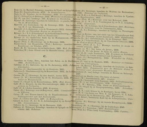 - 44 — — 45 — Buijs ( A . A . Martini ) Prinsengr . tusschen de Vijzel-en SriiegelsICalkoen IV I KpWpr .™ «.„.„ ï „ j „, , Buijs ( H .) Reguliersbreestr . 4576 . In Gmtterswaren . ' & ■ SS »* ) A ' ;"/,'„ v l " ^° Wo1tc "- e " Hartenstraat , Buys Jr . ( P . V.jzelstr . bij de Prinsengr . 4838 . HorologiemakAkoea's . j!v dTolDoK fff ' . , Bijl ( C.)Leliegr . bij de Heerengr . 3183 . Winkelier en ff oekbind , 3 en ieèulimniein «« ° ''' tussche ° d « V.jzelstr . Bijl ( P . van der ) Lindengr . 188 . Koopman in Steenkolen . Calkoen ( Wed W 1 KpwJ ™', i . x » , Bijlaart ( H .) Keizersgr . tusschen de Leidschestr . en gracht . 298Calkoen PC W ) \ 7 £ V he ' M . ol ?" Pad , 5960 . Op de West-Indien . 1776 zèepzilde Voorbur & wal b.j de JV . Z . Armsteeg , Bjjleveld ( J .) Leidschestr . bij de Keizersgr . 3123 . Ten huiCalkoen Hz ( H.)Achterer bud * TT *™ iw u „<,.. van B . J . van Blijenburgh . Calkoen tl l XrhtJzl S i -. F , eoh,8ohes ' r - 6317 . Jtfaiefoar . Bijleveld ( J . C.)Keizersgr - ove.r de Westermarkt,2912 . Ontvan^^tUGi^^^'l^T 1 ^^ 6324 - der In - en Uitgaande Regten en Accipisen . 4280 . Frlnsen S r - tusschen de Vijzelgr . en Weteringstr . Bijlsmit ( A .) N.Z . Achterburgw.hijdeGastb'uismolensteeg , 32(Calvelage'en Revius aan W »;„^» i . , ! , Koopman in Turf , Hout en Steenkoolen . * Caminh ! f D I PrYnsen ^ 1^1 f T . T .^ ^" ap^turger Pad . Bijlsmit ( J . F .) Geldersche Rade bij de Bantammerstr . 27KaminSa j ".' J ( ï ) uÖ .^ Wt '. 6810 - ***"**««-. f oapM » M firimutm Bamman ( A . ) U rechlschestr bt H , n , u "?^ 5837 " Bijpost ( Wed . J .) Brouwersgr . bij de Heerengr . 5608 . f In Èom-en EiscT Waren ^ Utrechtsche dwarsstr . 6208 . Bijnkershoek van Hoogstraten ( Wed .) Keizersgr . tusschen Cammann ( Wed J r vï"*i , V ? : Reguliersgr . en V.jzelstr . 4717 . | tweede dwarsstr ' Èm '' Bloem ^- tu ? 8ohen de eerste en Bijrde ( H . M .) Keizersgr . bij de Leijdschestr . 2985 . Med , tfodCammann tl . W.l Ten hn'in . « 1 . h „ OM B.jsterbos(W .) Oude Schans over de Montalba'storen . Mvootfuamum ( F . W Vals boven & V ° ' 2 f 9 ' Camozzi f ! ni',7 " 0Te , n . / n ■%"« «» andere Souten . ïnTnLV n e Te ,«'»»> en , 232 Koopman en Fabrikant C r»™l ? ï ^ Consul Generaal ™* Oostenrijk . """""" f ^ P^J^Haringpakkerij , 1323 . WinkeLr in Talak , * lss . ^ oeZï;k ^: msc}iea het Pa,eis en de * ai ^ mp : vt:y!Zo de Raamsir - em *•*** « **^ steeg , 4028 . f*»P»^gS?g ^ tusschen de Leijdsche - en Spie - Cadenne ( J . P .) Kalverstr . bij de St . Jorissteeg , 4028 . D - ai - '" «• P l ^ 8 . en - pluiomakcr . Cadovius ( J .) Haarlemmerdijk bij de Oranjestr . 2081 . I Directeur V™*1 ? JT\~°?'Z ? J -"'" ae mint . Cadovi„s(J .) Haarlemmerdijk bij de Brouwersstr . 5692 . InTaMkm^^^y ^^' Maatschappij . Snuif enz . I 3]87 ' Caenen ( W . C .) Prinsengr . bij den Amslel , boven 6174 . Campenhout en Staelin Caesar ( F . W .) Wieuwendijk bij de St . Nicolaasstr . 2592 . WCampert ( W .) Goudsblo keiier in Manufacturen . Gampert(J .) Vinkenstr , CaeSar ( C .) Singel bil de Rnnmnlpnsfpno - K5f79 ._ Ma/J rtnr.tnr Carrxno l \ M T J _\ ut Snuif enz . [ 3187 . ' J-enegr . tusschen de Heeren en Keizersgr ., dumpen m?r Sla ? l ", ( Van ) Ten hu " e a,s b ° ven . - ■"/ ac'uren . 7 ^^^^ T^o ""- #?£ S Caesar ( C .) Singel bij de Roomolensteeg , 5372 . Med . Doctor . Camps ( W . J . d e l Noordprm . IV^Ve-orf ' In Grutterswaren.- Caffd ( M . J .) Hoogslr . bij den Kloveniersburgw . 3662 . In DnCvadé ( C W ) Halstee ^ i ™ ■ n i ^' drager . gerijen en Ver/waren . Candé ( E .) Singel bii dV K„Ü ; f ."" Zi ! ™ rsmidsu>erk . Caffé ( E . J .) Joden-Amstelstr . 4509 . Koopman . I deresse . J Kor « J ell PoorUtee6 , 5380 . Schoolhoud Cahen ( Jh .) Keizersgr . over deBesjestuin , 4889 . CommmiwCanne ( J . R .) ou d e Schqna .,•• , „ . J , in Effecten . Canne H 0 ) ten ho " w a Konin S 8(r - ho ™ n 3194 . Caloar ( H . van ) Binnen-Amstcl bij de Reguliersbreestr . 4ff # terburgwnl bii de Ba'rn'd ^!»' oil "" E S mond ' °- Z . Ach - Penningmeaster aan het Fabriekambt . Ganne en Balwd Gelripi .^ v j ' iJ - .' w V n tooper . Cales ( J .) Joden-Amstelstr . 4497 . In Modegoederen . [ gadoors . ' ! JQerscne Aade bl J de Schreijer«loren . Car - Calisch en Zoon ( N . J .) O . Z . Achterburgwal bij de Kreupeifiinnegieter ( H .) Ro7Pno-r h ;, j . * , «, 162 . Convooiloopers . X Makelaar gr ' bf > de tweede Bloemdwamtr . 2359 .' Calkoen ( G . C .) Keizersgr . bij de Beerenstr . 1149 . Oannenburg ( W . V .) Hepr Pn ^. k - j r ■•, , scheslr . 346 . Makelaar Calkoen ( J . Walraven ) Prinsengr . tusschen de Spiegel-en LejCanongette ( V .) ViieenH»m ié « J d ^ e , J d8ohe S r ' 2943 . «"•• ^" ta ( Wed . E . wS!l l 635 , s <> ckv er kooper . l^rouwensteeg , 1908 . TaptfeK i i ™. 1 ,.^ y»ater h 00 ^ Vrouwensteeg , 19 (