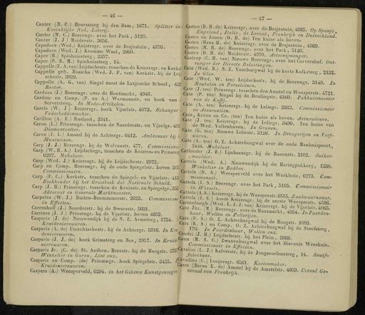 — 46 — - 47 — Canter { M.C ) Beurssteeg bij den Dam , 1671 . Splitter *»< Gastro ( D . H . de ) Keizeraar OWf J.B „' , ■ , Mr Koninklijke JVed . Loterij . * Eneeland ïi„K*J . r Besiesluin , 4885 . Op Spanj Canter ( M . C ) Heerengr . over het Park Canter ( J . J .) Muiderstr . 5056 . Capadoce ( Wed .) Keizersgr . over de Besjestuin Capadoce ( Wed . J .) Kromme Waal , 2660 . Caper ( H .) Spinhuissteeg , 2357 . Caper ( P . R . M .) Spinhuissteeg , 14 . Canter ( H . C.j Heerengr . over het Park , 5120 . Cast ™ Tz „„ ' mi ' t fe?E '. F ^ krijk en uitschijn & S : n H H d e neXrf ovrLfp^^iS ' im - Ont - Cappelle ( F . A.van ) Legdschcstr!lachen de Keizersgr . en Kerksl Cate jvvfd bT N 7 V ™ W TT - , . C*ppefe gei . Bosscha ( Wed . J . P . van ) Kerkse bij de Te ! * In Glas VooiWgwol hg de korte Kolksteeg , 2132 achestr . 3029 . J Gate ( Wed W i„„l i - i i . Cappelle ( A . G . van ) Singel naaat de Latijnache School , 428 Èeubel m 7 en PolsSen h ' 3 de He ™ S r ' 3149 . /„ Castrop ( C . H . van Nieuwe Heerengr . over ' het Corvershof vanger der Directe Belastingen . Cale ( fp te llT r i ? S6n ? r l t . U !, Scl , 1 ? n den Amslel °« Weesperstr . 4721 , Jan d TLw ëel * deBeuli ^'- 6160 . BaLuismtfer , & le i A ^" i^tr rSSr - ^ de Leliegr - 2863 - ^ missionair Ste e '( j r0 t e „) e K C0 , ( ' en ) J ™ huize als boven . Assuradeurs . «■« aie ij . ten ) Keizersgr . bi de Lelieer 34<m T.r . ü • I de Wed Vóllenhoven . J /„ « CSE " " hU " 6 Ta " we ( br . t en j flieuwe leüestr . 3126 . waren . Recto Cardozo ( J .) Heerengr . over de Houtmarkt , 4948 . CaTdon / en Comp . ( P . en A .) Warmoesatr . en hoek i Servetslceg . In Mode-Ar'tikelen . . Garels ( W . J .) Keizersgr . hoek Vijzelstr . 4073 . Behan Vederbeddenmaker . Carillon ( A . E .) Rusland , 2341 . Caron ( L .) Prinsengr . tusschen de Noorderalr . en Vijzelgr . 492 In Droogerijon en Verf - Diamantzetter . Caron ( J . L .) Amstel bij de Achtergr . 6412 . Ambtenaar bij » L . Muntwezen . Cate ( A . ten ) O 7 i ut v . i Carp ( J . J .) Heerengr . b,j de Wolvenstr . 477 . Commissions 2444 . Makelaar ^ 0TW de oude Manhuispoort , ^^^ i^^-^^^^'^'^^^^J ^) ^ nbaansgr . bij de Rozeast , 2102 . Suiker- Carp ( Wed . J .) Keizeragr . bij de Lcijdschcstr . 29172 . Catrela ( Wed . A .) NieuwendiiW h ;; J » w • , ■ " SiA ? Carp en Comp . Heerengr . bjj de oude Spiegelstr . boven 505 Ü Winkelier in Bedden J Hann SPakker.j , 1350 . Commissionairs . Cattela ( 1 ). S .) Weesrwi-vpU „»». ï . « r ,, . Carp ( F . C .) Kerkstr . tusschen de Spiegel - en Vijzelslr . 413 '' missionair . VVees P erveld over ne * Werkhuis , 6273 . Com - Boekhouder bij het Grootboek der Nationale Schuld . Glttela , ( J . S .) Heerengr . over h P t P»rt cine s , Carp ( J . H .) Prinsengr . tusschen de Kruisstr . en Spiegelgr . 355^1 in Wissels . Advocaat en Generale Marktmeester . «* ttela-(A.S .) Keizersgr . bij de WeesDcr,tr « si * 7 % :.„.__ ,-. p ? bölo :_- z «■ B-kwaarnemor . Advocaat en _- Carpeles ( W . J .) Buiten-Bantammerstr . 2823 , Commission Cattela'(J : . s ') korte'Keize in Effecten . Cstlenburgh ( Wed L J I v i ' i J - i . Weesperstr . 4586 . Carrenhoff ( J .) Noorderatr . bij de Dwarsstr . 5031 . <*** ^- ( m ) Heerengr . o'veri W^'w bg d « V Ü le Istr . 4065 . Carrière ( J . J .) Prinsengr . bij de Vijzelstr . boven 4852 . j haa r , Wollen en Belteriien JnBaarden - Cup ï!!jf :-^ Mieu - endi,k h.j de 1 ». Z . Armsteeg , 1754 . /-$£ g - 8 .) 0 . Z . Aohterbar^wal b « de Hoogstr . 1093 . ■>■■» ar : — i " cv lur ", oiuo . Commissionair Cat : Kruideniers-waren . R . S . 170 . ■ I en Comp 0 Z A >.( h " 00 S ? tr - !««• Catpafis ( A . de ) UtrechUrbestr . bij de Achtergr . 5816 . In Kr »„- 170 . ƒ„ Va a ^ a » A ao V V 0 to«»r , 6W j d ° Stooftt eeg , denierswaren . Caudri ( J . H .) Leijdschestr b h t Pi • Casparis ( J . J . de ) hoek Grimsteeg en Hes , 1957 . In Kruiife ™ ■ (*■ S . C .) Zwanenburgwal oveTbet £ nnV w £ • nierswaren . Commissionair in Effecten - Uiaconie Weeshuia . Casparis / r . ( C . de ) St . Anthon . Brcestr ,: bjj de Hoogstr . 375 * C | lr al'ni ( L . J .) Kalverstrf bri de ' Jan^.^.i Winkelier in Garen , Lint enz . 1 fabrikant . lr ' °' J « e Jongeroelensteeg , 14 . ^ aaiye . Caaparis en Comp . ( de ) Prlnsftogr . hoek Spiegelstr . 3455 . lA v adino ( C .) tooijeragr . 6S61 K a * t „-„ m „ i . Kruidenierewaren . ^" s ( Baron E . de ) Amstel bii 7 ' a " enma/cer - Caapers ( A .) Weesperveld , 6294 . in het Gebouw Kuns.tgenocgc * neraalvan Frankrijk . Amstelstr . 4803 . Consul Ce -