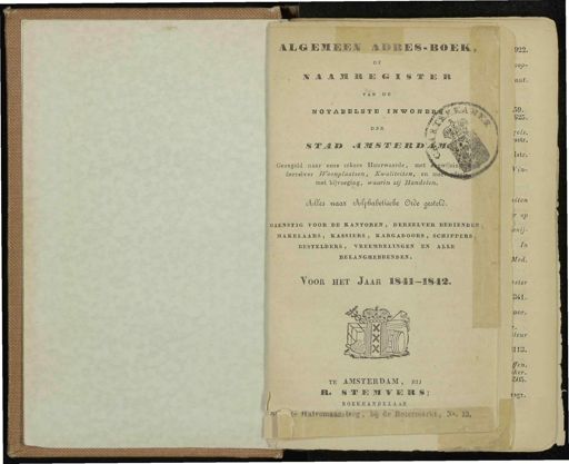 A E « E ME E UT ADRES-BOEKi 822 . staamiieoistei * oop- aat . (. NOTABBLSTE I N W O N E Rjtf tl ¥> w \ if 1 DER STAM » A M S T m Mi & jq^M $& Geregeld naar ecne zekere Huurwaarde , met atnwi;jzin]j | derzelver Woonplaatsen , Kwaliteiten , en mee met bijvoeging , waarin zij Handelen , oJloweó naat cAjfuéafietiocfie StSe ntótcfö . DIENSTIG VOOR DE KANTOREN , DERZELVER BEDIENDEN , MAKELAARS , KASSIERS , KARGADOORS , SCHIPPERS - RESTELDERS , VREEMDELINGEN EN ALLE BELANGHEBBENDEN . Voor het Jaar 1841 - i§42 . TE AMSTERDAM , bij JR . S T E M V E » S ; BOEKBAND EI.U1 ié Italraiiaantteeg , bij de Botermark X °. 13 . . 59 . « 25 . ^ fcls . vsstr . ttstr . Yin - tilen I ° P pnij- ) In Ued . Aster 341 . kor , i , itcur hi3 . ffen . Wier . E05 .