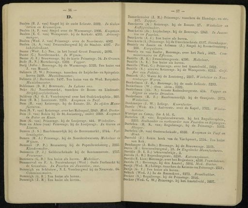 — 56 — l >. Saaien ( H . J . van ) Singel bij de oude Leliestr . 5182 . In Galan- terien en Kramerijen . Daalen ( A . F . - van ) Singel over de Warmoesgr . 2998 . Koopman . Saaien ( E . C . van ) Weesperstr . hij de Kerkstr . 4595 . Artsenij- menger . Saaien ( Wed . J . van ) Prinsengr . over de Noorderstr . 4862 . Baaien ( A . A . van ) Zwanenburgwal bij de Staalstr . 4197 . Ta- baksfabrikant . Baane ( Wed . L .) Nes , in het locaal Groot . Frascati , 2098 . Baaoe ( C .) Noordermarkt . In Wijnen . Baane ( C . F .) Iirouwersgr . bij de korte Prinsengr . 54 . In Granen . Bade ( R . N .) Martelaarsgr . 1302 . Tapper . Baeij ( Jufvr .) Heerengr . bij de Warmoesgr . 5328 . Ten huize van J . van Mossel . Bahmen ( P . W .) Prinsengr . tusschen de Leijdsche - en Spiegelstr . boven 3499 . Muziekmcestcr . Bahmen ( J .) Hartenstr . 1497 . Ten huize van de Wed . Borgstede . Muziekmeester . Bahleman ( B . H .) Heerenstr . In Lakens enz . Bake ( G .) Noordermarkt , tusschen de Doom - en Lindenstr , • Strijhyzerfabrikant , Baldrup ( B .) O . Z . Voorburgwal over het Oudekerksplein , 861 . Bam ( H . R .) Laurierstr . 1218 . Koopman in Turf . Bam ( H . van ) Keizersgr . bij de Runstr . 30 . In zijden Manu- facturen . Bam(B . V . van ) Keizersgr . over het Molenpad , 5949 . Med . Doctor . Bam ( J . van ) Rokin bij de St . Jorissteeg , onder 3989 . Koopman in Boter en Kaas . Bam ( G . van ) Prinsengr . bij de Looijersgr . 444 . Winkelier . Bam en Alers ( van ) Prinsengr . bij de Looijersgr . In Garen en Linten . Samen ( J . S .) Haarlemmerdijk bij de Heerenmarkt , 5744 . Var- kenslagtor . Samen ( H . J .) Prinsengr . bij de Noorderdwarsstr , Makelaar in Wijnen . Bammer ( P . P .) Beurssteeg bij de Papenbroeksteeg , 3285 .' Kleedermaker . Bammers ( P . J .) Gelderschekade bij de Bantammerstr . 2727 . Procureur . Bammers ( G . B .) Ten huize als boven . Makelaar . Bammerval en F . A . Fnrstènhaupt ( Wed ) Oude Turfmarkt bij de Grimsluis . In Vaarlen en Juweelen , enz . Bammigh en Schlutow , N . Z . Voorburgwal bij de Nieuwstr . 64 /] Commissionairs . Bammigh ( G . H .) Ten huize als boven . Bammigh ( J . M.j Ten huize als boven . tusschen de Elandsgr . en sir . Winkelier en In Juwee - I Damschreuder ( J . M .) Prinseng I 517 . Tapper . ; Banckerts ( A .) Keizersgr . bij de Runstr . 27 . I Koffijgeelmaker . I Banckerts (. Jb .) Leijdschegr . bij de Heerengr . 2948 len en ï'aarion . Banckerts ( J . J .) Ten huize als boven . Banckerts ( A .) Prinsengr . bij de TJtrechtscheslr . 6197 . Steenkoover I 9fi « en „ Zone 5 en Arbman ( J > } Sin S eI bij Roomolensteeg , Com - iöö . Kargadoors . " ' Baniels en van Raalte , Heerengr . over het Park . 5087 missionairs in Effecten . I 5 an !!' s ( H - E 0 Zwanenburgerstr . 4390 . Makelaar . m Baniels ( A . E .) Ten huize als boven . I 5 an f !} 8 ( Wed ' c 0 Prinsengr . over het Amstelveld , 5622 Grif- ■ Neu - UanieJs ( S .) nieuwe Keizersgr . bij de Weesperstr . 6213 k fier van Politie . Banizek ( F .) Water bij de Zoutsteeg , 2817 . Winkelier i,,m renburaer Waren . Bankelman ( F . H .) Heerengr . bij de oude leliestr . 5293 . Dankelman ( W .) idem idem , 5292 . Bankelman ( Ab . N .) Groote Kattenburgerstr . 424 . Tamer en Sly ter in sterke Dranken . n Bankelman ( H . F .) Haarlemmerdijk bij de Oranjestr . " 073 Wxnkeher . . • / Bankmeijer ( J . W .) Leliegr . Koornfacter . üareis ( Wed . Ab .) Kalverstr . over do Kapel , 3762 . Winke herster . "<* e - ■ B'arripe en Comp . Zie A bl . 6 . ■ Bartelen ( U van ) Reguliersdwarsstr . bij het Reguliersplein,■Bartelen f ' aih ™ der en guurder van Paarden en Rijggen . I Slleper .' ™> Re S uher8 8 r - N °« Prinsengr . 5332 . 1 r l/btó "' VaD ) 0oste " chekade > 6188 . Koopman in Turf en | " vit Kok . ROldn h0Ck Tan dB Visch P °° rt > 2184 . Ten huize | BaudaDger ( J . Holtz ) Heerengr . bij de Iirouwersgr . 5563 . Bavis ( H .) Groenen burgwal 21 In F-n™T™i ,„ % i , °' ■ Savidis ( D . I . E .) UGraTenhekje *\ En * , lteh ' ^ nvfacturen . K^.1i S / l f I " t B- \ K „ apenl>Urger,lr - 523 °- Katoenspinner . Ëav ds IT YZl H p eeren S . r - r " . het Be ' i e8hui ' . « 58 . Translator . K Wed . K J Lel.egr . tusschen de Keizers-en Prinsengr . 2581 i ■ uavgt [ ia . I .) Ten huize als boven . Betker ( T^V " *" v-T ^' 1273 " ^" odbakker . K , £'? , Re g"l'ersgr . bij de Prinsengr . 2646 . pecker ( Wed . C W .) Prinsengr . bij het Amstelveld , 5607 . '