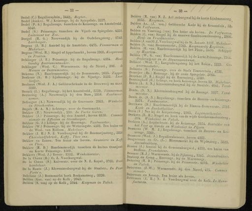 — S8 — Dedel ( C .) Regttfierspleïn , 5442 . Regier . Dedel ( Jonkvr . W .) Reizersgr . bij de Spiegelstr . 3237 . I Dedel ( P . S .) Reguliersgr . tussehen de Keizersgr . en Amstel veld , ■ 5548 . W>i I Bedel ( S .) Prinsengr . tusschen de Vijzel - en Spiegelstr . 4231 . ■ Luitenant ter Zee . I Deegel ( H . G .) Nieuwendijk bij de Oudebrugsteeg , 1748.1 Leerkooper . Degens ( J . H .) Amstel bij de Amstelstr . 6475 . Timmerman e » Makelaar . Degens ( Wed . H .) Singel of Appelmarkt , boven 3935 . KoopvrowM in Fruiten . Dehlinger ( J . F .) Prinsengr . bij de Reguliersgr . 4884 . ZTeeil kundig Instrumentmaker . Dehlinger ( Wed . C .) Warmoesslr . bij de Kiezel , 306 . /»■ Messen en Instrumenten . Dekema ( N .) Haarlemmerdijk bij de Dommerstr . 2035 . TappetM Deekens ( A . H .) Lijnbaansgr . bij de Vijzelgr . 5233 . ieen " looijcr . Deelman ( Wed . J . A .) Gelderschekade in de Brouwerij de haak 3388 . Deenik ( Z .) Reguliersgr . bij het Arasiel veld , 5559 . Timmermani Deetering ( A .) Nieuwendijk bij den Dam , 2854 . ZaakwaaA nemer . Defraigne ( A .) Nieuwendijk bij de Gravenstr . 2863 . Winkelimi in Stroohoeden . Degalz ( M . A . M .) Achtergr . over de Ossenmarkt . Dekker ( H .) Nieuwendijk , 210 . In Turks Garen . Dekker ( J .)' Prinsengr . bij den Amstel , boven 6158 . Commit ' sionair in Effecten en Steenkoaper . Dekker ( G . J .) Leliegr . bij de Heerengr . Taaimeester . Dekker ( W .) Prinsengr . bij de Weteringstr . 4282 . Ten huize vaTI de Wed . van Midlum , Makelaar . Dekker ( J . H .) N . Z . Voorburgwal bij de Rosmarijnsteeg , 3830 | Chocoladefabriek , Koffij , Thee enz . - . Dekker en Zonen . Ten huize als boven . Grossiers in KM en Thee . Dekker ( E . D .) Haarlemmerdijk tussehen de buiten OranjesW en Rorte Prinsengr . 1509 . Dekkers ( Wed . J .) Reestr . 1532 . Winkelierster . De la Chaux ( H .) O . Z . Voorburgwal . De la Chaux ( S .) Ralverstr . over de N . Z . Rapel , 3766 . Boek handelaar . De la Hanle ( J .) Rloveniersburgwal bij de Staalstr . In Piati Forte's . Delclisur ( J .) Boommarkt hoek Roskamsteeg , 3326 . Delden ( Gez . van ) op de Rolk , 2043 . Delden ( S . van ) op de Rolk , 2044 . Koopman in Tabak . - 59 — f Deld 2 e i ^ j ?" 0 N ' Z - AcKerbur S w » l bii de korte Lijabaansteeg- ilod . Koopman . f*-F6 > üeld l » vl'rf } 1 ' ™ n ,) Geldersche Kad ° bij de Kraansluis , 52 . in v erfwaron . ' Selden Tc van?V g ( r . n ) - T r hUhe al8 Wn ' ï " Verf W ar,c *. Uelden ( C . van ) Singel b,j de naauwe Gasthuismolensleeg ; 2986 Ifeel- en Vroedmeester . K^WfMBW Delden ( J.vanJO.Z:Voorburgwal bij de St . Jansslr.1127 . Makelaar Il den l % ™ K H «« 7 "? ark '. 5765 . KoopvaardifÊapiUit BeId O»iY ' G- Tan ) Haarlemmerdijk bij de korte Prinsengr . 1544 . Ondemyzer tn de Stuurmanskunst . b Dehneé ( Wed . T .) Langenbrugsteeg bij het Rokin , 2223 Ge - weermaakster . ' r r ?°- ue ~ Delsotlo ( D .) Prinsengr . over de Stads Timmertuin A"7Vi DeTe^r^f ? ^ er 4 r - b « *» ° ude Spiege7sTr l ^ 4 ' ^ - Deneker ( P B . Singel bij de Raamsteeg , 3590 . ■ Se e nT (| h0 S f \ IU HeRr - e \ hoe " fr4'r.'5en 19 . Makelaar , mlest !;. M - - , . Ki0ïcI " ersbur Swal bij de Staalstr . 4041 . Tand - I)ent m ' e £ e , W ,) IUo ' TCnie " burgwal by de Raamgr . 3937 . Tand - DentzJ.r . ( S.N .) Reguliersgr . tussehen de Heeren-enReizers^r . oó/l . I andmeester . iWcw.ff üeTC ÏZ ( l } / aa / i ^ B Tr dÖk b ' J dB Einnen-Brouwerstr '. 5715 . -"•'"•«■ en Banketbakker . Derksen | E K B hi , s de ^ T ^ ' 2103 - Logementhouder . I 3U4 ' wfJi ^ 1 - Cn ' T k vau de w ' jde Gasthuismolensteeg , öjt . Winkelier zn Tabak . & ' Uerksen ( A .) Lejjdschestr . bij de Reizersgr . 3154 . Bestelde ,- vanhet Vee * op Gouda en Winkelier in Pijpen . ' M * ' Te"s S gr ( 536i : '•/ ^' "«"« S . Heeren - en Rei- . ^ Smons (. Wed - J -) raBRRJS ' ( L ,) %! *^^ fe ' m ^^ g^g^enegp 413Ó . ten huize van Dessaur(.TI.J ) Warmocsstr . bij do Pijisteee M : ^ ^/„ Ivi ,, Dsjtoop en Comp ., Heerengr^y 7e Smoest ^*# W § T 7 $;* J PHnSe " gK b ' J de IvS ^ 5 te »-*. b ' J . Drterman en Rnoqp . Ten huize als boven . \ ZZ £: ïï ' ] w - z : Voo ' b - s^'-er dc i^fe ^