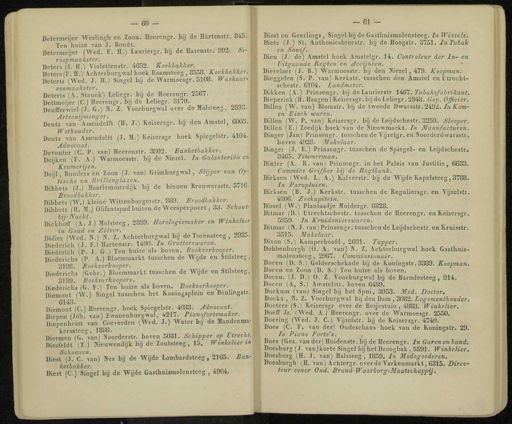 — 60 — 61 — Delermeijer Weslingh en Zoon . Heercngr . bij de Harlcnstr . 845 . Ten huize van J . Bondt . Determeijer ( Wed . F . H .) Lauriergr . bij de Hazenstr . 992 . St- roop maakster * Delers ( J . H .) Violettenstr . 4652 . Koekbakker . Deters ( F . H .) Achterburgwal boek Raamsteeg , 3558 . Koekbakker . Deterts ( Wed . J . H .) Singel bij de Warmoesgr . 5108 . Waskaar- senmaakstcr . Deterts ( A . Staunk ) Leliegr . bij de Heerengr . 2567 . Dettmeijer ( C .) Heerengr . bij de Leliegr . 3170 . Deufferwiel ( J . G .) N . Z . Voorburgwal over de Holsteeg , 2893 . Artsenijmenger . Deutz van-Assendelft ( H . J .) Keizersgr . bij den Amstel , 6003 . Wethouder . . Deutz van Assendellt ( J . M .) Keizersgr hoek Spiegelstr . 41Ü4 . Advocaat . Deventer ( C . P . van ) Heerenstr . 3802 . Banketbakker . Deijken ( F . A .) Warmoesstr . bij de Kiezel . In Galanteriën en KratherUen . Deijl , Bunders en Zoon { J . van ) Grimburgwal , Slijper van Op- tische en Brillenglazen . Dibbets ( J .) Haarlemmerdijk bij de binnen Brouwersstr . 5/lb . Broodbakker . Dibbets ( W .) kleine Wiltenburgerstr . 869 . Broodbakker . Dibbetz ( H . M .) Olifantspad buiten de Weesperpoort , 33 . Schout - bij- Nacht . _,. , ,. Dickhoff ( A . J .) Holsteeg , 2899 . Horologiemaker en Wmkehetin Goud en Zilver . '','■/ Didier ( Wed . K .) N . Z . Achterburgwal bij de Torensteeg , i935 - Diedcrich ( J . F.l Hartenstr . 1490 . In Grutterswaren . Diederich ( P . J . G .) Ten huize als boven . Boekverkooper . Diederichs ( P . A .) Bloemmarkt tusschen de Wijde en Stilsteeg , 3198 . Boekverkooper . Diederichs ( Gebr .) Bloemmarkt tusschen de Wijde en Stilsteeg , I 3199 . B oekverkoopers . Diederichs ( G . F .) Ten huize als boven . Boekverkooper . Diemont ( W .) Singel tusschen het Koningsplein en Beulingstr . 6143 . Diemont ( C .) Heerengr . hoek Spiegelstr . 4033 . Advocaat . Diepen ( Joh . van ) Zwanenburgwal , 4217 . Pianofortemaker . Diepenheim van Coeverden ( Wed . J .) Water bij de Handenma- kersstceg , 1886 . Diermen ( G . van ) Hoorderstr . boven 5031 . Schipper op LtrechtA Diesfeldt ( T .) Nieuwendijk bij de Zoutsteeg , 15 . Winkelier »» Schoenen . Diest ( J . C . van ) Hes bij de Wijde Lombardsteeg , 2165 . Ban- ketbakker . Diest ( C .) Singel bij de Wijde Gaslhuismolensteeg , 4904 , Diest en Geerlings , Singel bij de Gasthuismolensteeg . In Wissels ". Dietz ( J .) St . Anthoniesbreestr . bij de Hoogstr . 3751 . In Tabak en Snuif . Dieu ( J . de ) Amstel hoek Amstelgr . 14 . Controleur der In - en uitgaande Rcgten en Accijnsen . Dievelaer ( J . B .) Warmoesstr . bij den Kiezel , 479 . Koopman . Dieggelen ( S . P . van ) Kerkstr . tusschen den Amstel enOtreeht- schestr . 6104 . Landmeter . Dikken ( A .) Prinsengr . bij de Laurierstr 1467 '. Tabaksfabrikant . Dieperink ( H . Haagen ) Keizersgr . bij de Leliegr . 2948 . Gep . Officier . Dillen ( W . van ) Blomstr . bij de tweede Dwarsstr . 2492 . In Kom- en Eisch waren . Dillen ( W . P . van ) Keizersgr . bij de Leijdschestr.3250 . Sleeper . Dillen ( E .) Zeedijk boek van de Kieuwmarkt . In Manufacturen . Dinger ( Jan ) Prinsengr . tusschen de Vijzelgr . en Hoorderdwarsstr . boven 4928 . Makelaar . Dinger ( J . E .) Prinsengr . tusschen de Spiegel - en Leijdschestr . 3465 . Timmerman . Dinter ( A . R . van ) Prinsengr . in bet Paleis van Justitie , 6633 . Commies Griffier by de Regtbank . Dirksen ( Wed . L . A .) Kalverstr . bij de Wijde Kapelsteeg , 3788 . In Parapluien . Dirksen ( B . J .) Kerkslr . tusschen de Reguliersgr . en Vijzelstr . 4806 . Zeekapitein . Dissel ( W .) Plantaadje Huidergr . 6828 . Ditmar ( D .) Utrechtschestr . tusschen de Heerengr . en Keizersgr . 5959 . In Kruidenierswaren . Ditmar ( N . J . van ) Prinsengr . tusschen de Leijdschestr . en Kruisstr . 3515 . Makelaar . Dixon ( S .) Kamperhoofd , 2691 . Tapper . Dobbenburgh ( O . A . van ) N . Z . Achterburgwal hoek Gasthuis- molensteeg , 2967 . Commissionair . Docen ( 1 ). S .) Gelderschekade bij de Koningstr . 3389 . Koopman . Docen en Zoon ( Ü . S .) Ten huize als boven . Docen . ( J . D .) 0 . Z . Voorburgwal bij de Barndesteeg , 914 . Docen ( A . S .) Amstelstr . boven 6489 . Dockum ( van ) Singel bij hef Spui , 3953 . Mcd . Doctor . Dockx , K . Z . Voorburgwal bij den Dam , 3082 . Logementhouder , Docters ( S .) Keizersgr over de liesjcsluin , 4883 . Winkelier . Doeff Jz . ( Wed . A .) Heerengr . over de Warmoesgr . 2550 . Doering ( Wed . J . C .) Vijzelstr . bij de Keizersgr . 4740 . Does ( C . F . van der ) Oudeschans hoek van de Koningstr . 29 . In Piano Forte's . Does ( Gez . van der ) Huidcnstr . bij de Heerengr . In Garen en band . Doesburg ( J . vanjkorle Singel bij het Droogbak , 5591 . Winkelier . Doesburg ( H . J . van ) Halsteeg , 1859 . In Modegoederen . Doesburgh ( H . van ) Achlergr . overde Varkenmarkt , 6315 . Direc- teur eener Ond . Brand - Waarborg-Maatschappy .