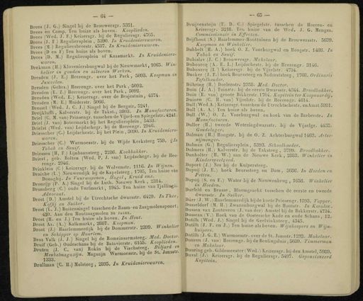 — 64 — Drees ( J . G .) Singel bij de Brouwcrsgr . 5351 . Drees en Comp . Ten huize als boven . Kooplieden . * Drees ( Wed . J . F .) Keizersgr . bij de Regulicrsgr , 4705 . Brees ( J . F ) Reguliersplein , 5390 . In Kruidenierswaren . Drees ( 81 .) Reguliersbreestr . 4537 . In Kruidenierswaren . Drees ( D en F ) Ten huize als boven . . I Drees ( D . SI .) Reguliersplein of Kaasmarkt . In Kruideniers- 1 Drekman ( TI .) Kloveniersburgwal bij de Nieuwmarkt , 1065 . Win- 1 keiier in gouden en zilveren Werken . . I Dresden ( J . E ) Heerengr . over het Park , 5093 . hoopman « tl Juweelen . Dresden ( Gebrs .) Heerengr . over het Park , - 5092 . Dresden ( E . Z .) Heerengr . over het Park , 5092 . Dresden ( Wed . E .) Kcizersgr . over de Besjestuin , 48/4 . Dresden ( M . E .) Muiderstr . 5066 . Dressel ( Wed . J . C . J .) Singel bij de Bergstr . 5241 . I Dreijklufft , Kalverstr . bij de Takst ., 3803 . In Manufacturen .! Driel ( C . M . van ) Prinsengr . tusschen de Vijzel- en Spiegelstr . 4.41 . 1 Driel ( J . van ) Botermarkt bij het Reguliersplein , 5433 . Drielst ( Wed . van ) Leijdschegr . bij de Heerengr . 294b . . I Driesscher ( C .) Leijdschestr . bij het Plein , 3090 . In Kruideniers-l DriesTher'fC .) Warmoesstr . bij de Wijde Kerksteeg 759 . « In \ Tabak en Snuif . Driessen ( H , F .) Lijnbaansteeg , 2286 . Koekbakker . Driest , geb . Bolten ( Wed . V . J . van ) Leijdschegr . bij de Hee - rpnrr ) 4u Drinklein'(5 ) Keizersgr . bij de Wolvenstr . 1116 . jg ' ^ f »*»• Droixhe ( L .) Nieuwend.jk bij de Kapelsteeg , 1 / 0o , Ten huize van Donaghij . In Vuurwapenen , Hagel , Kruid enz . Dronriip ( P . A.l Singel bij de Luth . Nieuwe Kerk , *««•-. Dronsberg ( C .) oude Turfmarkt , 1945 . Ten huize van Tjalhnfi .. Drost ( l^fAmstel bij de Hlrechtsche dwarsstr . 6429 . /« Ffte *, Koffiï 67i Suiker * . , Drost ( L.J .) Buitensingel tusschen de Raam- en Zaagmolenspoort , 420 . Aan den Houtzaagmolen ds jager . Drost ( H . en J .) Ten huize als boven . In Hout . Drost Az . ( A .) Kalkmarkt , 2887 . Koopman . „-„ u.nJ Drost ( J .) Haarlemmerdijk bij de Dommerstr . 2399 . Winkelier en Schipper op Haarlem . n n . tnr Droz Valk ( i . J .) Singel bij de Romeinsarmsleeg . f cd -?°°*° r - Druif ( Geb ) Oude.chans bij de Meubolmagazyn . Magazijn Warmoesstr . bij de St . Jansstr . 1333 . , . Drullman ( C . H .) Holsteeg , 2895 . In Krutdenurswaren . — 65 — Druijvensteijn ( F . D . 0 .) Spiegelstr . ( usschen de Heeren - eri Keizersgr . 3218 . Ten huize van de Wed . J . G . Menges . Commissionair in Effecten . Drijfhout ( S .) Haarlemmer-Houttuinen bij de Brouwersstr . 5639 . Koopman on Winkelier . Dubbelt ( H . A .) hoek 0 . Z . Voorburgwal en Höogstr . 1408 . In Tabak en Snuif . Dubislav ( J . C .) Brouwersgr . Makelaar . Dubourcq ( A . E . L .) Leijdschestr . bij de Heerengr . 3146 . Dubourcq ( L ) Keizersgr . bij de Vijzclstr .' 4734 . Duoker ( J . F .) hoek Beurssteeg en Kadorststeeg , 1708 . Ordinaris Tafelliouder . Dühring ( H .) Doelenstr . 2358 . Med . Doctor . Duin ( J . A .) Tuinstr . bij de eersle Dwarsstr . 4344 . Broodbakker . Duin ( E . van ) groote Bikkerstr . 1704 . Kapitein ter Koopvaardij . Duinen ( C . H . van ) Vijzelstr . bij de Heerengr . 4614 . Dull ( Wed.A .) Keizersgr . tusschen de Utrechtscheslr . enAmst 5981 . Dull ( A . A .) Ten huize als boven . Dull ( W .) O . Z . Voorburgwal en hoek van de Barberstr . In Manufacturen . Duller ( H .) tweede Weteringdwarsstr . bij de Vijzelgr . 4435 . Goudslager . Dulman ( H .) Hoogstr . bij de O . Z . Achterburgwal 1463 . Aitse ^ nijmenger . Dulman ( G .) Reguliersplein , 5393 . Schoolhouder . lüulmers ( H .) Kalverstr . bij de Taksteeg , 3799 . Broodbakker . Dunholter ( II . W .) aan de Hieuwe Kerk , 2883 . Winkelier in Kinderspeelgoed . Duport ( J .) Nes bij de Kuipersteeg . Dupuij ( J . E .) hoek Beurssteeg en Dam , 3036 . In Hoeden en I'etten . Dupuij ( S . en F .) Water bij de Nieuwenbrug , 1656 . Winkelier in Hoeden . iDurfeld en Brusse , Bloemgracht tusschen de eerste en tweede dwarsstr . In Suiker . Dürr ( J . W .) Haarlemmerdijk bij de korte Prinsengr . 1593 . Tapper . Dusseldorf ( M . H .) Zwanenburgwal bij de Hontstr . In Koralen . bussen van Zouleveen ( J . van der ) Amstel bij de Bakkerstr . 4734 . Dusseau ( V .) Hoek van de Oosfersche Kade en oude Schans , 12 . Dutilh ( Wed . J .) Singel bij de Geelvinksleeg , 4345 . Dutilh ( J . F . en J .) Ten huize als boven . Wijnkoopers en Wijn- kuipers . ■ Dutilh ( J . G . E .) Warmoesstr . over de St . Jansstr . 1293 . Makelaar . Buuren ( J . van ) Heerengr . bij de Beiilingsluis , 5030 . Timmerman en Makelaar . Duuring geb . Gildemeester ( Wed .} Keizersgr . bij den Amstel , 5989 . Kuval ( J .) Keizersgr . bij de Regulicrsgr . 5497 . Gepensioneerd Kapitein .