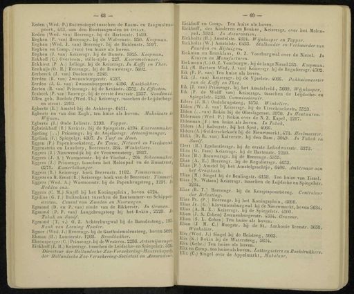 - 68 - i Éeden ( Wed . P .) Buitensingel tusschen de Raam - en Zaagmolens - poort , 413 , aan den Houtzaagmolen de zwaan . Eeden ( Wed . Tan ) Heerengr . bij de Ilartenstr . 1480 . Eeghen ( P . van ) Heerengr . bij de Wolvenstr . 850 . Koopman . Eeghen ( Wed . J . van ) Heerengr . bij de Huidenstr . 5997 . Eeghen en Comp . ( van ) ten huize als boven . Eeghen ( J . van ) Reizersgr . bij de Runstr . 5925 . Koopman , Eekhoff ( C .) Overtoom , stille-zijde , 227 . Koornmolenaar . Eekhout ( P A .) Leliegr . bjj de Reizersgr . In Koffij en Thee . i Eenhuijs ( 0 . H .) Heerengr . bij de Brouwersgr . 5602 . ' Eerbeeck ( J . van ) Doelenstr . 2248 . Eerden ( B . van ) Zwanenburgerstr . 4393 . Eerden ( J . G . van ) Zwanenburgerstr . 4396 . Koekbakkor . Eerten ( B . van ) Prinsengr . bij de Rruisstr . 3552 . In Effecten . Eèsbeek ( P . van ) Rozengr . bij de eerste dwarsstr . 2357 . Goudsmid , Effen gel ). Roelols ( Wed . Th .) Reizersgr . tusschen de Lcijdschegn en straat . 2993 . Egberts ( E .) Amstel bij de Aehtergr . 6411 . Egberts en van den Engh , ten huize als boven . Makelaars ii Wijnen . Egberts ' ( J .) Oude Leliestr . 5193 . Tapper . Egbrinkhoff ( B .) Rerkstr . bij de Spiegelstr . 4194 , Kaarsenmaker . Egeling (.) Prinsengr . bij de Anjeliefsgr . Artsenijmenger . Egelink ( J .) Spiegelgr . 4307 . In Turf en Hout . Eggen ( P .) Papenbroeksteeg , In Touw , Netwerk on Fischivanti Eggenstein en Lansdorp , Beerenstr . 884 . Winkeliers . Eggers ( J .) Mieuwendijk bij de Vrouwensteeg , 2087 . Eggers ( J . A ) Warmoesstr . bij de Vischst . , 204 . Schoenmaker ,! Eggers ( J .) Prinsengr . tusschen het Molenpad en de RunstraatJ 6271 .- Kamerbehanger . Eggers ( R .) Reizersgr . hoek Beerenstr . 1162 . Timmerman . Eggers en H . Ernst ( R .) Reizersgr . hoek van de Beerenstr . Timmorlm Eggers ( Wed . A .) Warmoesstr . bij de Papenbrugsteeg , 1291 . Al Bedden enz . Eggers ( C . M .) Singel bij bet Roningsplein , boven 4324 . Egidius ( G . F .) Buitenkant tusschen de Bantammer - en Schipper-I straten . Consul van Zweden en Noorwegen . Egmond ( D . en P . van ) einde van de Bikkerslr . In Granen . I Egmond ( P.P . van ) Langebrugsteeg bij het Rokin , 2228 . M Tabak en Snuif . Egmond ( T . v .) O . Z , Achterburgwal bij de Barndesteeg , 1951 Bank van Leening Houder . Egner ( Wed . J .) Heerengr . bij de Gasthuismolensteeg , boven 5092.1 E liman ( H .) Laurierstr . 1208 . Broodbakker . Ehrensperger ( C . ) Prinsengr.bij deWesterm . 2286 . Artsenijmenger * Eickhoff ( J . H .) Reizersgr . tusschen de Leidschc - en Spiegelstr . 828 .■ Directeur der ffollandsche Zec-Verzekering-Maatschappijif der HollandscheZee-Verzekering-Societeit en Assuradeur . — 69 — over het Molen - Eickhoff en Comp . Ten huize als boven . Eickhoff , der Rinderen en Beuker , Reizers pad . 5953 . In Assurantiën . Eickholtz ( H .) Amsfelstr . 4824 . Wijnkooper en Tapper Eickholtz ( W .) Amstelstr . 6483 . Stalhouder en Verhuurder van Paarden en Rijtuigen . Eickman en Brunklaus , O . Z . Voorburgwal over de Kiezel In Kousen en Manufacturen . I SS ? m n £ ü °" w V ,° 0r T bUrg T £ H de lan S e NiejeI 385 - Zoopman . I n p ' v ? i "" t " - J - ™, n ) ^ izersgr . bij de Reguliersgr . 4702 . I Eik ( P . P . van ) Ten huize als boven . I Eik ( J . van ) Reizersgr bij de Vijzelstr . 4066 . Pakhuismeestcr Wynkooper . Leijdsche- en van de Koffij en Thee . I Eik *( J . van ) Prinsengr . bij het Amstelveld , 560A I Eik ( P . de Wolff van ) Reizersgr . tusschen de I Spiegelstr . 3298 . Commissionair , lEilers ( J . B .) Oudebrugsteeg , 1876 . Winkelier . lilden ( W . J . van ) Reizersgr . bij de Utrechtschestr . 5523 . Uu ( " " Tw ) > R0k \ n £' j , ^ 0Iie8la ge»st . 3970 . In Houtwaren . ■ Elderman ( Wed . P .) Rokin over de N . Z . Kapel '> 217lElderman ( F .) ten huize als boven . In Tabak ' I Elders ( A .) Ralverstr . bij het Spui , 4066 . - PMM^/n'l & elder , SC v e ! Cade bij , de Nieuwmarkt,473 . Heelmeester . I siuïf ' KaI?ers l r - l»j den Dam , 3049 . In Tabak en [ Elert ( II .) EgeJanliersgr . hij de eerste Leliedwarsstr . 3273 ■ tlias G . Faas ) Reizersgr . bij de Hartenstr . 2220 . lElias ( H .) Brouwersgr . nij dè Heerengr . 5575 . lElias ( A . E .) Heerengr . bij de Reguliersgr . 4653 . \ h^l%lTek hiJ h6t Aa " ie ] e ™^°> 6406 . Ambtcnaaraan lulu fï ' Wï ""'^ de BeuIi " S 8 "- 6158 . Ten huize van Tissel . 3284 ] Ke " er8 S r - lU8Schen « e teödsche en Spiegelstr . r [ aS del'B J els 1 Hng ': nSt - ** d " Kor8 J es P°°^eS - Controleur lElias Pz . ( P .) Heerengr . bij het Roningsplein , 6080 . lElïas f A Ll?K?T " f ™] VjdeMieuwmarkt , hoven 3684 . VJUiai ( A.m . E .) Reizersgr . bij de Spiegelstr . 4100 . lElïon s ' I r if "\ Z 7 ane " bur g «"'-- Wé . Graveur . | Ji ion ((>. L . Cohen ) Ten huize als boven . \ WtnkMer ?' 1 ^" t *^ 1 *"' ^ ** Anth ° nie Bree8tr ' 3G58 - ■ JU !'* ( y ? d - J -' Sin S el h » de Heisleeg , 5003 . llv X t ,^-) Rokin bij de Watersleeg , 3634 . IE 1.x ( Gebr .) Ten huize als boven ! Elx ? C C ) 7VJl ™ he , al8 1 bov ? n - Lette W°t'rs en Boekdrukkers . itiix [ Vj.j smgel over de Appelmarkt , Makelaar .