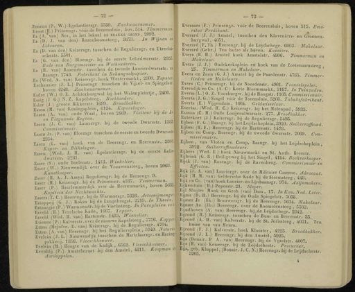 Eroens ( P . W .) Egelanliersgr . 3550 . Zaakwaarnemer . Ernst ( E .) Prinsengr . vóór de Beerensluis , bov . 514 . Timmerman . Es ( A van ) Nes , in het lokaal de brakke ghohd , 2092 . Es ( 0 . 3 . van den ) Rozenboomsteeg , 3673 . In Wijnen M ■ Likeuren . ,' f-y . Es ( 1 ). van den ) Keizersgr . tusschen de Reguhersgr . en Utrecht - schestr . 5501 . ■ Es ( G . - van den ) Bloemgr . bij de eerste Lehedwarsslr . 295o . Bode van Burgemeester en Wethouderen . Es ( M . van ) Rozenstr . tusschen de . tweede Laurierdwarsstr . en Baangr . 1743 . Fabrikant in Behangselpapier . Es ( Wed . A . van ) Keizersgr . hoek Weslermarkt , 2900 . Tapster .] Eschauzier ( J . E .) Prinsengr tusschen de Vijzel - en Spiegelsir , boven 4248 . Zaakwaarnemer . ^ flfe . Esdre ( W .) O.Z . Achterburgwal bij het Walenpleintje , 2400 . Essig ( J G .) H . Z . Kapelsleeg . Boekbinder . Esler ( J .) groote Bikkerstr . 1699 . Broodbakker . Essen.IJl . van ) Koningsplein , 0134 . Koperslager . Essen ( A . van ) oude Waal , boven 2669 . Visiteur by do M en Uitgaande Regtcn . Essen ( J . C . van ) Launcrgr . bij de tweede Dwarsstr . 1385 Commissionair . Essen Jz . ( P . van ) Bloemgr tusschen de eerste en tweede Dwarsstr en Heerenstr . 3801.1 bij de eerste Lelie-I 2954 . Essen ( I . van ) hoek van de Heerengr Koper - en Blikslager . /\> \ ti- Essen ( Wed . 3 . H . van ) Egelantiersgr . dwarsslr . 3281 . u 0ii ^ Esser ( S .) oude Doelenstr . 1413 . Winkelier . • Esser ( WO Nieuwendijk over de Vrouwensteeg , boven 2068 . | Kunstkooper . ,. Esser ( H . A . 3 . Amya ) Reguhersgr . bij de Heerengr . 9 . Esser ( II .) Keizersgr . bij de Prinsenstr . 4187 . Timmerman . Esser ( P .) Haarlemmerdijk over de Heerenmarkt , boven 5bSi Kapitein der IVachtwachts . ;•/''' Esser»(T . 0 .) Heerengr . bij de Warmoesgr . 5326 . Artsenijmenger . Estoppeij ( G J .) Rokin bij de Langebrugst . 2219 . In Theeën Eslourgie f-l pakkerij . 1356 . Vleeschhouwer . Evelein ( M .) Hoogte van dé Kadijk , 6562 . Vleeschhouwer . i Evenhlij ( P .) Am.lelstraat bij dep Amstel , 4811 . Koopman »» Aardappelen . Everaars ( F .) Prinsengr . vóór de Beerensluis , boven 515 . Eme- ritus Predikant . Everard ( J . J .) Amstel , tusschen den Kloveniers - en Groenen- burgwal , 4051 . Everard ( F . Th .) Heerengr . bij de leydschegr . 6003 . Makelaar . Everard ( Gebr .) Ten huize als boven . Kassiers . Evers ( B . H .) Amstel hoek Amstelstr . 4806 . Tïmmerman en - Makelaar . Evers ( J . J .) Oudekerksplein en hoek van de Zoelenaamsleeg 25 . Timmerman en Makelaar . Evers en Zoon ( G . J .) Amslel bij de Paardenstr . 4765 . Timmer- lieden en Makelaars . Evers ( C .) Prinsengr . bij de Noorderstr . 4901 . Tooneelspeler . Eversdijk en Co . ( A . C ) Korte Bloemmarkt , 3187 . In Tuinzaden . I Eversz ( L .) O . Z . Voorburgw . bij de Hoogstr . 1105 . Commissionair I Everts ( J . G .) Singel vóór de Torensluis , 5208 . Tabaksfabrikant . Everts ( E .) Vijgendam , 1664 . Geldwisselaar . Evertsz . ( Wed . H . C .) Keizersgr . bij het Molenpad , 5935 . I Exman ( C . H .) Oude Looijersdwarsstr . 277 . Broodbakker . I Exterkort ( J .) Keizersgr . bij de Reguhersgr . 5495 . Eijben ( F . G .) Baangr . bij het Leijdscheplein , 3920 . Snikerrafflnad . I Eijben ( H . F .) Heerengr . bij de Hartenstr . 1478 . I Eijben en Comp . Rozengr . bij de tweede dwarsstr . 2069 . Com- missionairs . lEijben , van Vloten en Comp , Baangr . bij het Leijdscheplein 392Q . Suikerraffinadeurs . lEijbcrs ( Wed . E ) hoek Meuwmarkt en St . Anth . Breeslr Ktjbrink ( G . R .) neiligeweg bij het Singel , 4184 . Boekverkooper . IJSgek ( J . van ) Rozengr . bij de Ravenbrug . Commissionair in Effecten . It ?"!* ( n »' van ' La ' urier 6 r - over de Militaire Caserne . Advocaat . Ifcnk ( H . M . van ) Geldersche Kade bij de Stormsteeg , 448 . Kijk en Co . ( van ) hoek Laurier-en lEgkenduin ( H .) Peperstr . 21 . Sleper . Pijl Slugler Hunk en Groh ( van ) Dam , 17 . In Kon . Ned . Later BSmjia ( U . H .) Heerengr . bij de Oude Spiegelsir , 5058 Eijmer Jz ( Hk .) Brouwersgr . bij de Heerengr . 5614 . Makelaar . ■ Egmer Az . ( Jb .) Heerengr . over de Roomolensteeg , 5593 Kijndhoven ( A . van ) Heerengr . hijgde Leydschegr . 2942 . - ffijjrond ( H .) Keizersgr . tusschen de Run - en Beerenstr . 35 . Eijrond ( A . H . van ) Kalverstr . bij de St . Jorissteeg , 4031 . Ten ■ hmze van van Meurs . ftijrond ( F . J .) Kalverstr . hoek Klooster , 4225 . Broodbakker . ■ sijrond ( J . L .) Heerengr . bij den Amstel , 5925 . Pjiji ( Douair . P A . van ) Heerengr . bij de Vijzehtr . 4007 . *!) s ( H . van ) Keizersgr . bij de Leijdschestr . Procureur . m'lÈk Kluppel ' ( I)ouair - J - c - N -) Heerengr . bij de Leijdschestr .
