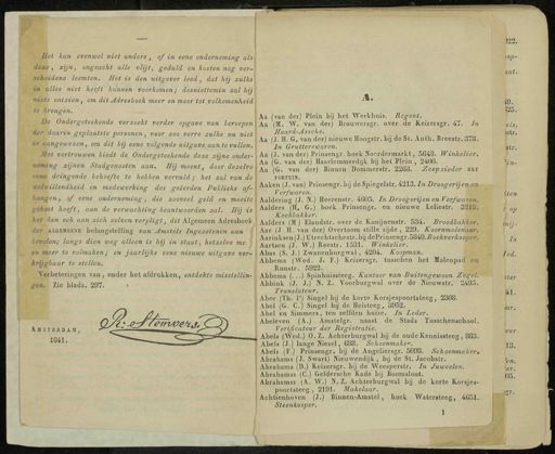 ■ Bel kan ovenwol niet anders , of in eene onderneming als deze , zijn , ongeaoht alle vlijt , geduld en / tosten nog ver- scheidene leemten . Het is den uitgever leed , dat hij zulks in alles niet heeft kunnen voorkomen ; desniettemin zal hij niets ontzien , om dit Adresboek meer en meer tot volkomenheid ■■■ té brengen . De Ondergeteekende verzoekt verder opgave van beroepen der daarin geplaatste personen , voor zoo verre zulks nu niet is - aangewezen , om dit bij eene volgende uitgave aan te vullen , I Met vertrouwen biedt de Ondergeteekende deze zijne onder -] neming zijnen Stadgenooten aan . Hij meent , door dezelve | eene dringende behoefte te hebben vervuld ; het zal van de I welwillendheid en medewerking des geëerden Publieks af- 1 hangen , of eene onderneming , die zooveel geld en moeite I gekost heeft , aan de verwachting beantwoorden zal . Hij is I het dan ook aan zich zelven verpligt , dit Algemeen Adresboek | der algbbeene belangstelling van Amstels Ingezetenen aan j bevelen ; langs dien weg alleen is hij in staat , hetzelve me f en meer te volmaken ; en jaarlijks eene nieuwe uitgave ver - I krygbaar te stellen . Verbeteringen van , onder het afdrukken , ontdekte misstellin- gen . Zie bladz . 297 . • q J?- ^ M A il STEHB A JI 3 1841 . A . Aa ( van der ) Plein bij het Werkhuis . Regent . Aa ( M . W . van der ) Brouwersgr . over de Keizersgr . 47 . In Haard-Assche . Aa ( J . H . G . van der ) nieuwe Hoogstr . bij de St . Anth . Breestr . 378 . In Grutterswaren . Aa ( J . - van der ) Prinsengr . hoek Noordermarkt , 5648 . Winkelier . Aa ( G . - van der ) Haarlemmerdijk bij het Plein , 2400 . Aa ( G . van der ) Binnen Dommerstr . 2268 . Zeepzieder het iohtbii . Aaken ( J . van ) Prinsengr . bij de Spiegelstr . 4213 . In Droogerijen en Ver/waren . Aaldering ( J . W .) Heerenstr . 4605 . In Droogerijen en Verfwaren . Aalders ( H . G .) hoek Prinsengr . en nieuwe Lelies tr . 3215 . Koekbakker . Aalders ( M ) Elandstr . over de Konijnenstr . 534 . Broodbakker . Aar ( J . II . van der ) Overtoom stille zijde , 229 . Koornmolenaar . Aarinksen(J .) Utrechtschestr.bij deVrinsengi.58iO.Boekverkooper . Aartsen ( J . W .) Reestr . 1531 . Winkelier : Abas ( S . J .) Zwanenburgwal , 4204 . Koopman . Abbema ( Wed . J . F .) Keizersgr . tusschen het Holen pad en Runstr . 5922 . Abbema (..) Spinhuissleeg . Kantoor van Buitengewoon Ze%cl . Abbink IJ . J .) N . Z . Voorburgwal over de Nieuwstr . 2495 . Translateur . Abee ( Th . I ') Singel bij de korte Korsjespoorlsteeg , 2308 . Abel ( G . C .) Singel bij de Heisteeg , 3952 . Abel en Simmers , ten zelfden huize . In Leder . Abeleven ( A .) Amstelgr . naast de Stads Tusschenschool . Verificateur der Registratie . Abels ( Wed .) O.Z . Achterburgwal bij de oude Kennissteeg , 883 . Abels ( J .) lange Hiezel , 688 . Schoenmaker . Abels ( F .) Prinsengr . bij de Angeliersgr . 5098 . Schoenmaker . Abrahams ( J . Swart ) Nieuwendijk , bij de St . Jacobstr . Abrahams ( D .) Keizersgr . bij de Weesperslr . In Juweelen . Abrahamsz ( C .) Geldersche Kade bij Boomsloot . Abrahamsz ( A . W .) N . Z . Achterburgwal bij de korte Korsjes- poorlsteeg , 2191 . Makelaar . Achtienhoven ( J .) Binnen-Amstei , hoek Watersteeg , 4651 . Steenkooper . 1 iop-lat . « 9 . 125 . istr . . Itr . Uen \ ° P yiij- \ ln ied . iter ' M . ( or , je«r jl3 . r en . ver . 05 .