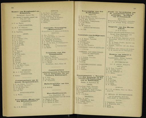59 Hamei van Koophandel en i Fabrieken . Beursgebouw , Damrak 62a . Het Bureau is dagelijks geopend van 101/a tol 5 uur . VOORZITTER . s . P . van Eeghen . Dr VICE-VOORZITTER . H . F . R . Hubrecht . P . PENNINGMEESTER . E . Tegelberg . LEDEN . M . E . Jonker . E . H . Crone . C . N . J . Mollzcr J.Ezn . B . C . E . Zwart . O . W *. G . Briegleb . H . R .' dn Mosch . F . Lieïlinck J.Hz . A . Asscher . E . Gerzon . J . Keij . H . C . Rehbock . J . Muijskcn . H . de Vries Robbé.- J . F . Verster ; ' Abr . Muller . B . Nieretrasz . • B . Heldring . TV . Fenenga . Mr . A . F . van Hall . J . T . van - Haren Nom&n . J . ter Haar Jr . A . Staalman . SECRETARIS . Mr . A . J . Moll Schnitzler . BOEKHOUDER.P . Stikker . »"^\ Commissarissen van de Groote Koopmausbeurs . S . P . van Eeghen , Voorzitter .*. K . van Lennep , Secretaris . G . van der Horst Hzn „ H . C . Rehbock .' Paul den Tex . HOOFDOPZICHTER . 0 . A . Walter . Vereeniging „ Beun voor den Diamanthandel ." Weesperplein . DIRECTEUR . Mr . J . E . Hillesum . BESTUUR . A . de Paauw , Voorzitter . M . Bolle Jr ., Vice-Voorzitter . Is . E . Loonstein , Secretaris . Herman van Praag , 2e Secretaris . Il ; Dwinger , Penningmeester . A . Dooseman . L . Nerden . Concordia Vereeniging „ lUainaiitclub ". Weesperplein ! en N . Achtergracht 60-62-64 . BESTUUR . D . Biet , Voorzitter . H . van Praag Sigaar , 2e Voorzitter . J . A . Stokvis , Ie Secretaris . Jos . Zomerplaag , 2e Secretaris . D . A . Ensel , Ie Penningmeester . M . J . van der Kous , 2e Penningmeester . Commissarissen . I . Maandag , j J . S . Jacobs . J . van Emden . Commissie voor den Graanhandel . S . Hepner , President . Ja . Reijnvaan , Secretaris . G . van der Horst Hz ., Penningmeester . U . C . Klaassen . Jul . C . Bunge . Secretariaat ; Beurs , Kamer 23 . Coin missar i ssen de Eigendom- men en Bezittingen van net voormalig Makelaarsgild . H . C . Surie . W . van den Berg ...-" '; v C.-W . " Wüstenhoff . Rafactiemeester van denTabak » **■- ;* J . E . Stolberg . Thee-Etablissement . Prins Hendrikkade 130 . PAKHUISMEESTEREN VAN DE THEE A . Bierens de Haan . C . ï . ' Bierens de Haan . L . L . Bierens de Haan . Vereeniging voor den Kofflehandel . BESTUUR . . H . R . du Mosch , ■ Voorzitter . M . Onnes van Nflenrode , Ond.-Voorrzitter Henri L . Boas . Secretaris . M . Goldschmidt , Penningmeester . J . V . van Marken . W . Ader . Chr . W . Herjbrook . LOKAAL-SECRETARIS . A . van Dijk . Commissie voor de Rijnvaart . LEDEN . S . L . A . Hepner . Voorzitter . J . J . Duinker . W . Korthals Altes . O L . J . Kotting , Paul den Tei , Secretaris . COMMISSARIS VOOR DE RIJNVAART O L . J . Kotting . COMMISSIE VAN-DESKUNDIGEN VOOR DE RIJNVAART . LEDEN . C . L ; J . Kotting , Voorzitter . J . D . Geselschap.G . S . Vlieger . D . Goedkoop . PLAATSVERVANGENDE LEDEN H . L . Seholten . f . A . Brink . J . C Vierhout . Staatscommissie v . Toezicht over den doortocht en het vervoer van Landverhui- zers te Amsterdam . Bureau : de Sugterkade 99 . LEDEN . O . Kamerlingh Onnes , Voorzitter.\l h - J - Kotting , Ond.- Voorzitter , in vl"i Jansi > en , Secret.-Penningmr . T ™ Kra 9 e nhoff van de Leur . • I . Wilmink . Dr - G . v . d . Harst . \ c \.^ BEAMBTEN . 1 . Maars , Ie Ambt . G R . Mnntendam , 2e Ambt . *• C . Vierhout , Expert . J . Aarents , Expert . *■ Fonds ter bevordering van de verzekering tegen de geldelijke gevolgen van werkloosheid . BESTUUR ; Burgemeester en Wethouders v . Amsterdam . Dr . J . van Hettmga Tromp , Secretaris . Inspectie van den Haven- arbeid . 2e en 3e district . ( Toezicht op de naleving der Stuwadoorswet ). Bureau : Prins Hendrikkade 116 . Telefoon Noord 9321 . W . H . M . de Fremery , Inspecteur van den Havenarbeid . Hoofd van . het 2e en 3e district . J . N . de Langen Wendels , Opzichter van den Havenarbeid . J . Luidens , Controleur van den Haven - ' arbeid . F . B . Jantzen , Adm . ambtenaar der 1 e klasse by de inspectie van den Havenarbtid . Kamers van Arbeid te Amsterdam . Vergaderlokalen : Militair Logement , Lauriergracht 116 . A . BOUWBEDRIJVEN voor de gemeente . Amsterdam . BESTUUR . D . M . Roos , Voorzitter . W . F . Abeling , idem . J . D . Pb . Haalmeijer Jr . K- G . Bakker . J . G . A . Borkus . H . Kikke . . B . H . Koolhaas . J . S . Ruppert Jr . J ; S . Copray . D . W . Beijllonse . SECRETARIS . Mr . J . H van Zanten , Frans van Mieris- straat 52 . B . METAAL - EN HOUTBEWERKING voor de gemeenten Amsterdam , Ouder-Amstel en Watergraafsmeer . BESTUUR ; ' G . Oosterhoorn , Voorzitter . A . J . Dingemans , idem . ' V^Ma J . Smith . F . Brandt Jr .