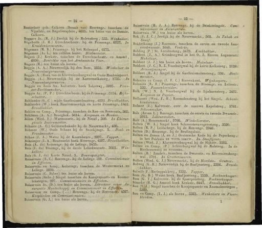 vm ■ - 24 - Boeiiejaer geb . Calkoen ( Douair > mn ) Heerengr . tusschen de Vijzels ^., en Reguliersplein , 4635 . teq ' hflize ,- van de Douair . Calkoen . Bogaars Jr . ( M . J .) Zeedijk bij de Molensteeg , 555 . Winkelier Bogeboltz ( J . H .) Utreehtscbeatr . bij de Prinsengr . 8127 . J n Kruidenierswaren . Bögeman jM . B .) Prinsengr . bij het Molenpad , 6275 . Bógeman ( A . L,j ) ten zelfiW.&BJae : I/èeltAeesfer . . Bogers ( J .) Kerkstr . tusschen de TJtrechtscheatr . en Amstel , 609Ó . Bes-teller conjle * Arnhtmscho Veer . Bogers ( II .) ten huwtiat » boven . Boggia ( A- . A ») fiieuwgndijk bij den Dam , 2852 . Winkelier in Neurcnburgerwaren , Boggia ( A .) Hoek van de Kloveniersburgwal en Oude-Manhuispoort . Boggia , ( A .) üieuwondjijfc-lbrj de Kamemelksleeg , Ifl&a.'ial » W.'ilVeyflienburgerwaren . Boggia en Zoon An . Kalverstr . hoek Taksleag , 3805 . Pleis - ■' jofSti-B.oeldeni/iaker , Boggia Az . ( P . P .) ülrechtscheslr . bij de Prinsengr . 5834 . Rijks - schatter . Bohlander ( G . C ) ; ,. wjjde Gaslhuismoleiistéeg , 4893 . Broodbakken '. Boblander ( W .) hoek Haarlemmerdijk en korte Prinsengr . 14b'J . Broodbakker . Bohlen en Comp . , Prinsengr . tusschen de Ree-en Beerenstr » 305i Bohlman ( A . A .)' Droogbak . 5614 . Koopman on Boeder . habla (.' Wied . JF .) ; Warmoesttr . bij de HJeöel , 300 . In Chirur - gicale Instrumenten . Böhmer ( A . C .) Gelderschekade bijide Nieuwmarkt ,- 480 . Böhmer ( W .) Oude Schans bij de Snoekjesgr . jt , ,~^ JJe\el - en b j Vrocdmecster Bohne ( J . A .) Water bij de Koornbeurs , 1897 . 7!a$per.v,f Bühringer ( J . A .) Iloutmarkt hoek Heerengr . 4587 . Broodbakker :. Bois ( A . dB ) Keizer8gr.ijliöide Leliegr . 3475 . Boi8 ( J . du ) Bloemgr . bij de derde Leliedwarsstr . 3082 . Win - keiier . tuiJiOü/'.i Bois ( G . J . du ) Korte Kiezel . 1 . Bouwopeigter . Boissevain ( E . C <) Jleerengïi J)ij de LeliBgiA ' 49 %. : Commissionair in Ejj'ecteii . Boissevain en Kooij , Keizejagr . tusschen de Westermarkt « t(n Leliegr . 28J0,.t ! Boissevain ( C . Faber ) ten huize als boven . Boissevain ( Gebr .) Singel tusschen de Korsjespoort - en Roomo - len8tegen . 297 . Commissionairs in Effecten . Boissevain Jr . ( D.)-_ten!.fJmize als boven . Direotjsur eener-^s ,*. surantie Maatschappij en Commissionair in - EffetMfo , Boissevain en Comp .( otiJHeerengiv'bij de$Ie$reii8tfc4587 . Kooplieden e » Commissionairs , oüwai . ü ) fis Boissevain ( G . J .) ten huize als boven . Boisjeyain ( H . J^^.J Heerengr . _}> jj de DriekoningsU .. Com- missionair in Assurantiën . Boissevain ( W .) ten huize als boven . Bok ( J . J . C .) Zeedijk bij do NieaWtnarkt , 502 . Jn Tabak en Snuif . Bokkelkamp ( J .) Rozenstr . tusschen de eerste en tweede lató rierdwarsstr . 1648 . Veearts . Bolding ( P .) St . Luciënsteeg , 3479 . Koekbakker . Boldoo.t , ( J . A .) Grimburgwal in het O . Z . Eeeren logement . Makelaar . Boldoot ( J . J .) ten huize als boven . Makelaar . Boldoot ( J.C.)N.Z . Voorburgwal bij derkorte Kolksteeg . 2128 . Artsenij menger . Boldoot ( H . J .) Singel bij de Gasthuismolensleeg , 396 . Heel- meester . Bolenius en Comp . ( J . F . C .) Binnenkant . TFijnkoopers . Bolemus ( R . R .) Prinsengr . tusschen de Bloemgr . en leliestr . '. 533 . Pennenb er eider . Bolk ( W .) N . Z . Voorburgwal bij de Lijnbaansteeg , 2482 . Koopman in Papier . Bollusset ( Wed . F . H .) Roomolensteeg bij het Singel . School- houderesse . Bolmer ( J .) Kalverstr . over de naauwe Kapelsteeg , 3761 . Schoenmaker . B0lS Jn/ó T6n h ) Rozen S r - '««« Chen de eerste en tweede Dwarsstr . 2012 . Likeurstoker , Bolt ( A .) Heerenmarkt , 5766 . Winkelierster . Bolten ( W . A .) Singel hoek Schoorsteenvcgerssteeg , 3580 . Bolten ( M . P .) Leidschegr . bij de Hejrengr . 2946 . Bolten ( D .) Heerengr . bij de Beulingsluis . Bolten en Zonen ( J . en J .) Oostersche Kade bij de Peperbrug in het Pakhuis be witte leeuw . In Staafijser . Bpjten ( Wed . J .) Kloveniersburgwal bij de Sbjkstr . 2282 . Bolten en Comp . ( P .) Achterburgwal bij de Molsteeg . In de Bierbrouwerij de hooibebg . | , i Bolten ( B .) Zandstr . tusschen de Dwarsstr . en Kloveniersburg- wal , 3791 . In Grutterswaren . TV Bolten . ( Wed . G . J .) nieuwmarkt , bij de Bloedstr . Gruttèn > a , • Bolweg ( G.H .) BoIwiIs(F,)Haringpakkerij , 1332 . Tapper . p ° m , ( r "?\ ) , r W , alwhoek B <"» fjessteeg , 2559 . Boekverkooper . « om G . T .) Kalverstr . bg de Spaarpotsteeg . Boekverkooper . Ju ^ Kt ^?" ■<*>) A « stel noek Kerkstr . 6*47 |, ^ Broodbakker . I mS *' Si " Sel tusschen de K.or.sjespoort - en Roomolenstegen , « JOoi . Bon en Comp . ( T ,,'^) als bojsn ,, 538 ^. Winkeliers in rioer- ftleeden . o ■