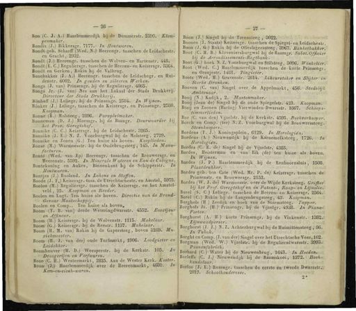 — 26 - Jlpn ( C . Si A .) Haarlemmerdijk bij de Dommerslr . 2890 . Klom- penmaker . Bondix ( J .) Bikkersgr . 7177 .' In Houtwaren . Bondl geb . Scharff ( Wed . N .) Heereitér . tusschen deLeidschestr . en Gracht , 2932 . Bondt ( J .) Heerengr . tusschen de Wolven - en Hartenstr . 448 . Bondt(E . C .) Reguliersgr.tusschen de Heeren-cn Keizersgr . 5364 . Bondt en Gerken , Rokin bij de Valbrug . Bonebakker ( J . A .) Heerengr . tusschen de Leidsehegr . en Hui- denstr . 6002 . In gouden en zilveren Werken . Bonga { J . van ) Prinsengr . bij de Reguliersgr . 4865 . Bonga Jr . ( J . van ) Mes aan het Xokaal der Stads Drukkerij . Directeur der Stads Drukkerij . Bönhoff ( J.)oXeliegr . bij de Prinsengr . 2584 . In Wijnen . Bónker ( J .) Leliegr . tusschen do Keizersgr . en Prinsengr . 2580 . Koopman . Bonne ( B .) Holsteeg , 2896 . Pardplvimaker . Bonneman ( 1 ). J .) Bloemgr . bij de Baangr . Deurwaarder lij het Prov . Geregtshqf . Bonnike ( C . C .) Keizersgr . bij de leidschestr . 8265 . Bonniko ( J . É.j N . Z . Voorburgwal bij de Molsteeg , 2729 . Bonnike en Zonen ( G .) Ten huize als boven . Kooplieden . Bonse ( M ^) WanrioesstrVitój-de Oudêbrugsteeg/ft45 . In Manu- facturen . Bonté ( Wed . van Ep ) Hoerengr . tusschen de Brouwersgr . en Heerenstr . 5592 . In Minerale Wateren en Eau de Cologne .^ Bontekoning en Aukes , Binnenkant bij de SchipperilA ) MÈ9 HoUÜDOtT&H .'-'' ■ Bontjes ( J .) Rusland . In lakens en Stoffen . Boode ( J . F .) Keizersgr . tuss . deTItrechtsehestr . en Amstel , € 975 . Booten ( M .) Reguliersgr . tusschen de Keizersgr . en het Amstel - veld , 25 . Koopman en Hoeder . Boolen en Lugt . Ten huize als boven . Directie van de Brand - b Gevaar Maatschappij . Boolen en Comp . Ten huize'als boven . Boom ( T . B . " van)Jderde Weteringdwarsstr . 4552 . Essay eur en Affincur . Boom ( H .) Kekersgr . bij de Wolvenstr . 1115 . Makelaar . Boom fG.j.&ëiineragr . bij de Reestr . 1137 . Makelaar . Boom ( II . M . van ) Rokin bij de Gapersteeg , boven S269 . Mu - ziekiftteester . Boom fB>?J « , v '^ an der ) oude Turfmarkt , 1906 . Loodgieter en ■' Héidetiker . Boomheuver >{ HV ' D .) Weesperstr . bij de Kerkstr . 105 . In t wtyroogertyen en Verfwaren . BooiWC . H .) Westermarkt , 2825 . Aan de Wester Kerk . Koster . Boon * ( J ;) Haarlemmerdijk - over : de Heerenmark t , 4680 . ' In Kom-cn-cisth-waren . Boon (}.) Singel bij de Torensteeg , 3022 . Boonen ( J . SlaaM'KBriersgr . tusschen de Spiegel-'-en Leidschestr Boon ( J,i.esi)»ökin bij de OIiesIa£er»sieeg , 39o "# BanmtaJHrerJ Boot ( C . H . B .) Kloveniersburgwal bij de faamgti"8^ïto~Moier bij de ArrondissëMents-Règtbank . BootlfG .) hoek N . Z . Voorburgwal Stilsteeg , 3096 . WinkeUeyf- Boot ( Wed . C .) Haarlemmerdijk tusschen de kortePÖnsengr . en Oranjestrr-1481 . Tingietïr .'-' Bootz ( Wed . H .) Gravenslr . ZGlii'^Mieurstoker en Slijter in 456 . Stedelijk <« ' Sterke ' Dranken . Booven ( C . van ) Singel over de Appelmarkt Ambtenaar . ob Booij ( N .) Kadijk , 2 . Mastehmaker . BóoffTearï■'die')'fingel bij dé oude Spiegelstr . 423 . Koopman . Booij en Zoonen ( Haring ) Vierwinden-Dwarsstr . 1867 . Scheeps - ■ v - ' rptmnieflUeden . Bor ( C . van den ) Vijzelstr . bij de Kerkstr . 4595 . ■ Boekverkoopor . Borch- ^ ii Comp . ( ter ) ÏÏ7S . Voorburgwal bij^de Brouwemleeg . Steénko'opers . Borden » ( F . J .) Koningsplein , 6129 . In Horologiën . Bordens ( A.)-'Nleuwendijk bij de Karneïnelksteeg , 1726 . In Horologiën . Bordes ( C . EvMe^Singe ! bij de'-Vijïélstr . 4385 . Bordes , Heisterman en vin?!Kik { db)'-(telii"%uiie"ials boven . In Wyneiït ""' ( Bordes ( J . Pi ) Haarlemmerdijk bij de EenhoöriJfluis , 1508 . Plaatdrukker . ' K.B jxèrói Bordes geb.4en Cate ( Wed . Mr . P . de ) Keizersgr . tusschen de • Prinsenstr . en Brouwersgr . 2152 . I Bordes ( W . J . de ) Warmoes'stri*bver de Wijde Kprksteeg . Griffier " i bij het Prof . Geregtshqf en in Patent -, Raap - en Lijnolie . yBorel ( S . C .) - leliegr . tusschen de fleeren-en Keizersgr . 2564 . IffoPêl'fO^'SBWtin- TbiJ'de Langenbrugsteeg , 43 *. Koopman . Borghols ( H .) Zeedijk en boek van de Stormsteeg . ITto^ah . Borghols Jz . ( H .) Prinsengr . bij déVijzelgr . 4938 . In Jtiano - bij de Vinkenstr . 1382 . Eorttf&i * ^ Borghprst ( A . H .) korte PrÉueögr . "' t'Eijnwaadper'éerï ^ '"■'■ Borghorst ( J . J .) W . Z . Achterburgwal bij de Huisziltensteeg , 86 . In Tabak .' » i > m > Borght en Comp . ( J . van der ) Singel over het Utrechtsene Veer , 102 . Borgman ( Wed . IW .) VijzelïfaQ bij de'HeguliersdwaTsstr . 3993 . Pennëüf&briek . ' t tna.1 Borhard ( C .) Watei fofj - de lïiériwènWng , 1643.h/n Hoeden . Borleffs ( C . J.^-%uVAdij-^>B§,^>>llSam'»k**i9i^fl72f.i)B()e *- ^'■ JRtndelaar . l-i.'BmA BortózJiTï E .) Rozengr . tusschen de eerste en tweede Dwarsstr ^. 2019 . Schoolhoudercsse .'