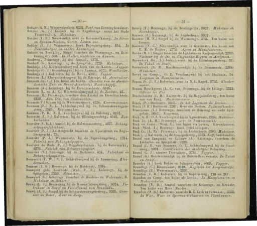 — 30 - Botijer ( A M .) Weesperkerkstr . 6232 . Bank van Loeninghoudeter . Bother ( G . J ) Kerpr . bij de Regüüersgr . naas/het 0u £ Vrouwenhuis . Makelaar . Bother ( J .' It .) HieuweiSi3Foïer de Karnemclksteeg .' In Stroo - en Spamnrffoeden , Garen , Linten enz . Bother ( F . J .) Warmoesstr . hoek Papenbrugsteeg . 184 . In Jyeurenburge^en andere Kramerye'nf ™ Bottie * en Breuking , Singétfiusscheri de TVarmoesgrl'en Drie - komngstr . 368 ,-, i>i Wollen Goederefi en Kouson Bonberg , Pnnsengr . bij den Amstel , 6176 Bouhoff ( G .) Keiaersgr . M de Spiegelstr . 3229 . Makelaar . S . S^MS ' 6 "'^ 11 "^ 1 hoek van de Koes(r - Tapper . Bouhfcj , ( G . J ) Groenburgwal WdV Raamgr . 4071 . Wondheler . BouhuWJ ) Kalverstr . bij de muni^tóeo , Tappeï'r a Bouman ( L .) Kloveniersburgwal Spe Raamgr . U . Assuradeur . Bonman { A.oC ^£ j!ft , h ; uize als boven . Directie van dé « fSL damsche Zee - en Brani-AssnhnUe Maatschappij . Bouman VA.^ejuersgr . bij de ütrecbiscbestr,,,561öT Bouman ( I . en . £,.,&.} Klovcnfosburgwal bij de Zandsfr . 46 . " 255 ./ H -/ y P 3 1 » ns « n S r - ' usschen den Amstel en Utrechlschestr . oltHJ . Ads . Dir.van Stadswerken 2 ™™» ( , V f 0 ™""! b , J A d e Wete W gstoprt , 4524 . Koornmolenaar . Bouman ( P .) X Z Achterburgwal bij de Schoorsteenveger . steeg , 3565 . Kist,e^,aker . 6 Bouman ( P . B .) N . Z,'$}orbur S wal bij de Stilsteeg , 31Ö1 Bouiette O , P .) Kalverstr . bij de Olieslagerssteeg , 4046 . Ban - Bourrier ( S . B . J .) Amstel b,j de Halvemaansteeg , 4687 . Behang- selpapiérfabnkant . ° Bourrier ( P . J.'O^yagracht tusseben de Vijzelstraat en Regu- hersgracht , -, 73 ,' 6 Bourrier ( P*T %}: Warmoesstr . b.j % Papenbrugsteeg , 1314 . fabriek van tfehangselpapfer .. : ' wfvn B ° Ur £,™ de E ?? d ? ïF««Ö Re S ulie M %«& hij de Bolermarkt , Bourrier ( S.J Heerengr . Tij de ftirtenstr . 424 . Fabrikant in fienangselpanieren . Boumült ( FVWT'N . Z . Achterburgwal ' bij de Raamsteeg . Klee- aermaker . " Boursse ( J.'G.J Heerengr . bij de.Huidenstr . 5994 . Bousqriet geb . Enschedé ( Wed>',,P,.;,'H.l fej'zersgr . bij de Spiegelstr . 3228 . Schatsfw .,' Stfl I Bousquet ( S .) Keizersgr . tusseben de Huuien-en Wolvenstr . 3 . -: Makelaar in Suiker .! t Bouvij ( L . j .) Beurssteeg bij de Kromelleboogsteeg , 3024 . Fa- brikant m Snuif en Vice-Consul van Brazilièii . Bouvn ( l „$.) Singel bij de Schoorsteenveg^jsteeg , 3585 . Groe- ner m Boter , Zout en Zeep . — 31 — Bouva ( F .) Heerengr . bij de Beulingslnls , 5027 . Makelaar éh oteen/cooper . Bouwer ( J .) Keizersgr . bij de Le.jdschegr . 3002 . Bouwer ( M . N .) Singel b.j de Warmoesgr . 373 . Ten huize van Janson.Bouwer ( N C^KIeuwendijk over de Gravenstr . ten huize vanB ,« , e ? uljt , er ' 2578 - A 8 ent *'» Manufacturen . Boven ( M . v .) S.ngel tusschen de Lijnbaan-en Korjespoortst . 22931 B „ Il ^ J n \ fo e ", üit S aan ^ Regten cnAccijnscn . Bftvenkerk Jbz . ( J .) Jodenbreestr . bij de Uilenbüifcwiteeg . 91 . In Jabak en Snuif . Bovenkerk ( D . H .) Haarlemmerdijk - bij de Dommcrstr . 2384 . Winkel^r.'r ; ,. Bovet en Comp . O . Z . Voorburgwal bij het Stadhuis , 34 , Koopman in Manufacturon . Braam Jr . ( J . F .) Kalverstr . over de ' N . Z . Kapel , 3765 . Kleeder - maker . Braam Houckgeest ( A . C . van ) Prinsengr . hijgde Eeljegr . 3522 . Officier ter Z-ee Brachthuizer ( J.B .) Kalverstr . b.j de Bag.jnhofsteeg , ten huize van van Raag . Muzickmeester l'^l / r P i ?° eIe , nstr - 2 $ 5 >: *» " e * Lament de ï)oeièn „ r Brack ( J . H .) Doelenstr . 2261 . Over den Doelen . Badstoofhmider . Br»eckman(I,- | Heerengr . tusschen de Heisteeg en oude^Bi*- gelstr , 5Ü43 . Koopman . - , " Brak ( A . H .) 0 . Z . Voorburgwal h,j de Agnictenstr . 2524 ; Makelaar . Brak Jf „ ( A . H .) Pnnsengr . over de JVoordermarkt . lllï fw rï \ l n Cd - C ' ) t , en huize aIs boven ' Korenfaeters . Brak ( Wed . A .) Heerengr . hoek Driekoningstr . Brak Cz . ( A Hz ) Prinserrgr , bij de Leidschestr . 3500 . MakelaaP . Brak (..) Kalverstr . b.j de Spaarpotsteeg , 3373 . Koffijhuishouder . Brand van Langerak en Cabauw ( J .> Keizersgr . tusschen de Leidsche - en Spiegelstr . 3292 . ', Brand ( J . E.jan Someren ) O . Z . Achterburgwal bk-^'ltoofrj „ , , t6 , t 6 ' T 1 ? 91 : Comncisaans der Stedelijke Belastém „,;, Brand ( G . J .) nieuwe Teertuinen , 2759 . Tapper " V "" Brand ( G .| Haarlemmerdijk bij de Buiten-Brouwer.str . In Tabak en Snuif . Brandes ( A ) hoek Rokin en Schapenplein , 4009 . TappeV '."'' Brand hg C . Binnenkant , 2619 . Kapitein ter Koopvaardij * B.^andhgt ( H ) Westermarkt , 2886 . ^ [ iu4 ., Brandon ( J . ü .) Kalverstr . bij de Gaperssleeg , 216 en 247 ""' Brandon en Comp . ten huize als boven . In Manufacturen en Modeariikelen . \ , K ' i Bron^on ( N . 1 ).) Amstel tusschen de Keizersgr . en Kerk.tff Ten huize van Mevr . Jllendes . Brandon ( K . D.^Kalverstr . naast de R . C . Kerk de ïaskgauj , 333fe Ln Was , Was - èn Spermaeetiekaarsen en Flambouioen .