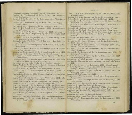 — 50 — • eiockener Brousson , Prinsengr . bij de Eeidschesfe700 . Cloribus ( J .) Voorburgwal bij de St . Jansslr . In Droogvrijen en Ver/waren . Cocheret de la Morinière ( J . D .) Prinsengr . bij de Weteringstr . Predikant . Cocurel < A .) Warmoesstr . bij de Kiezel , 864 . In Reeen - en Zonschermen . Cocx ( Wed . J . F .) Prinsengr . bij de LeidsohekVuisstr . 2527 . Coox ( F . H .) Singel bij de Torensteeg ,- 8016 . Commissionair in Effecten . Cocx ( C . J .) Rokin bij de Langebrugsteeg ^ 2221 . Juwelier . Coelewijn ( W ) O . Z . Kapelstecg bij den ïïieuwendijk , 1687 . In Kurken . Coenraadts ( J . M .) Kieuwendijk bij de Karnemelksteeg 1715 . Artsenijmenger en Drogist . Coenraads Geb . Wurfbain ( Wed .} Lauriergr . Ten huize van A . C . Zwerisz . Coers ( P . H .) N . Z . Voorburgwal bij de Kieuwstr . 1941 . Sch tenvoerdcr . Coers ( H . 0 .) Utrechtschestr . bij de Prinsengr . 6128 . Makelaar , Smid on Slotenmaker . Goèrten ( J .) kdrte Amstel bij de Groenenburgwal , boven 4183 . Courten ( J . S .) Bldemgr . hoek Baangr . Broodbakker . Coeverden ( J . S . van ) Nieuwmarkt bij de Dijkstr . 5 . In Krui - cfanierswarezi . ' t Coeverden ( Gebr . Diepenheim van ) Water voor de Koornbeurs . 1886 . In IJzerwaren en Kagchels . tiA*i & Coeverden ( J . van ) oude Waal , £ 674 . Zaakwaarnemer . Cohen ( Wed . L.A .) St . Amlhoniesbreestr . tusschen de Snoekjes - steeg en Zwanenburgwal , 3628 . Cohen da Silvo ( M .) Amstel bij de Weesperkerkstr . 4858 . Cohen ( J . S .) 0 . Z . Achterburgwal bij de Monnikkenstr . 703 . Leerlooijer . ',- i3?j > Cohen ( E . S.j Muiderslr . 5052 . Koopman in Rottingen en Splitter in de Loteryv Cohen Bessie ( R . IS .) Keizersgr . bij de Weesperstr . 6212 . Ma- kelaar en Koopman in Diamanten . Cohen Seelshon ( J . J .) eerste Weesperstr . In Spiegelglas . Cohen ( E . G . W .) Lauriergr . bij de Hazonstr . 989 . Cok ( J .) Nieuwmarkt bij de Koningstr . ' 80ST4 . ••*?» Tabak enz Cokart ( G . J .) Nes bij do Vischmarkt , 2091 . Banketbakker . Calac * Capadoce ( J ) Heerèngr . over het Park , 5084 . Commis - > sionait ' Hn Effecten . Calaco Ozorio ( D .) Keizersgr*bif de Weesperstr . 6517 . School- houder , v- ^/ Colder ( C .) Overtoom.StilleiiZijde f 227 . Slads-Boomkweeker . Colenbrander ( F . H . van Berck ) Keizersgr . bij de Heerenstl 5118 . Predikant . 51 Cöler ( J . W .) ïï . Z . Commissionair . Collaart ( D .) 0 . Z . Voorburgwal bij de Pieterjacobsstr . 1806 . iCollen ( M . S . van ) Keizersgr . bij de Leidscheslr . 2674 . IColose ( B .) N . Z . Voorburgwal boek van de St . Jacobstr . Zijs - tenmaker en Vergulder . Colijn ( S . M ) Spui hoek van de Handboogstr . Bank van Lee - ninghouder . fcommelin ( J .) Keizersgr . bij de Wolvenstr . 1125 . Notaris . Commelin en Weiland . Ten huize als boven . Notarissen . Commelin Jr . ( J .) Keizersgr . bij de Wolvenstr . 1124 . Notaris . Commerell ( J . G .) Singel bij de Beisteeg , 5006 . Vleesch - houwer . • Comte ( P . Ie ) Jlonnikenstr . 12 . | Comte (. . Ie ) Dtrechtschestr . bij de Heerèngr . 21 . Conradi ( J . M . Simon ) Heerèngr . bij de GasthuisruoIensfeeK . 5093 . Commissionair . Consen Adz . ( J .) TJtreohtschestr . bij de Prinsengr . 5839 . Win- kelier in Goud - en Zilverwerk . Content ( J . E .) St . Anthoniesbreestr . bij de Steenvoetsteeü- 5052 . Winkelier . °' Content ( 1 ). H .) Hoogslr . bij de St . Anthoniesbreestr . 3759 . Ih Behangselpapieren . ' Content ( E . H . C .) Hoogstr . bij de St . Anthoniesbreestr . 3647 . In Bohartgselpapieren . Content ( L . H .) oude Doelenstr . 1409 . In Behangselpapieren . Couvert ( H .) Bloemmarkt bij de Stilsteeg , ten huize van Albers . eool ( S .) Keizersgr . bij de Prinsenstr . 4183 . Commissionair . Cool en Zijtseaia , Keizersgr . tusschen de Heerenstr . en Brou- • wersgr . Betaaldag Donderdag . Coopman ( J .) Groenenburgwal over de Engelsche Kerk , 50 . Zaakwaarnemer . Ceropman ( II .) Weesperveld , 6270 . rCoopman , de Wit en Lenaertz , Singel bij'de Korsjospoortsteei *. Kargadoors . " Cooth ( C . J . van ) Heerèngr . schuins over de Warmoesgr . 42 * Med . Doctor . & Cooth ( J . F . van ) Heerc'ngr . bij de Warmoesgr . 5330 . Makelaar . Cooth ( A . B . van ) Ten huize als boven . '• Cpoth ( J . F . M . van ) op het Bagjjnh.of , 3722 . Schoolhouder . Cooth ( S . J . W . van ) Regt Boomsloot . Med . Doctor . Coppenaal ( H . Brouwer van ) Reguliersbreestr . 4877 . In Grut- terswaren . Coppenaal ( A . van ) Ten huize als boven . Coppenaal ( Gebr . van ) Singel bij de Huiszittensteeg . . Copraij ( J . F .) Haarlemmerdijk oyftr de Heerenmarkt , 5686 . Winkelier . 3 *