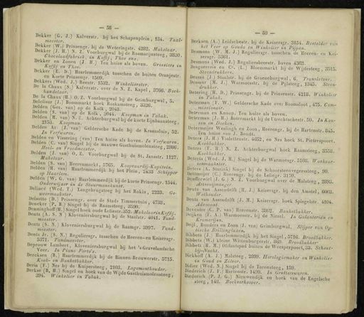 — 58 - Dakk ^ it . J0 KalVe " lr - h ' J he '^ Penple ; ni l 3 4 . TaaU ÏÏ : f7 -^ ri r 7 nsr v bi , ', d0 ^°' JW - 4282 . Makelaar . Dekker ( E ]) ) Haarlemmerdijk tussehen de buiten tatf ' Ka,Ver8lr - ° Ver de N - Z - *- P «», 3766 . * w *. ^^ Deden ( Gei . van ) op de Kolk , 2043 . Delden ( S . Tan ) op de Kolk w&L v jrt »» ^' t r&fi £? Geider8che Kad * »« - Kraanslul ,, 52 . Beld ^ r ) ^ WWSSJ I *> St . Jansstr . 1127 . op Haarlem . J n ' - 4AJ s ° ktpper Delden ( W . G . van ) Haarlemmerdijk bjjd<r korte Prinsen ,, - ir */ Onderwij f er in de Stuurmanskunlt . **»"»*&' « 44 . Dehncé ( Wed . T .) Langebrugsteeg bij het Rokin 2223 Ge weerntaakster . \, i ; ïï ïjBÏÏ "™> Ge - Delsotto ( D .) Prinsengr . over de Stads Timmertuin 4738 Deneker ( PB ) Singel b,j de Raamsteeg , 3590 ' Vetter '. ) Kl0Venler8bur 6 w '" gB de Staalslr . 4041 . laVd - ^ VelsteV KI <" eniersbur 6wal hu de Raamgr . 3997 . r a „ rf - -^ WfcUSató tUSSChen deH ^ n-en DeP Ve7r .^ ,? ^ 0 K Sr 1,UrgWal f het '^ ve.andsche " tlïfiS ? b « de *-«»* o ™ to . 5715 . Bcria ( F .) Nes bij de Kuipersteee . 2103 r/»ir*m«,#7 j TWLroo / p u ^ c - i r 7 &> * iuo . J^iOffememhouder .- • * A 3U?- wi,iï ££ ft ^" d0 W « de6 «^- Ie„.te ; g ) — 59 — Berksèn ( A .) Leidschestr , bij de Keizersgr . 3154 . Bestolder van het Veer op Gouda en Winkelier in Pijpen . besmons ( VV . M . J .) Keguliersgr . tuaschen de ïïeereh - en Kei- zersgr . 5361 . Desmons ( Wed . J .) Reguliersbreeslr . boven 4363 . Desguerrois en C ». ( L .) Bloemmarkt bij de Wijdesleep 3515 Steendrukkers . Dessau ( J ) Staalslr . bij de Groeneburgwal , 6 , Translaten,- D^ssaur ( M . J .) Warmocsstr . bij de Pijlsteeg , 1345 . Steen - J drukker . ■ Detering ( H . D .) Prinsengr . bij de Prinsenstr . 4218 . Winkelier % n Talalt . Determan ( F . W .) Geldersche Kade over Boomsloot , 475 . Com - . missionair . Determan en Knoop . Ten huize als Jboven . l}e*er.raan ( J . II .) Botermarkt bij de ( Ttrechfschestr . 50 . InKow sen en Doeken ., Determ'flijpr Weslingh en Zoon , Heerengr . bij de Hartenslr . 845 . <;\ en huize van J . Bondt . Deteri ( J . H ) Violettenslr . 4652 , en Nes hoek St . Picterspoort . Koekoaliker . r Deters ( P H ) N . Z . Achterburgwal hoek Raamslceg , 3558 . Koekbakkcr . De terts ( Wed . J . H .) Singel bij de Warmoesgr . 5108 . Waskaar- senmaakster . ffietera ( A . Starink ) Singel bij de Schoorsteenvegerssteeg , 90 . Dettmeijer ( C .) Heerengr . bij de Leliegr . 3170 . üeufferwiel ( J . G .) N . Z . Voorburgwal over de Molsleer , 2893 . i Artsenijmenger . "" Deutz van Asse.idelft ( ïï . J .) Keizersgr . bij den Amstel , 6003 . Wethouder . Deutz van Assendelft ( J . M .) Keizersgr . boek Spiegelstr . 4104 . Advocaat . Deventer ( C . P . van ) Heerenstr . 3802 . Banketbakker Denken ( F . A .) Wurmoesstr . bij de ' Niezel . % Galanterie » en Kramerjjon . Deijl Bunders en Zoon ( J . ven ) Grimburgwal . Slijper van Op- ■ lische Brillenglazen . * " ibbe ' s 0 . Haarlemmerdijk b,j het Singel , 5716 . Broodbakker . lhbbels ( W .) kleine Wiltenburgerstr . 869 . Broodbakker ■ b.bbetz ( H . M .) Olifantspad buiten de Weesperpoort,33 . Schout - bij-Nacht . ÏKckhoff ( A . J .) Holsteeg , 2899 . Horologiemaker en Winkelier m Goud en Zilver . Didier ( Wed . N .) Singel bij de Torensteeg , 159 . D.ederich ( J . F .) Hartenslr . 1490 . In Grutterswaren . Ihedench ( P J . G .) Niwwehdijk en hoek van de Engelsche steeg , 148 . Boekverkooper .