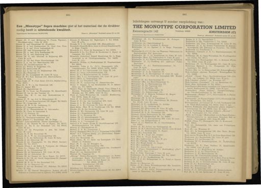 864 865 Inlichtingen ontvangt U zonder verplichting van : THE MONOTYPE CORPORATION LIMITED Een „ Monotype " Supra machine giet al het materiaal dat de drukker nodig heeft in uitstekende kwaliteit . Keizersgracht 142 Ingeschreven Handelsmerk MONOTYPE Telefoon 43606 Ingeschreven Handelsmerk MONOTYPE Minnen ( H . P . van ) Middenweg 75 . ( Voorm . Wgrmeer ). Hoofdonderwijzer . GlRo M 1816 . Minnen ( J . van ) Chasséstraat 49 . Kruidenier . Minnen ( J . A . van ) Oostzaanstraat 19 . Cond . Gem . Tram . Minnen ( J . A . van ) Pieter Lastmankade 42 . Minnen ( W . van ) Schaepmanstraat 85 . Minnen ( W . A . van ) Nova Zemblastraat 28 . Minnen ( W . A . van ; Stadionweg 258 . Minnen ( W . C . van ) Admiraal de Kuijterweg 300 . Giro M 2578 . Minnen ( A . van der ) Pieter NienwlandBtraat 164 . Minnen ( J . A . van der ) Bettevfierstraat 269 . Minners ( H .) Goudsbloemstraat 66 . Minnes ( J .) Willem de Zwijgerlaan 175 . Minnes ( R .) Boetonstraat 26 . Minnis ( A .) Ie Jan van der Heijdenstraat 104 . Minnis ( M .) Ploegstraat 75 . Minoli ( H . H .) Lnmeijstraat 58 . Giro M 1473 . Minor ( F . W .) Ferd . Bolstraat 212 . Eleclroteehnicus . Gtro M 1029 . Minor-Goede ( F . W .) Ferd . Bolstr . 212-214 . Strijkinrichtinq . Tel . 28371 . Minor ( G . F . W .) Ie Jan Steenstraat 140 . Mins ( I .) Amstel 302 . Minsek ( E .) Baphaëlstraat 18 . Minser ( H . L .) Groen van Prinstererstr . 85 . Rijwielhandel . Minsten ( D . van de ) den Teistraat 12 . Minsten ( Mej . M . C . van den ) Brederodestraat 2 . Costumier e . Minsten ( P . W . van den ) 2e Helmersstraat 25 . Minten ( J . W .) van Hogendorpstraat 196 . Kapper . Tel . 84415 . Minter ( W .) Schagerlaan 18 . Mintjens ( B . W . J .) St . Luoiënsteeg 11 . Mintjes ( C .) Campanulastraat 61 . Mintjes ( P . J .) Heemstedestraat 32 . Schoenmaker . Mintjes ( R .) Vasco da Gamastraat 8 . Miög ( C . J .) Texelweg 10 . Miog ( J . H .) van Helt Stocadestraat 6 . Miolee ( C .) Haarlemmermeerstraat 145 . Miolee ( Charles C .) Kanaalstraat 160 . 8e Etage . „ Mirado " Lederwarenfebriek . Nieuwe Amstelstraat 11 . Miranda ( A . de ) Damrak 84 . lm - en Export . Tel . 38777 . Miranda ( A . de ) 2e Jan Steenstraat 116 . Tel . 93812 . Giro M 977 . Miranda ( D de ) Weesperzijde 4 . Jrt ». Tel . 51540 . Giro M 1318 . Miranda ( G . F . de ) Riouwstraat 26 . Miranda ( H . G . W . de ) Linnaeasparkweg 180 . Miranda ( I . D . de ) Saffierstraat 59 . Giro M 6985 . Miranda ( J . de ) Jekerstraat 32 . Miranda ( J . de ) Olympiaplein 75 . Tel . 29318 . Kantoor : : Rokin 72 . Tel . 31777 . Miranda ( Firma J . de ) Rokin 6 . Vertegenw . der Vhlmann Brain Co ., Chicago . Tel . 81777 . Miranda ( J . de ) Uithoorn straat 87 . Miranda ( M . de ) Sarphatipark 188 . Giro M 785 . Miranda ( M . de ) Dintelstraat 28 . Miranda ( M . de ) Damrak 84 . Im-en Export . Tel . 33777 . Miranda en Co . ( M . de ) Daniël Stalpertstraat 30 . Diamant - zagerij . Tel . 22187 . Miranda ( M . G . de ) 2e Jan Steenstraat 115 . Miranda ( R . de ) Eemsstraat 25 . Miranda ( S . de ) van Breestraat 167 . Makelaar . Tel . 25812 . Giro M 1855 . Miranda ( S . de ) Damrak Beursgebouw . Kamers 42—48 . Makelaar en Commissioimair in Effecten . Tel . 45363 , 45502 Gezet in „ Monotype " Rockwell series 371 en 391 Miranda ( S . Rodrigues de ) Raphaëlplein 8 . Tel . 27649 . Giro M 4184 . Miranda ( S . S . de ) Amstelkade 126 . Diamantkloover . MirandoUe- Sleeswijk ( Mevr . Annie A .) Gerard Brandtstraat 6b . Ie Etage . Pianiste . Mirandolle ( L .) Commissie . Tel . 21273 . Mirandolle ( Lndovions ) Gerard Brandtstraat 6 *. Ie Etage . Geestelijke in de Christengemeenschap . Tel . 84883 . Giro M 1627 . Mirandolle (" Willem A .) Biesboschstraat 59 . Toonkunstenaar . Tel . 22816 . Mirandolle , Voute & Co . ( N.V .) Heerengracht 479 . Commissionnairs . Tel . 82866 , 37259 , 32735 , 35972 . Mirani ( H . J . L ) Valeriusstraat 115 . Giro M 716 . Mirani ( J .) Lanee Leidschedwarsslraat 113 . Mirani ( J . A .) Wilhelminastraat 22 . Schilder . Mirani ( Mej . J . L .) Keizersgracht 100 . Giro M 3128 . Mirani ( Mevr . L .) Keizersgracht 100 . Mirani ( P . A .) Postjeskade 198 . Mirani ( W . F .) Aalsmeerweg 83 . Diamantbewerker . Mirani & Bangma 2e van Swindenstraat 85 . In Automo- bielen enz . Tel . 62918 . Mirani's Piano - en Orgelhandel . ( Naaml . Venn .) Firma J . A . Busehen . Westermarkt 29 . Piano-Magazijn . Repareeren , Stemmen , enz . Tel . 49905 . Giro M 903 . Mirck ( J .) Saxen-Weimanlaan 54 . Complete Meubileering . Tel . 28705 . Giro M 2547 . Mirck ( P . E .) Schellingwouderdijk 101 . Misana ( J . F .) Jac van Lennepstraat 274 . Smid . Misana ( J . L . M .) Enge Kerktteeg 1 . Misana ( J . L . M .) Overtoom 95 . Giro M 1581 . Misch- Bollee ( Wed . W . L .) Vondelstraat 174 . Tel . 83346 . Mischke ( E .) 2e Jan Steenstraat 84 . Misdom ( C . M .) Oljmpiaweg 122 . Giro M 3737 . Misdom ( J .) Doggersbankstraat 6 Misdom ( J . J .) Sluisstraat 22 . Misdom ( M . J .) Admiralengracht 76 . Misdom ( M . T .) Rustenburgerstraat 298 . Misdorp ( A . J .) Voornestraat 15 . Misdorp & D . Snoeks ( Firma E .) Goudsbloemstraat 122 . Metaalwarenfabriek . Tel . 45845 . Misdorp ( J .) Dnivelandstraat 27 . Misdorp ( J . H . H .) Tumerstraat 7 . Miseroy-BückmanE ( Wed . Ch .) J . J . Viottastraat 1 8.Tel . 21801 Misset " ( N.V . Uitgevers Maatij . „ C .) ( Doetinchem ). Prinsen- gracht 911 . Tel . 84393 Misset ( G .) Riouwstraat 14 . Missët ( Herm . M . J .) Jacob van Lennepkade 175 . Huis . Schilder en Teekenaar . Misset ( W . F .) van der Helstpjein 8 . Misset ( W . F .) Amstel veenscheweg 160 . Misset & Co . ( Comni . Venn ) Heerengracht 154 . Groothandel in Dameshoeden enz . '\ el . 47886 . Missot ( J .) van Boetzelaerstraat 28 . Misticns ( B .) Vegestraat 24 . „ Mitropa " Midden-Europeesche Slaaprijtuigen - en Restau- ralierijluigen Maatij . Districtsdirectie voor Nederland : Stationsplein 1 . ( Centr . Station ) Kamer 44 . Tel . 49405 , 46023 Reisbureau : Leidschestraat 106-108 . Tel . 34502 , 37602 . Mittelberg ( A .) Bert