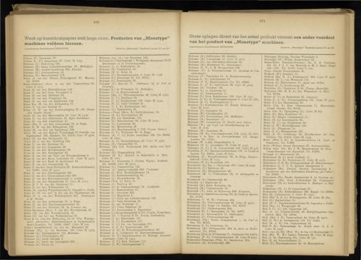 870 871 Werk op kunstdrukpapier stelt hoge eisen . Producten van „ Monotype " machines voldoen hieraan . Ingeschreven Handelsmerk MONOTYPE Gezet in „ Monotype " Rockwell series 371 en 391 Grote oplagen direct van het zetsel gedrukt vormen een ander voordeel van het product van „ Monotype " machines . Ingeschreven Handelsmerk MONOTYPE Gezet in „ Monotype " Rockwell series 371 en 391 Molema ( P .) Zaanstraat 76 . Molema Jr . ( P .) Langestraat 37 . Giro M 1055 . Moleman ( A .) Stadionweg 232 . Moleman ( H .) Lange Leidschedwarsstraat 69 . Melkslijter . Moleman ( H .) Amstelveenscheweg 934 . Kweeher . Moleman ( H .) Archimedesweg 54 . Moleman ( K .) Bestevaerstraat 119 . Molen ( A . van der ) Nienwe Prinsengracht 87 . Musicus . Tel . 55568 . MolenSchermer ( Mevr . A . van der ) VespuccÏBtraat 60 . Giro S 1577 . Molen ( B . van der ) Bilderdijkstraat 116 . Molen ( C . van der ) Corn . Troostplein 5 . Molen ( D . van der ) Delistraat 50 . Molen ( D . van der ) Ploegstraat 24 . Molen ( E . van der ) van Speijkstraat 153 . Molen Èzn . ( E . van der ) Adelaarsweg 77 . Molen ( P . van der ) Damrak 91 . Molen ( F . H . van der ) Rembrandtsplein 37—39 . Girant „ Set Gouden Hoofd ." Molen ( G . van der ) Mariotteplein 58 . Giro M 2536 . Molen ( G . van der ) Sikkelstraat 20 . Rijks-Ambtenaar . Molen ( G . van der ) Amstelstraat 47 . Molen ( Mej . G . van der ) Ambonstraat 19 . Ie Etage . Molen ( G . M . van der ) Rubensstraat ] 06 . Molen ( H . van der ) van Speijkstraat 108 . Molen ( H . van der ) Reijnier Vinkeleskade 78.Praktjjk : van Eeghenstraat 102 . Tandarts . Tel . 90170 . Giro M 4706 . Molen ( H . van der ) Rozengracht 52 . Molen ( H . J . van derl Hoofdweg 244 . Molen ( I . van der ) Delistraat 34 . Molen ( J . van der ) Graanstraat 48 . Molen ( J . van der ) Molnkkenstraat 68 . Muien ( J . van der ) Elandsgraoht 83 . Molen ( J . van der ) van Tuyll van Serooskerkenweg 6 . Molen ( J . van der ) Reyer Anslostraat 22 . Giro M 3271 . Molen ( J . van der ) Karel du Jardinstraat 39 . Molen ( J . van der ) Oostzanerdijk 19 . Molen ( J . van der ) Jacob Marisplein 33 . Kantoorboekhandel . Tel . 81369 . Giro M 3414 . Molen ( J . van der ) Lijnbaansgracht 584 . Molen ( J . van der ) Nieuwendamraerdijk 290 . Molen ( J . van der ) Zilverschoonstraat 4 . Schilder . Molen ( J . van der ) Raphaëlstraat 16 . Giro M 221 i . Molen ( J . J . H . van der ) Sluisstraat 11 . Molen ( L van der ) Willemsstraat 18 . Molen ( M . van der ) Wijsmullerstraat 21 . Brigadier v . Politie . Molen jr . ( M . van der ) 2e Jan van der Heijdenstraat 96 . Molen ( P . A . van der ) Westlandgracht 247 . Onderwijzer in de Muziek . Molen ( S . van der ) Ambonstraat 19 . Ie Etage . Molen ( S . van der ) Haarlemmermeerstraat 65 . Molen ( T . van der ) Delistraat 50 . In Groenten enz . MolenBrinkman ( Mevr T . van der ) Moerdijkstraat 42 . Molen ( Th . van der ) Woestdninstraat 49 . ■ Molen ( IJ . van der ) van Walbeeckstraat 32 . Molen & Co . ( van der ) Middenweg 14-16 . ( Vm . Watergr .meer ). Automobiel ', Rijwielhandelaren en Garagehouders . Radio-Toestellen . Tel . 53486 , 53487 . Giro M 700 . Molen's Leesbibliotheek ( van der ) Jac . Marisplein 33 . Molenaar ( Mej . A .) van Breestraat 138 . Giro M 1385 . Molenaar ( A .) Lijnbaansgracht 159 . Makelaar . Molenaar ( A .) Columbnsplein 39 . Molenaar ( A .) Jacob Catskade 8 . Molenaar ( A .) Jacob van Lennepkade 360 . Molenaar ( A .) Omval 41 . Molenaar Azn . ( A .) van Breestraat 138 . Molenaar ( A .) Visseringstraat 1 . Werkplaats : Boomstraat 75-79 Steenhouwer en in Grafmonumenten . Molenaar ( A . J .) Stadionplein 14 . Molenaar ( B .) Vondelstraat 43 . Molenaar ( B . J .) Rokin 61 . Molenaar ( C .) Borssenburgerplein 5 . Giro M 1198 . Molenaar ( C .) Jekerstraat 55 . Tel . 23731 . Molenaar ( C .) Zwanenplein 83 . Molenaar ( C .) Mosveld 27 . Ambtenaar bij de Post en Telegrafie . Molenaar ( C .) de Wittenkade 15 . Melkslijter . Molenaar ( C .) 2e Breeuwersstraat 5 . Molenaar ( Mej . C .) Wijttenbachstraat 49 . Giro , M 2707 . Molenaar ( C . C .) Balistraat 83 . Molenaar ( C . J .) Sarphatistraat 120 . Giro M 2542 . Molenaar ( C . J .) Jacob Catskade 21 . Molenaar ( C . J . R .) Hudsonstraat 147 . Molenaar ( D .) Fazantenweg 85 . Molenaar — Pronk ( Mevr . E .) Galileïplantsoen 15 . Molenaar ( E . K .) Houtrijkstraat 98 . Molenaar ( F .) von Zesenstraat 116 . Molenaar ( G .) Herculesstraat 56 . Giro M 3250 . Molenaar ( G .) Lntmastraat 94 . Molenaar ( G .) Meteorenweg 49 . Molenaar ( G .) Haarlemmerweg C 316 . ( Voorm . Sloten .) Molenaar ( G . C .) Waalstraat 88 . 3e Etage . Molenaar ( G . C . C .) Zuider Amstellaan 108 . Tel . 29562 . • Giro M 1820 . Molenaar ( G . J .) Heemstedestraat 43 . Giro M 3581 . Molenaar ( H .) Oostzanerdijk 81 . Molenaar ( H .) O.Z . Voorburgwal 235 . Atelier voor Reel . ontwerpen . Molenaar ( H .) Heggerankweg 138 . Molenaar ( H . H .) Henriek de Keijserplein 4 . Huis . Giro M 1161 . Molenaar ( J .) Nieuweweg 2 . ( Voorm . Wgrm .) Architect . Tel . 50429 . Giro M 3012 . Molenaar ( J .) Vespuccistraat 124 . Molenaar ( J .) Spaarnwouderdqk 645 . Veehouder . Molenaar ( J .) Fred . Hendrikplantsoen 24 . Molenaar ( J .) Hoekschewaardweg 56 . Molenaar ( J .) Heemstedestraat 54 . Molenaar ( Wed . J .) Rokin 81 . Molenaar ( J .) Texelweg 58 . Molenaar ( J .) 3e Oosterparkstraat 72 . Loodgieter . Molenaar ( J .) Reanmurstraat 47 . Molenaar ( 3 .) Overtoom 522 . Molenaar ( J .) Maanstraat 8 . Molenaar ( J .) Gillis van Ledenberchstraat 128 . Molenaar ( J .) Oude-IJselstraat 42 . Molenaar ( J .) van Neckstraat 17 . Molenaar ( J ) Frans Halsstraat 62 . Molenaar ( J .) Jeroenensteeg 2 . Timmerman . Molenaar ( J .) Durgerdammerdijk B 7\b . ( Voorm . Durgerdam ). Molenaar ( J .) ' t Nopeind B 25 . ( Voorm . Zunderdorp .) Molenaar ( J . A .) Mauri tskade 101 . Molenaar ( J . C .) Rnysdaelkade 257 . Molenaar ( J . C .) Jac . van Lennepkade 271 . Molenaar ( J . F . H ) Kometensingel 129 . Molenaar ( J . H .) 3e Wittenburgerdwarsstraat 80 . Molen