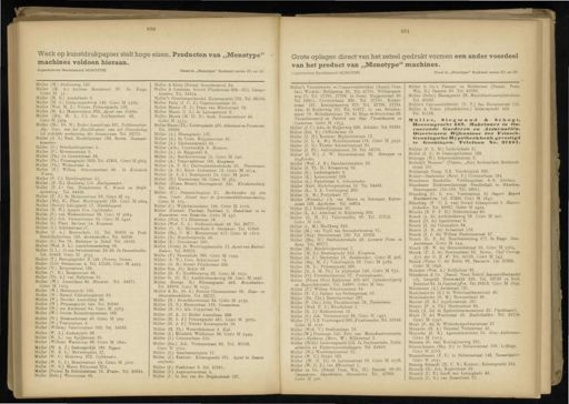 890 891 Werk op kunstdrukpapier stelt hoge eisen . Producten van „ Monotype " machines voldoen hieraan . Ingeschreven Handelsmerk MONOTYPE Gezet in „ Monotype " Rockwell series 371 en 391 Grote oplagen direct van het zetsel gedrukt vormen een ander voordeel van het product van „ Monotype " machines . Ingeschreven Handelsmerk MONOTYPE Gezet in „ Monotype " Rockwell series 371 en 391 Muller ( M .) Stadionweg 188 . Muller ( M . A .) Andreas Bonnstraat 30 . 2e . Etage . Giro M 31 . Muller ( M . G .) Amstelkade 9 . Muller ( M . J .) Linnaeusparkweg 146 . Giro M 2387 . Maller ( Wed . M . J .) Nieuwe Prinsengracht 120 . Muller ( M . K .) Meeuwenlaan 203 . Agent van Politie . Muller ( Mej . M . L . C .) Jan Luykenstraat 42 . Giro M 3304 Muller ( Mr . Dr . N .) Zuider Amstellaan 201 . Politierechter . ■ dig . Seer , van het Hoofdbestuur van het Genootschap tot zedelijke verbetering der Gevangenen . Tel . 22773 . Muller ( N . J .) Fred . Hendrikstraat 183 . Boven . Diamantbewerker . Muller ( O .) Schollenbrugstraat 3 . Muller ( P .) Mcrcatorstraat 3 . Muller ( Ph .) Ie Conradstraat 22 . Muller ( Ph .) Prinsengracht 1039 . Tel . 47901 . Giro M 3865 . Muller ( Ph .) Wodaostraat 4 . Muller ( P .) Willem Schoutenstraat 40 . In Koloniale Waren . Muller ( P . C .) Hernbrngstraat 51 . Muller ( P . H .) Hoofdweg 115 . Horlogemaker . Muller ( P . J.1 Ger . Brandtstraat 8 . Watch en Stryk inrichiing . Tel . 84485 . Muller ( P . J .) 3e Helmersstraat 32 . Giro M 23 . Muller ( Mej . R .) Plant . Muidergraeht 129 . Giro M 2604 Muller ( Reinie ) Lelirgracht 17 . Handelsagent . Muller ( R . W .) Amstel 31 *. Caféhouder . Muller ( S .) van Walbeeckstraat 88 . Gmo M 3684 . Muller ( S .) Joh . Vermeerstraat 65 . Giro M 2491 . Muller ( S .) Plant . Ba liaan 14 . Koopman . Muller ( S .) Scheldestraat 57 . Muller ( S . A .) Bentinckstr . 18 . Tel . 80626 en Fred . Hendrikplantsoen 106 . Banketbakker . Tel . 85039 . Muller ( S .) Nes 78 . Makelaar in Tabak . Tel . 49580 . Muller ( Wed . S . L .) Amstelveenscheweg 56 . Muller ( S . L .) Ie van Swindenstraat 23-25 . InDameshoeden . Tel . 50462 . Giro M 3655 . Muller ( T .) Baarsjespolder D 149 . ( Voorm . Sloten ). Muller ( Tob ) Grensstraat 4 . Tel . 51523 . Giro M 4493 . Muller ( V .) K-uipersstraat 168 . Muller ( V . H .) Borgerstraat 46 . Muller ( Th . A .) van Hallstraat 91 . Muller ( W .) Amstellaan 95 . Bloemist . Tel . 24871 . Giro M 1105 . Muller ( W .) Heerengra'ht 162 . Muller ( W .) Gerard Callenburgstraat 69 . Muller ( W .) Noorder Amstellaan 96 . Muller ( W .) Prinsengracht 544 . Tel . 30840 . Muller ( W .) ten Kates traat 84 . Giro M 2763 . Muller ( W .) Groote Kattenburgeratraat 162 . Muller ( W .) Biesboschstraat 40 . Giro M 309 . Maller ( W .) Toministraat 4 . Muller ( Willem ) Valeriusstraat 252 . Tel . 24026 . Muller ( W . A .) Ambonpleiu 26 . Muller ( W . L .) van Speijkstraat 95 . Muller ( Willem ) Waalstraat 86 . Giro M 1800 . Muller ( W . A . f .) Zeeburgerdijk 160 . Tapper . Maller ( W . B . L .) Merwedeplein 27 . Muller ( W . C .) Sloterweg 372 . Caféhouder . Muller ( W . C . J .) Bonaire8traat 54 . Giro M 3607 . Muller ( W . G .) Marco Polostraat " 274 . Muller ( Firma ) 8e Schinkelstraat 18 . Kruier . Tel . 26634 . Muller ( Gebr .) Waverstraat 62 . Muller & Klein ( Firma ) Groenburgwal 24 . Muller & Landman . Govert Flinckstraat 309—311 . Garagehouders . Tel . 28614 . Muller's Gloeilampeahandel Keizersgracht 753 . Tel . 86193 . Muller Felix ( J . C . J .) Copernicuastraat 51 . Muller Massis ( F . J .) Frans van Mierisstraat 78 . Muller Massis ( J . J .) de Lairessestraat 3 . Muller Massis ( M . IJ . D .) Bosb . Toussaintstraat 49 . Giro M 3535 . Muller Massis ( Th .) Keizersgracht 460 . Advocaat en Procureur . Tel . 86689 . Muller ( A .) Bloemgracht 127 . Muller ( A .) 2e Const . Hnijgensstraat 67 . Muller ( A .) Lijnbaansgracht 88 . Muller ( Alb .) Nieuwendijk 3 . Monteur . Muller ( A .) de Rijpgracht 3 . Muller ( A .) Beethovehstraat 15 . Giro M 696 . Muller ( A .) Transvaalstraat 108 . Koopman . Muller ( A . F . G .) Tel 43514 . Muller ( C .) Paramariboplein 57 . Boekhouder bij den Gem . Centr . Dienst voor de Levensmiddelenvoorziening . Giro M 179 . Muller ( C .) Wilhelminastraat 194 . Giro M 1116 . Muller ( Conrad ) Plantage Parklaan 1 . Bandelaar in en Reparateur van Rijwielen . Giro M 552 . Muller ( Wed . C .) Diezestraat 19 . Muller ( Wed . C . A .) Stadhouderskade 49 . Tel . 20777 . Muller ( C . G .) Mercatorkade 8 . Stucadoor . Tel . 81949 . Muller ( Mej . C M.ï Marnixstraat 417 . Giro M 1812 . Muller ( E .) Reguliersgracht 49 . Muller ( E .) Dintelstraat 108 . Muller ( Erich ) 2e Weteringplantsoen 17 . Agent van Buitenl . Huizen . Tel . 136073 . Muller ( F .) Nassaukade 388 . Giro M 1944 . Muller iP . W .) Corn . Schuytstraat 16 . Maller ( G . B .) Govert Flinckstraat 224 MOller Gzn . ( G .) Rokin 66 Maller ( G . F .) Hoofddorpweg 28 . Giro M 1031 . Muller Jr . ( G . H .) Amstelveenscheweg 59 . Giro M 2026 Muller ( George H .) Prinsengracht 458 . Broodbakker . Tel . 32689 . Giro M 1131 . Muller & Zn . ( G . J .) Reinier Claeszenstraat 86 . Huis - en Décoratieschïlders . Tel . 88717 . Muller ( H .) Bronckhorststraat 84 . Giro M 3139 , Muller ( H . G .) Elandsstraat 178 . Timmerman . Mttller ( H . G .) Alb . Cuypstraat 94 . Muller ( B . A . J .) Zuider Amstellaan 282 . Muller ( H . J . J ) Prinsengracht 461 . Giro M 3079 . Muller ( H . J . J .) Nieuwe Keizersgracht 18 . Maller ( H . Ph .) Westerdokstrant 4 Kok . Muller ( J .) Elisabeth Wolffstraat 89 . Giro M 2449 . Mailer ( J .) Ceintuurbaan 310 . Muller ( Jac .) Joh . Vermeerstraat 69 . Tel . 90182 . Giro M 3692 . Maller ( J .) Haarlemmerplein 17 . Maller ( J .) Kantoor : Keizersgracht 231 . Agent in Dames confectie . Muller ( J .) Slaakstraat 3 . Tel . 27891 . Muller ( J .) Argonautenstraat 4 . Muller ( J .) Ie Jan van der Heijdenstraat 127 . Muller's Vleeschwaren en Conservenfabrieken ( Naaml . Venn . Jac .) Winkels : Heiligeweg 30 . Tel . 47701 . Willemsparkweg71