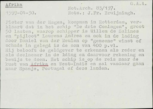Stadsarchief Amsterdam, archieftoegang 30452, Archief van Simon Hart: (gedeeltelijke) toegang op de notariële archieven, inventarisnummer 351, Regesten van akten in de Amsterdamse notariële archieven en enige andere bronnen. 1578 - ca. 1800, Collectie Hart', 'H' of 'hoofdsysteem'. Regesten geordend op trefwoord. 1578 - 1700, 1711 - ca. 1800, Aardrijkskundige namen, Afrika - Grand Lahou