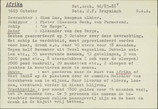 Afrika Not.Arch. 96/85-88v 1603 October Nots. J.F. Bruyningh G.A.A Bevrachter : Sion Lus, koopman alhier. Schipper : Pieter Claessen Neck, van Purmerend. Schip : "de Hoope". Reder : Alexander van den Berge. Hebben geaccordeerd op 3 October over deze bevrachting. Het schip is verdubbéld, moet geproviandeerd worden voor kost, drank e.a. voor 40 eters voor 18 maanden. Tegen half November uit Texel wegzeilen. Dubbele zei- len etc., 35 zeevarende mannen, 12 gotelingen, 2 van 3000 pond etc., 8 steenstukken (ook voor de sloepen) 2000 pond buskruit, 20 musketten etc., 2 sloepen of jachten in kwartieren mede te nemen. Route : met goederen naar de kust van Afrika of West Indië op de plaatsen door de commies Melchior van Kerckhoven aan te wijzen. Naar Livorno of elders, los- sen, eventueel verder in dienst blijven. Vrachtprijs : per maand 1800 gulden voor 14 maanden vast, tot 24 maanden toe. De 5 personen die namens de be- vrachter medegaan zullen passagevrij zijn en de kost en drank in de kajuit vrij hebben.