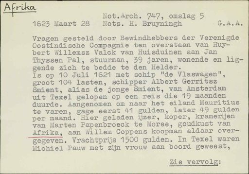 Afrika Not.Arch. 747, omslag 1 G. A.A. 1623 Maart 28 Nots. H. Bruyningh Vragen gesteld door Bewindhebbers der Verenigde Oostindische Compagnie ten overstaan van Huy- bert Willemsz Valck van Huisduinen aan Jan Thyssen Pal, stuurman, 39 jaren, wonende en lig- gende zich te bedde te den Helder. Is op 10 Juli 1621 met schip "de Vlaswagen" groot 104 lasten, schipper Albert Gerritsz Smient, alias de jonge Smient, van Amsterdam uit Texel gelopen op een reis die 19 maanden duurde. Aangenomen om naar het eiland Mauritius te varen, gage eerst 41 gúlden, later 49 gulden per maand. Hier geladen ijzer, koper, kramerijen van Marten Papenbroeck te Moree, goudkust van Afrika, aan Willem Coppens koopman aldaar over- gegeven. Vrachtprijs 1500 gulden. In Texel waren Michiel Pauw met zijn vrouw aan boord geweest, Zie vervolg