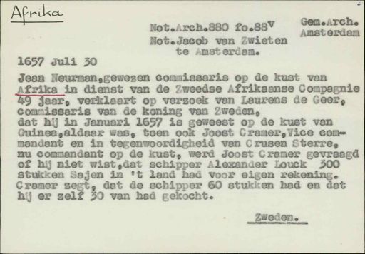 Stadsarchief Amsterdam, archieftoegang 30452, Archief van Simon Hart: (gedeeltelijke) toegang op de notariële archieven, inventarisnummer 351, Regesten van akten in de Amsterdamse notariële archieven en enige andere bronnen. 1578 - ca. 1800, Collectie Hart', 'H' of 'hoofdsysteem'. Regesten geordend op trefwoord. 1578 - 1700, 1711 - ca. 1800, Aardrijkskundige namen, Afrika - Grand Lahou