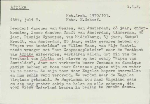G.A.A Afrika Not.Arch. 1370/101. Nots. H.Schaef. 1664, juli 7. Leendert Jacques van Ceulen, van Amsterdam, 28 jaar, onder- kommies, Isaac Jacobss Craft van Amsterdam, timmerman, 38 jaar, Dionijs Wyboutss, van Middelburg, 63 jaar, Samuel proodt, van Amsterdam, 25 jaar, welke gevaren hebben op "Wapen van Amsteldam" en Willem Mann, van Nije Castel, reeds vroeger met "het Coopmansplaisier" naar de Westkust van Afrika uitgevaren, verklaren allen, dat zij van de Westkust van Afrika met slaven op het schip "Wapen van Amsteldam", door een verkeerde koers Curacao en Iamaique gemist hebben en toen naar Caimarias gegaan zijn om water in te nemen. Ze zijn toen door Engelse kapers overvallen en hun schip werd veroverd. Ze werden naar de Engelse Virginas gebracht. De Engelsman zou naar Engeland gaan om een nog groter schip te halen om alle schepen, die voor Nieuw Nederland kwamen in beslag te kunnen nemen.
