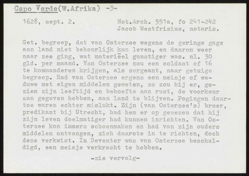 -3- Capo Verde (W.Afrika) Not.Arch. 551a, fo 241-242 1628, sept. 2. Jacob Westfrisius, notaris. Get. begreep, dat van Osterzee wegens de geringe gage aan land niet behoorlijk kon leven, en daarom weer naar zee ging, wat materiëel gunstiger was. nl. 30 gld. per maand. Van Osterzee zou een soldaat of 16 te kommanderen krijgen, als sergeant, naar getuige begreep. Had van Osterzee ergens een meisje of we- duwe met eigen middelen geweten, zo zou hij er, ge zien zijn leeftijd en behoefte aan rust, de voorkeur aan gegeven hebben, aan land te blijven. Pogingen daar toe waren echter mislukt. Zijn (van Osterzee's) broer, predikant bij Utrecht, had hem er op gewezen dat hij zijn leven doelmatiger had kunnen inrichten. Van Os- terzee kon immers schoenmaken en had van zijn ouders middelen ontvangen, zich daarote in te richten, doch deze verkwist. In Deventer was van Osterzee beschul- digd, een meisje verkracht te hebben. -zie vervolg-