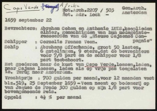 Stadsarchief Amsterdam, archieftoegang 30452, Archief van Simon Hart: (gedeeltelijke) toegang op de notariële archieven, inventarisnummer 352, Regesten van akten in de Amsterdamse notariële archieven en enige andere bronnen. 1578 - ca. 1800, Collectie Hart', 'H' of 'hoofdsysteem'. Regesten geordend op trefwoord. 1578 - 1700, 1711 - ca. 1800, Aardrijkskundige namen, Kaapverdische eilanden - Noord-Amerika/chronologie Ver.Staten 1649
