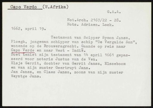 Stadsarchief Amsterdam, archieftoegang 30452, Archief van Simon Hart: (gedeeltelijke) toegang op de notariële archieven, inventarisnummer 352, Regesten van akten in de Amsterdamse notariële archieven en enige andere bronnen. 1578 - ca. 1800, Collectie Hart', 'H' of 'hoofdsysteem'. Regesten geordend op trefwoord. 1578 - 1700, 1711 - ca. 1800, Aardrijkskundige namen, Kaapverdische eilanden - Noord-Amerika/chronologie Ver.Staten 1649