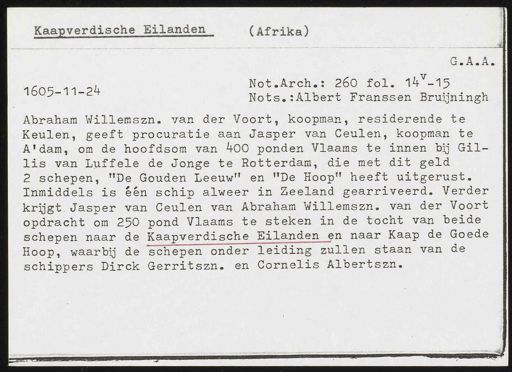 Kaapverdische Eilanden (Afrika) G.A.A Not.Arch.: 260 fol. 14v-15 1605-11-24 Nots.: Albert Franssen Bruijningh Abraham Willemszn. van der Voort, koopman, residerende te Keulen, geeft procuratie aan Jasper van Ceulen koopman te A'dam, om de hoofdsom van 400 ponden Vlaams te innen bij Gillis van Luffele de Jonge te Rotterdam, die met dit geld 2 schepen, "De Gouden Leeuw" en "De Hoop" heeft uitgerust. Inmiddels is één schip alweer in Zeeland gearriveerd. Verder krijgt Jasper van Ceulen van Abraham Willemszn. van der Voort opdracht om 250 pond Vlaams te steken in de tocht van beide schepen naar de Kaapverdische Eilanden en naar Kaap de Goede Hoop, waarbij de schepen onder leiding zullen staan van de schippers Dirck Gerritszn. en Cornelis Albertszn.