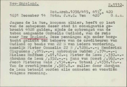 Stadsarchief Amsterdam, archieftoegang 30452, Archief van Simon Hart: (gedeeltelijke) toegang op de notariële archieven, inventarisnummer 358, Regesten van akten in de Amsterdamse notariële archieven en enige andere bronnen. 1578 - ca. 1800, Collectie Hart', 'H' of 'hoofdsysteem'. Regesten geordend op trefwoord. 1578 - 1700, 1711 - ca. 1800, Aardrijkskundige namen, New England - New York de stad