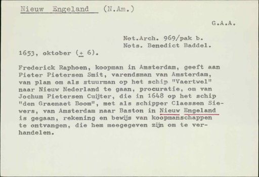 Stadsarchief Amsterdam, archieftoegang 30452, Archief van Simon Hart: (gedeeltelijke) toegang op de notariële archieven, inventarisnummer 358, Regesten van akten in de Amsterdamse notariële archieven en enige andere bronnen. 1578 - ca. 1800, Collectie Hart', 'H' of 'hoofdsysteem'. Regesten geordend op trefwoord. 1578 - 1700, 1711 - ca. 1800, Aardrijkskundige namen, New England - New York de stad