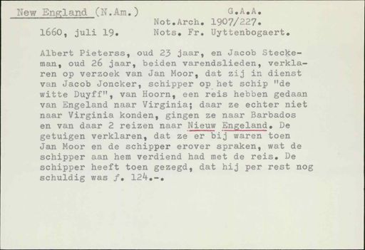 G. A.A. New England (N.Am.) Not.Arch. 1907/227. Nots. Fr. Uyttenbogaert. 1660, juli 19. Albert Pieterss, oud 23 jaar, en Jacob Stecke- man, oud 26 jaar, beiden varendslieden, verkla- ren op verzoek van Jan Moor, dat zij in dienst van Jacob Joncker, schipper op het schip "de witte Duyff", van Hoorn, een reis hebben gedaan van Engeland naar Virginia; daar ze echter niet naar Virginia konden, gingen ze naar Barbados en van daar 2 reizen naar Nieuw Engeland. De getuigen verklaren, dat ze er bij waren toen Jan Moor en de schipper erover spraken, wat de schipper aan hem verdiend had met de reis. De schipper heeft toen gezegd, dat hij per rest nog schuldig was f. 124.-.