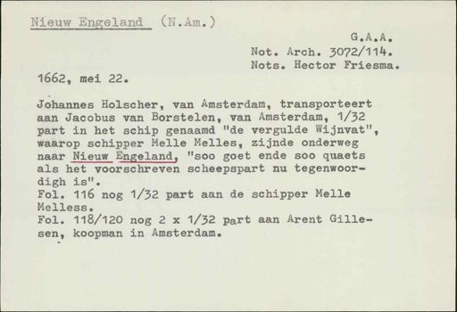Stadsarchief Amsterdam, archieftoegang 30452, Archief van Simon Hart: (gedeeltelijke) toegang op de notariële archieven, inventarisnummer 358, Regesten van akten in de Amsterdamse notariële archieven en enige andere bronnen. 1578 - ca. 1800, Collectie Hart', 'H' of 'hoofdsysteem'. Regesten geordend op trefwoord. 1578 - 1700, 1711 - ca. 1800, Aardrijkskundige namen, New England - New York de stad
