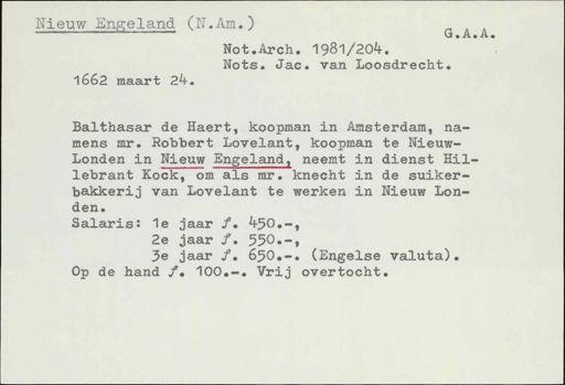 Stadsarchief Amsterdam, archieftoegang 30452, Archief van Simon Hart: (gedeeltelijke) toegang op de notariële archieven, inventarisnummer 358, Regesten van akten in de Amsterdamse notariële archieven en enige andere bronnen. 1578 - ca. 1800, Collectie Hart', 'H' of 'hoofdsysteem'. Regesten geordend op trefwoord. 1578 - 1700, 1711 - ca. 1800, Aardrijkskundige namen, New England - New York de stad