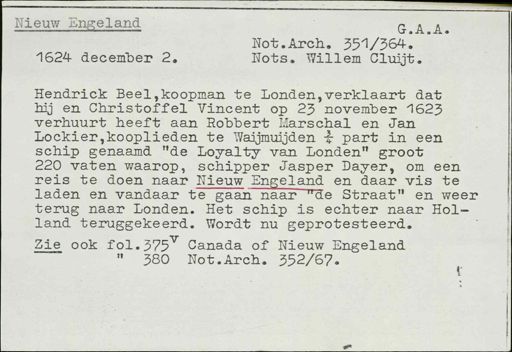 Stadsarchief Amsterdam, archieftoegang 30452, Archief van Simon Hart: (gedeeltelijke) toegang op de notariële archieven, inventarisnummer 358, Regesten van akten in de Amsterdamse notariële archieven en enige andere bronnen. 1578 - ca. 1800, Collectie Hart', 'H' of 'hoofdsysteem'. Regesten geordend op trefwoord. 1578 - 1700, 1711 - ca. 1800, Aardrijkskundige namen, New England - New York de stad
