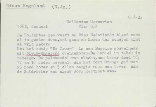 Stadsarchief Amsterdam, archieftoegang 30452, Archief van Simon Hart: (gedeeltelijke) toegang op de notariële archieven, inventarisnummer 358, Regesten van akten in de Amsterdamse notariële archieven en enige andere bronnen. 1578 - ca. 1800, Collectie Hart', 'H' of 'hoofdsysteem'. Regesten geordend op trefwoord. 1578 - 1700, 1711 - ca. 1800, Aardrijkskundige namen, New England - New York de stad