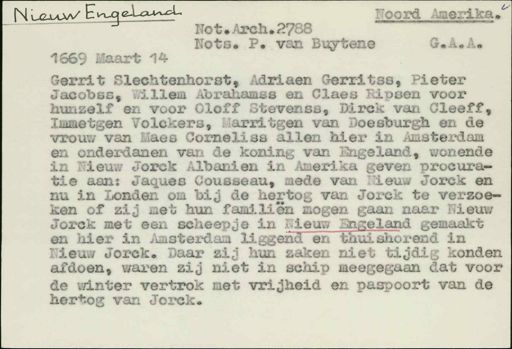 Stadsarchief Amsterdam, archieftoegang 30452, Archief van Simon Hart: (gedeeltelijke) toegang op de notariële archieven, inventarisnummer 358, Regesten van akten in de Amsterdamse notariële archieven en enige andere bronnen. 1578 - ca. 1800, Collectie Hart', 'H' of 'hoofdsysteem'. Regesten geordend op trefwoord. 1578 - 1700, 1711 - ca. 1800, Aardrijkskundige namen, New England - New York de stad