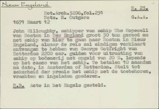 Stadsarchief Amsterdam, archieftoegang 30452, Archief van Simon Hart: (gedeeltelijke) toegang op de notariële archieven, inventarisnummer 358, Regesten van akten in de Amsterdamse notariële archieven en enige andere bronnen. 1578 - ca. 1800, Collectie Hart', 'H' of 'hoofdsysteem'. Regesten geordend op trefwoord. 1578 - 1700, 1711 - ca. 1800, Aardrijkskundige namen, New England - New York de stad